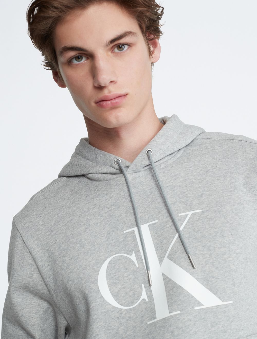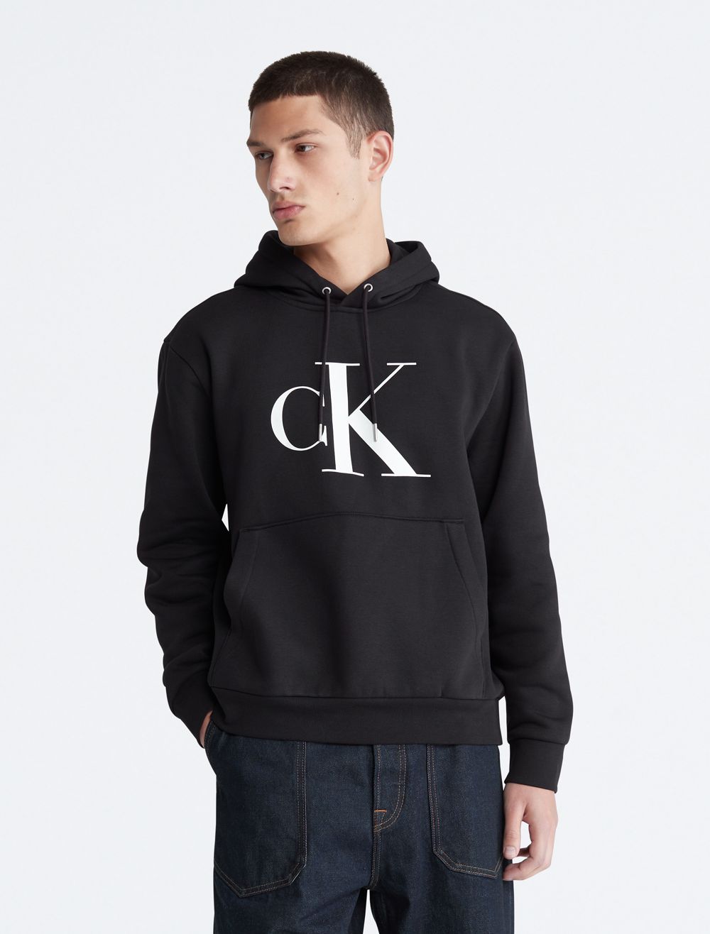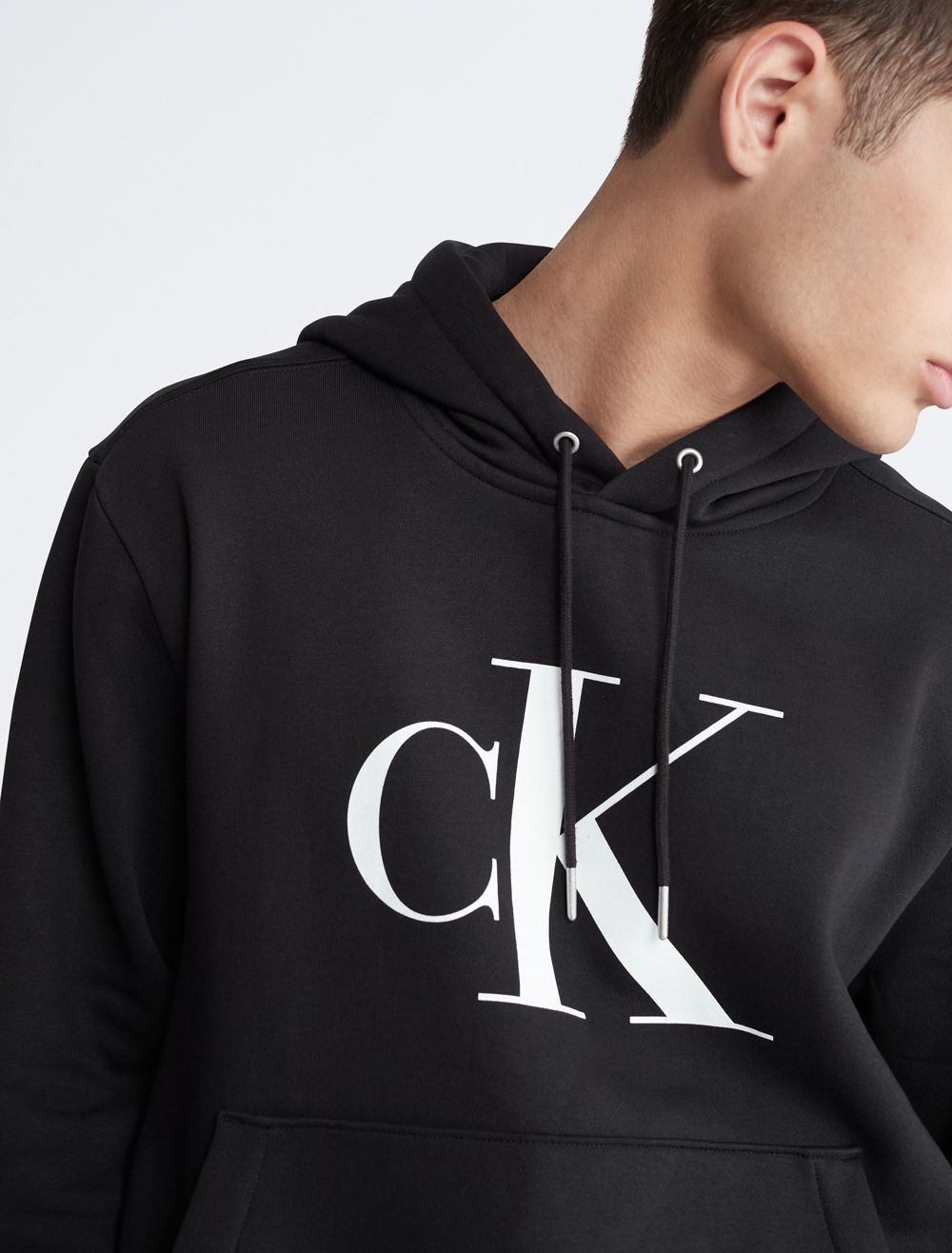 A casual essential, this hoodie features CK monogram logo styling at the chest. Designed with long sleeves and a kangaroo pocket at the front. Crafted from a plush cotton blend for super soft comfort.- Long sleeves + crossover hood