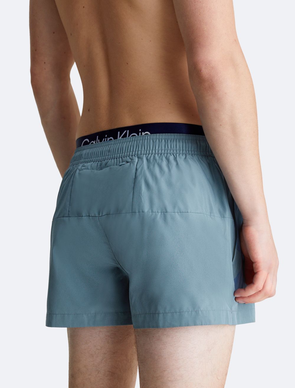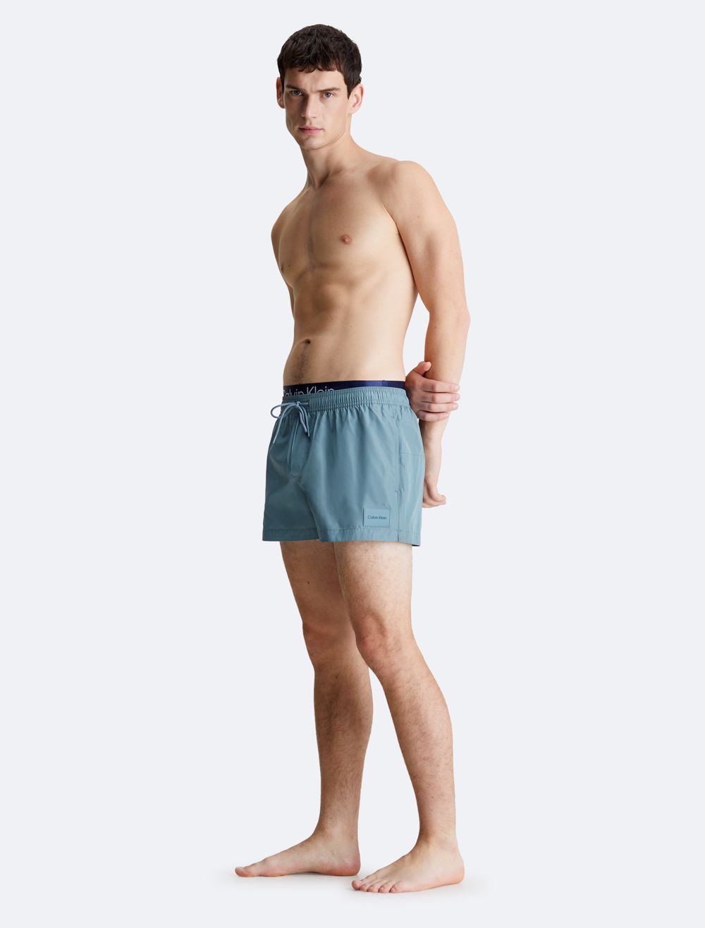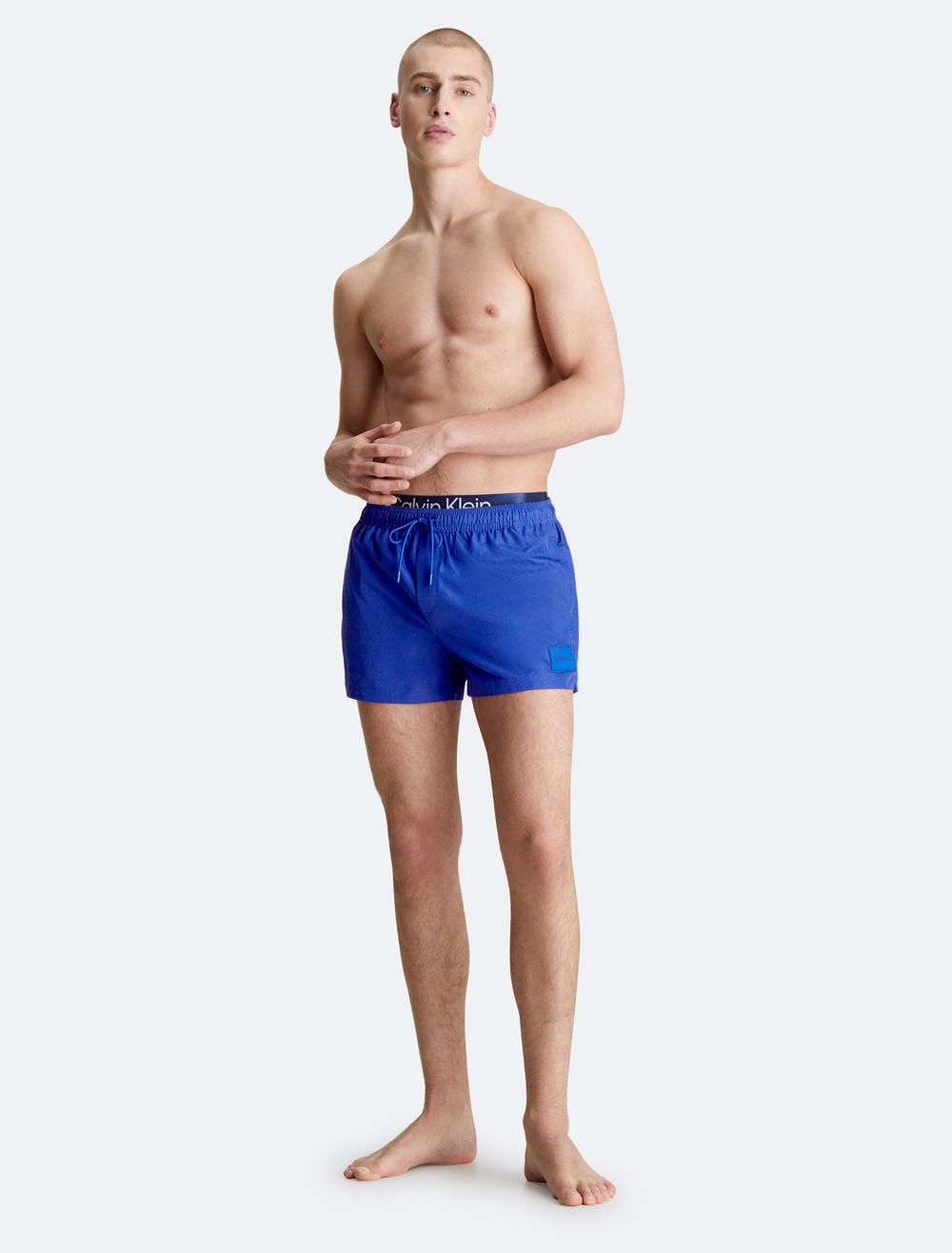 Crafted completely from recycled polyester, these swim shorts are made with reduced environmental impact. Designed with a double waistband and a drawstring closure. Features slip pockets at the sides and detailed with Calvin Klein logo styling at the waist.- Double waistband styling