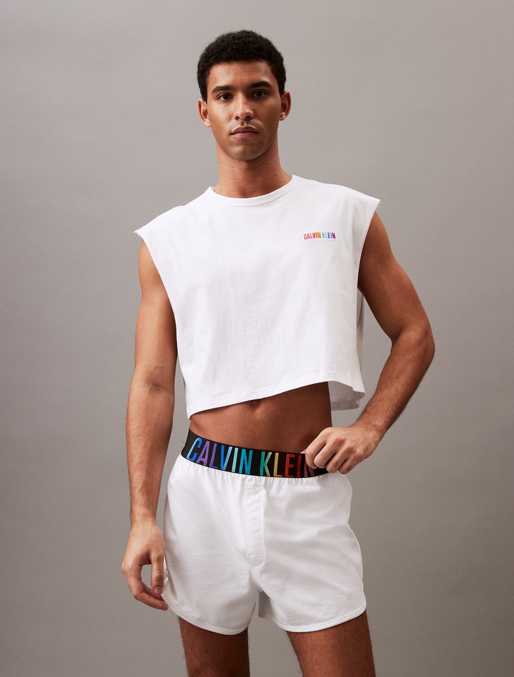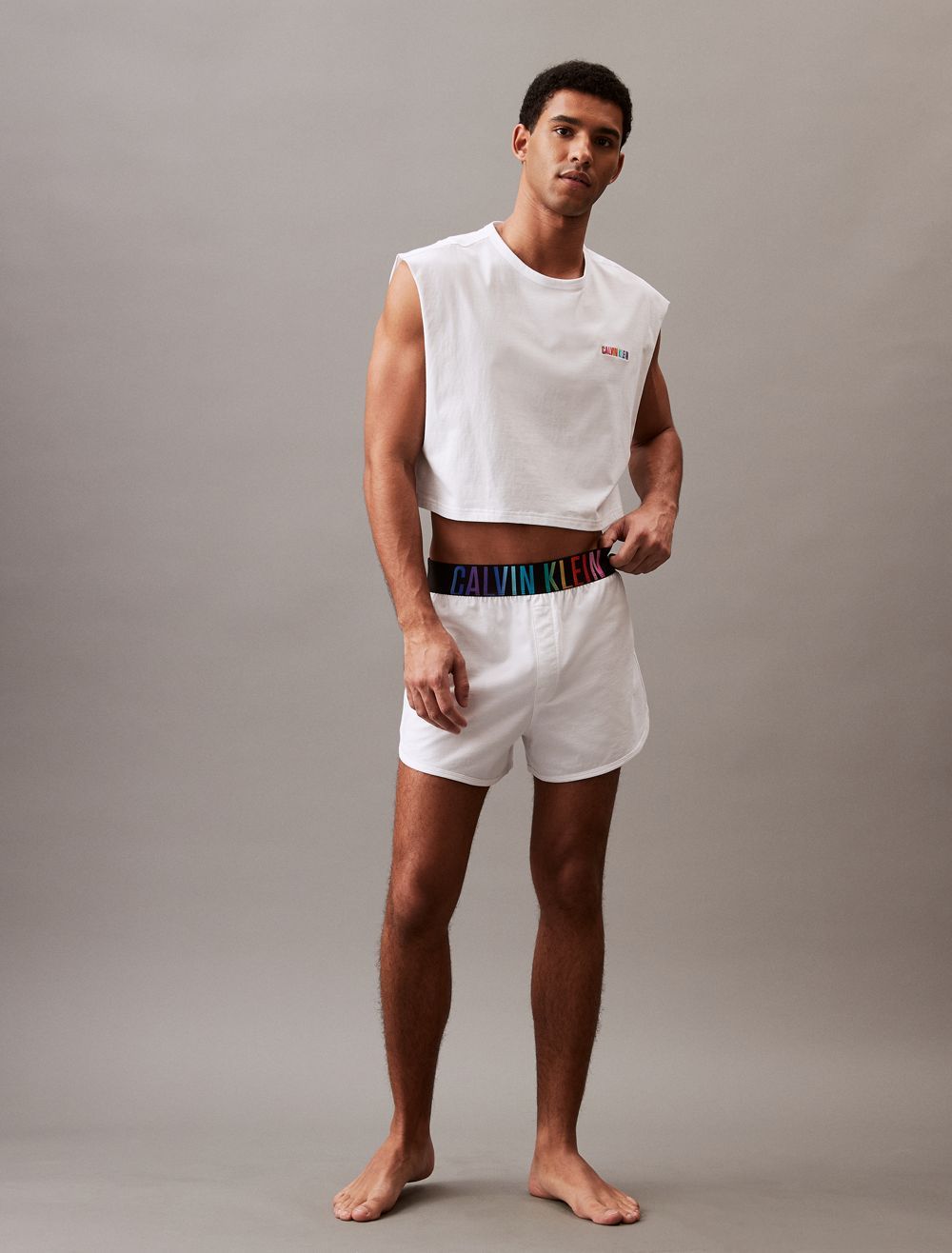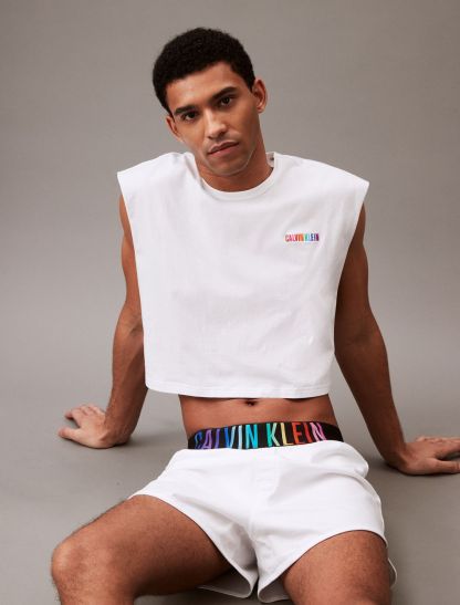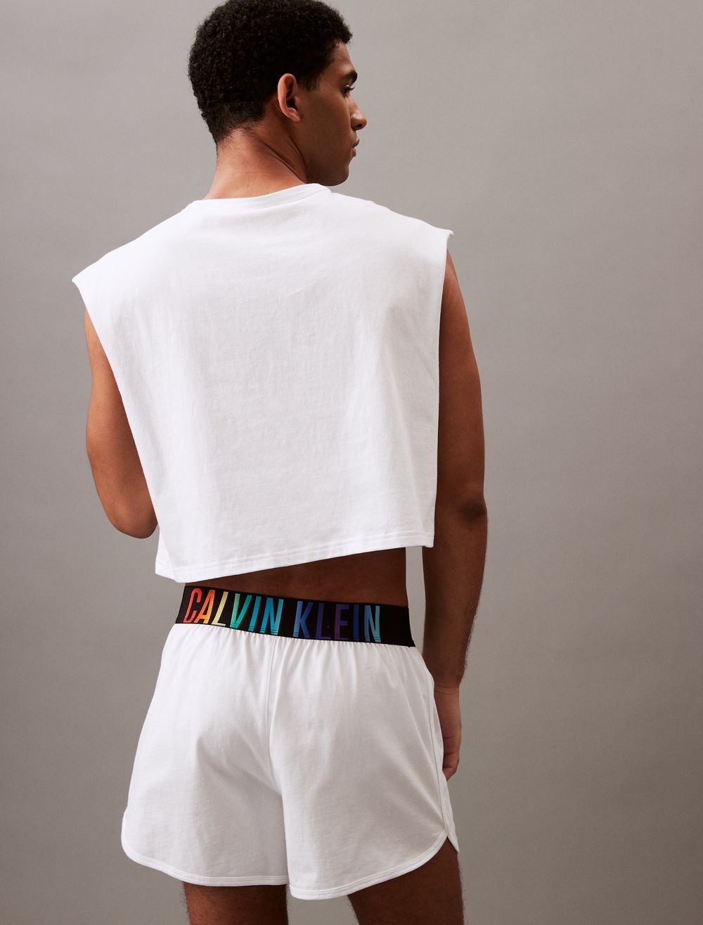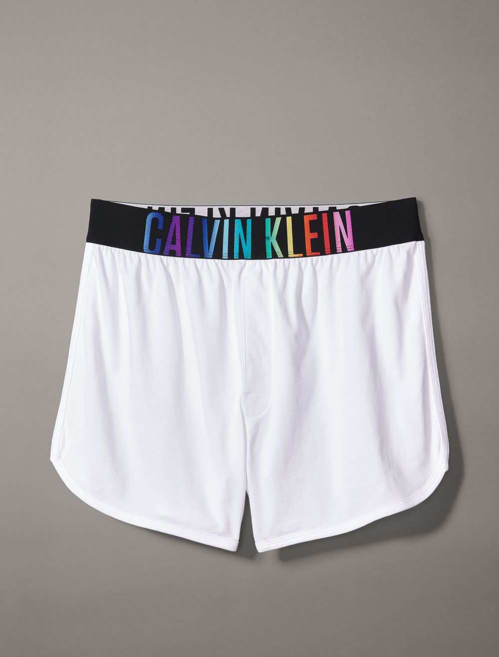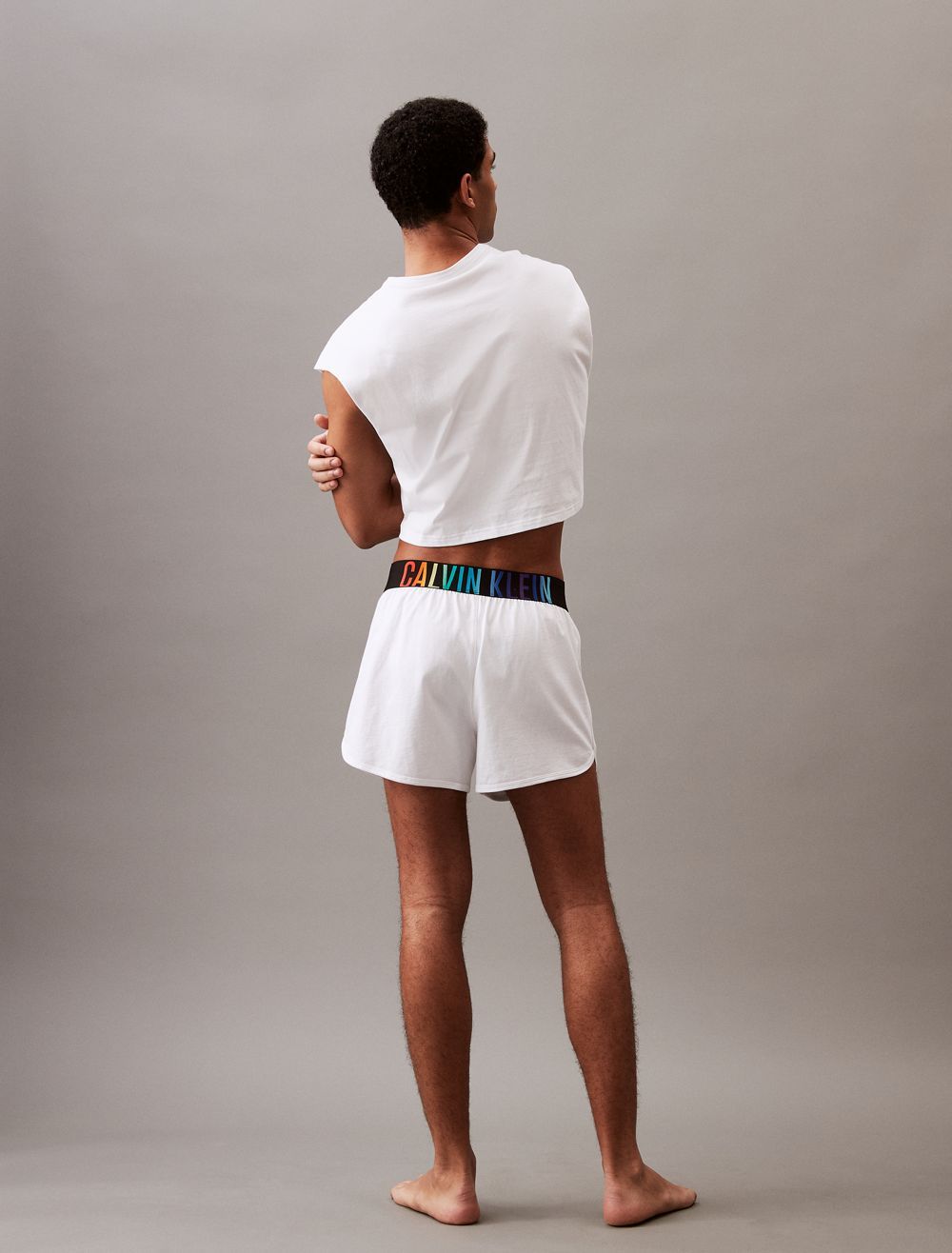 Wear it with Pride. A bold iteration of our iconic logo with maximum comfort and enhanced movement. These Calvin Klein sleep shorts are made from a plush recycled cotton blend with a wide supportive waistband, an athletic curved hemline and an unmistakable, modern look.- Pride styling in a limited edition rainbow color palette