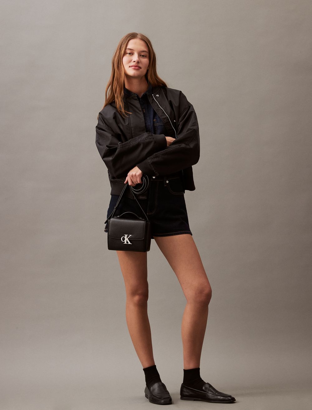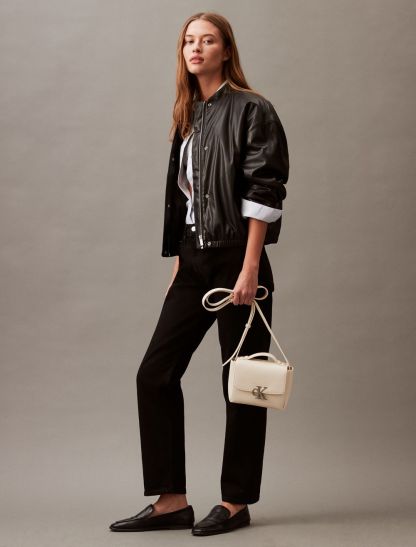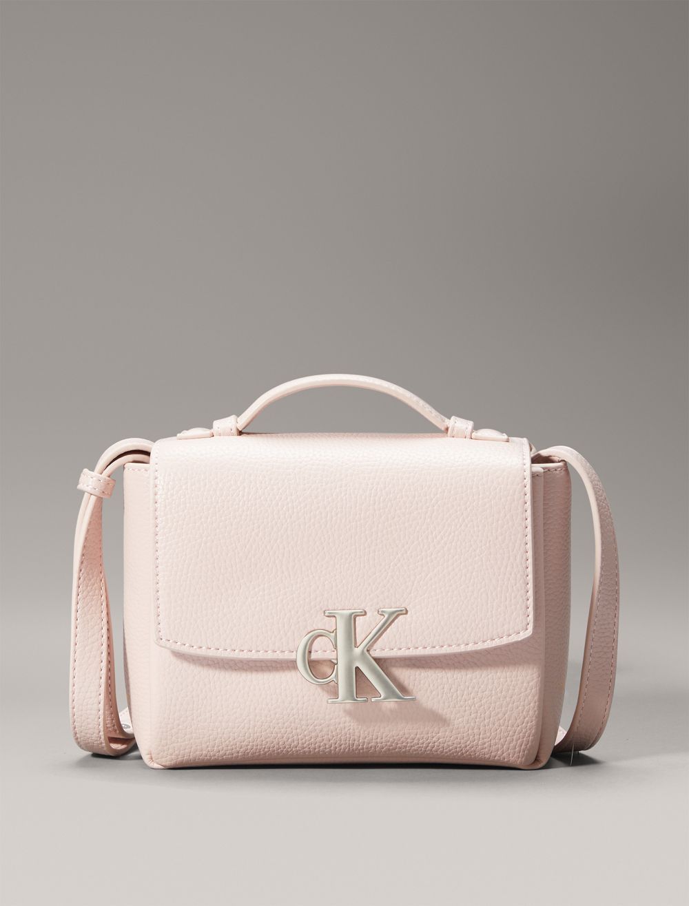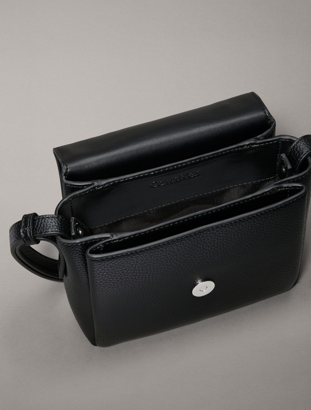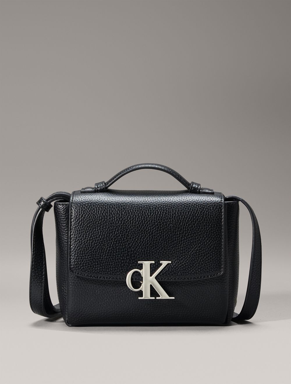 - CK monogram logo hardware at the top flap