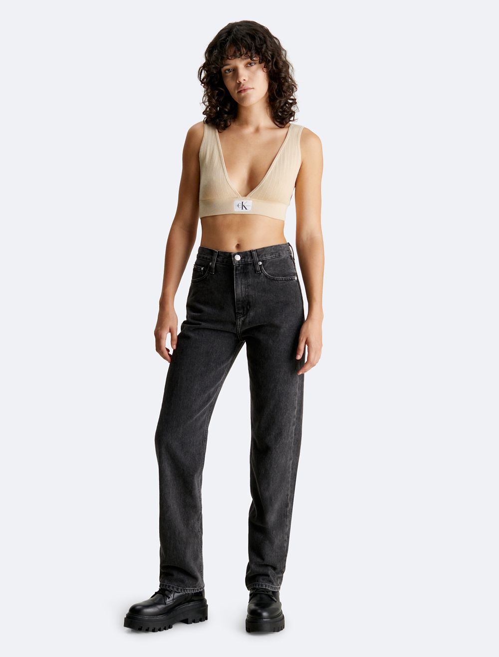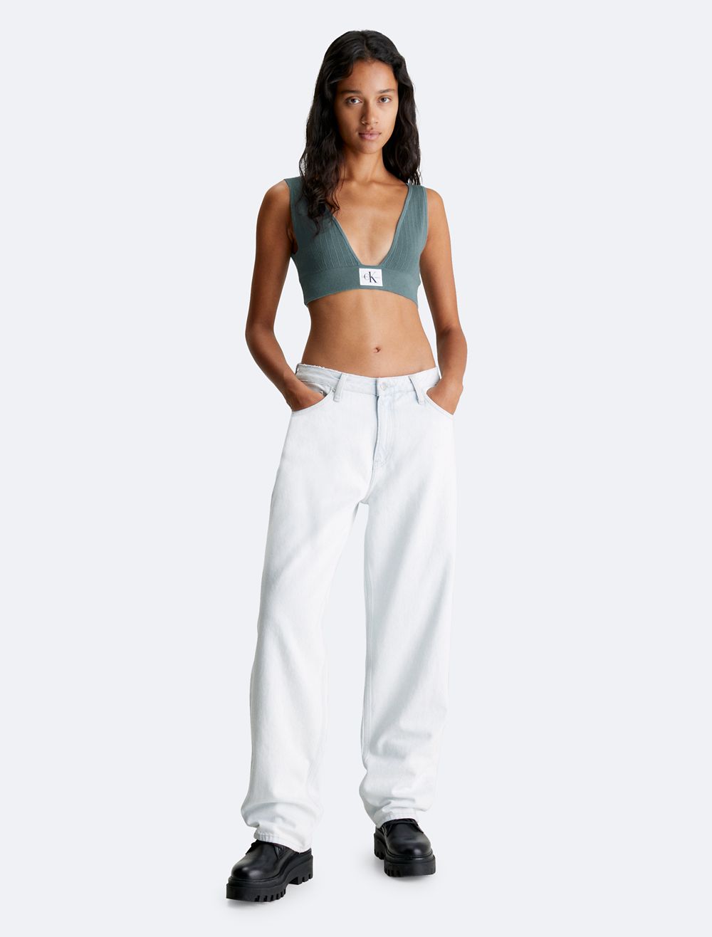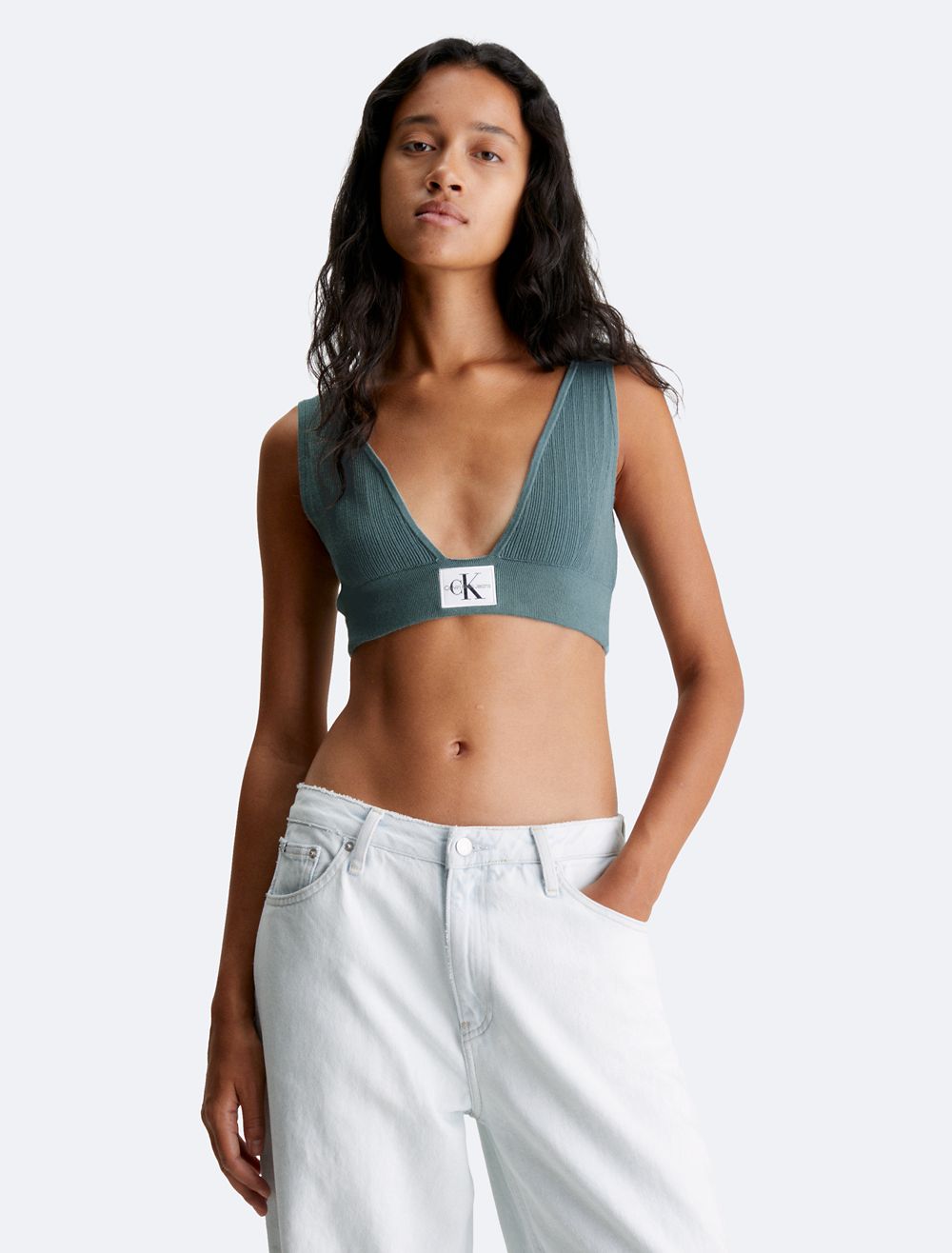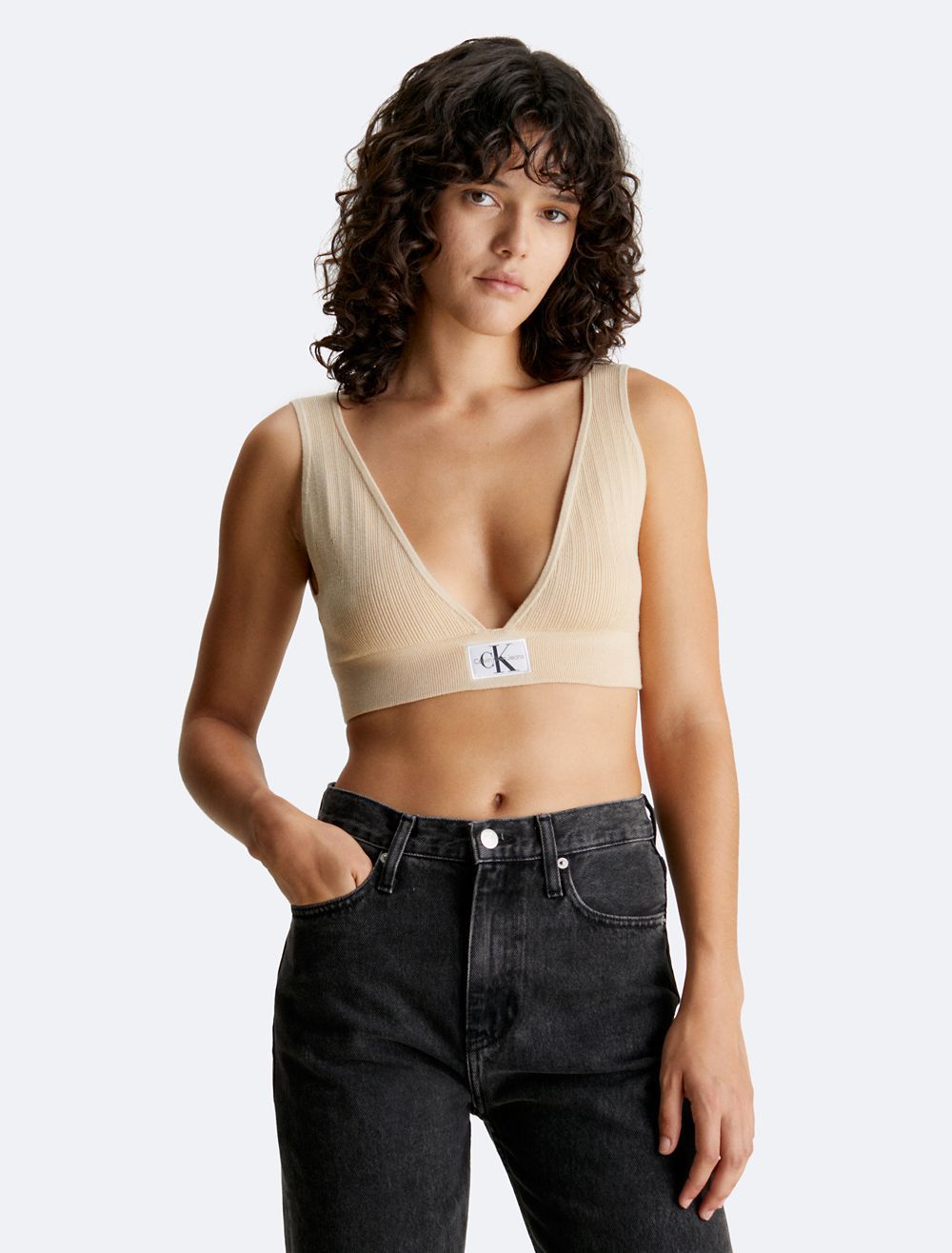 Crafted from a soft cotton-stretch blend, this bralette features a variegated rib knit and a deep V-neckline. An unlined design provides a lightweight touch while an elastic underband ensures a flexible fit. Detailed with a CK woven logo tag at the underband.- Variegated ribbed texture