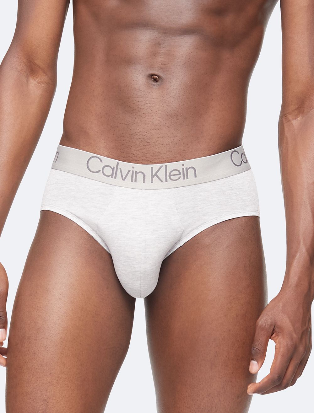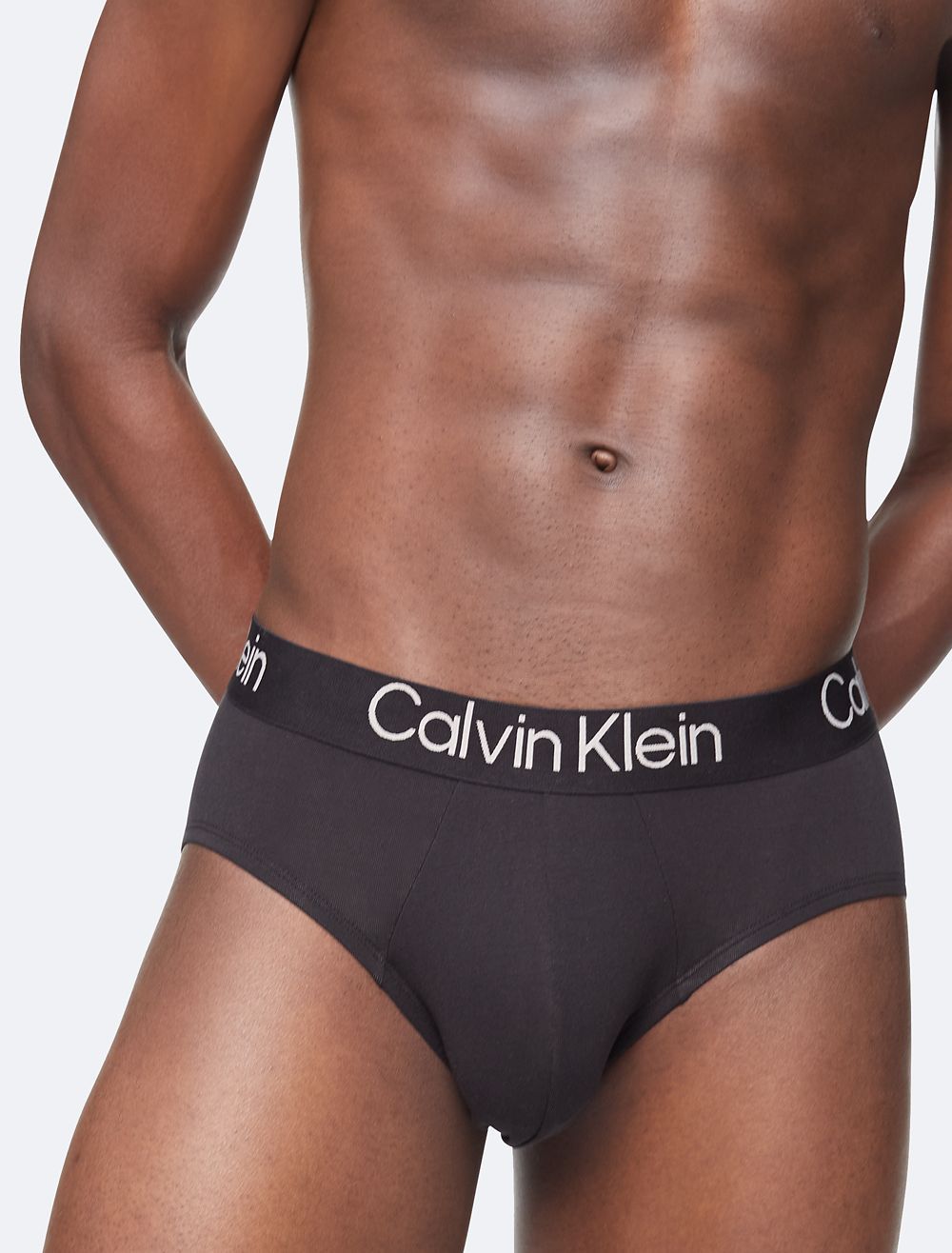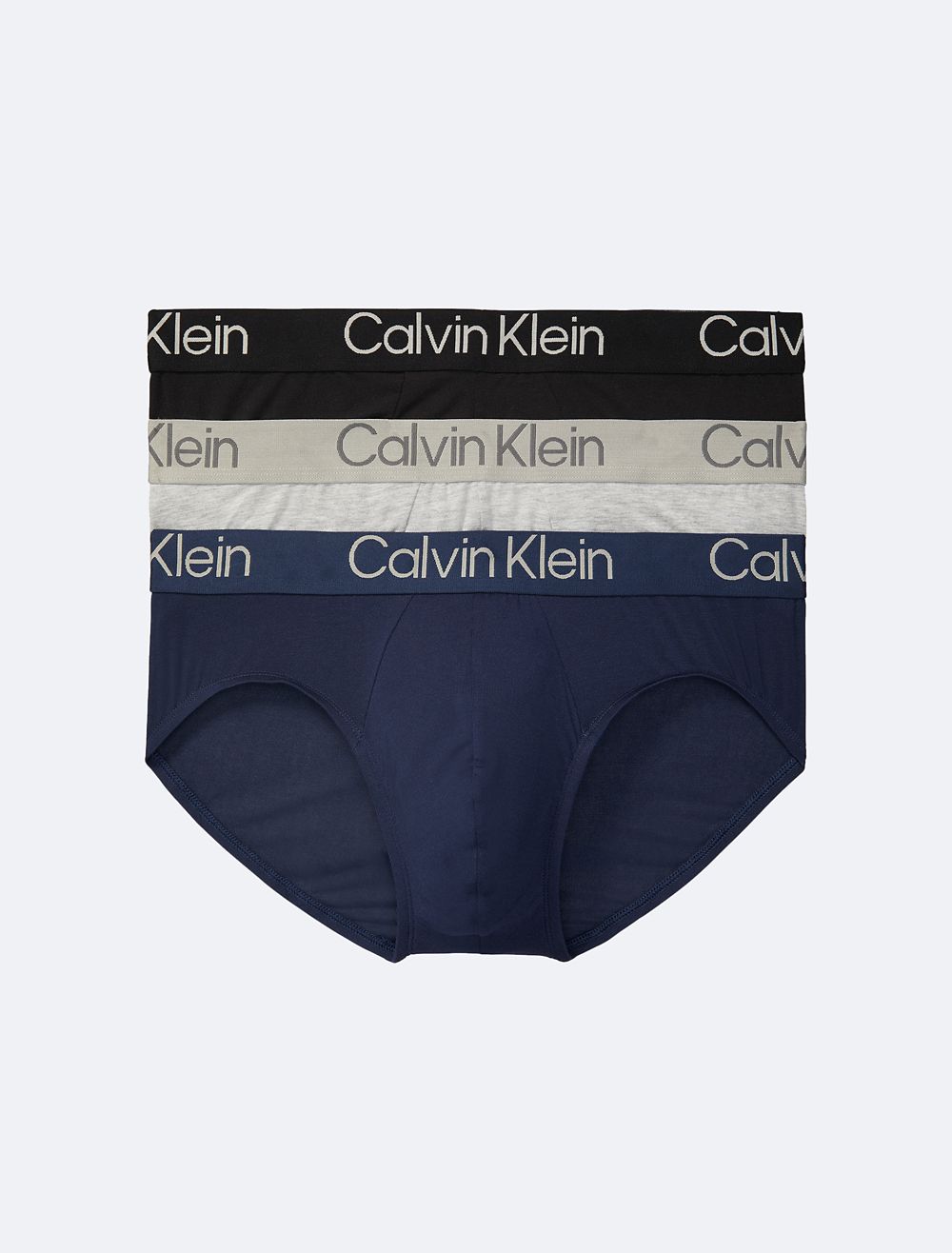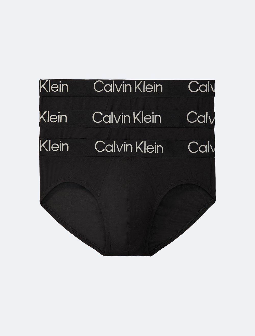 Breathable ultra-soft modal stretch. Crafted from responsibly sourced modal, these Calvin Klein hip briefs are designed with a super soft recycled logo waistband, a sleek contoured pouch and a turnback hem for a clean finish. Comes in a 3-pack.- Responsibly sourced modal with added breathability and long lasting fibers