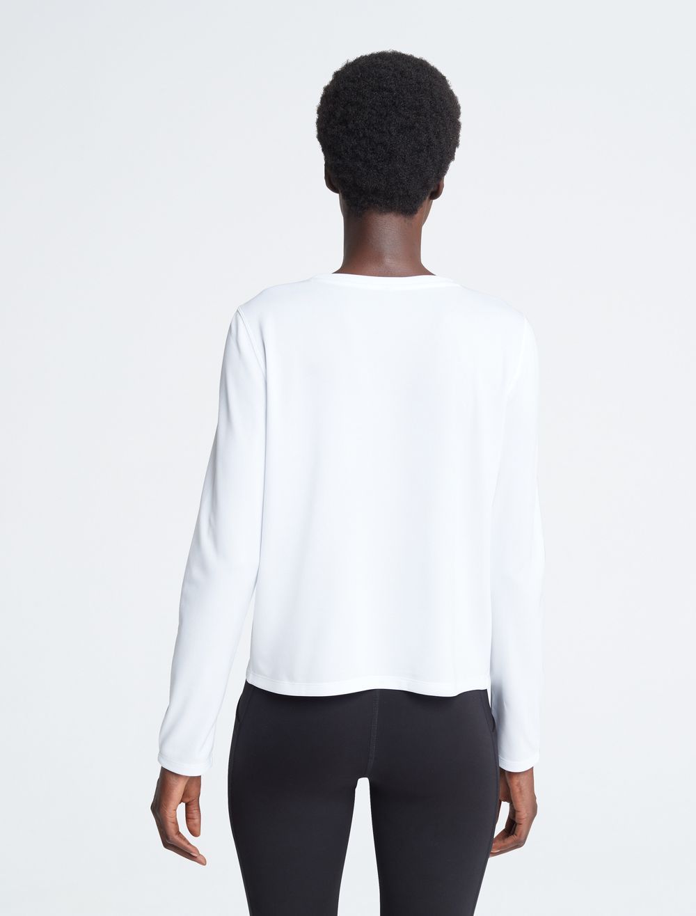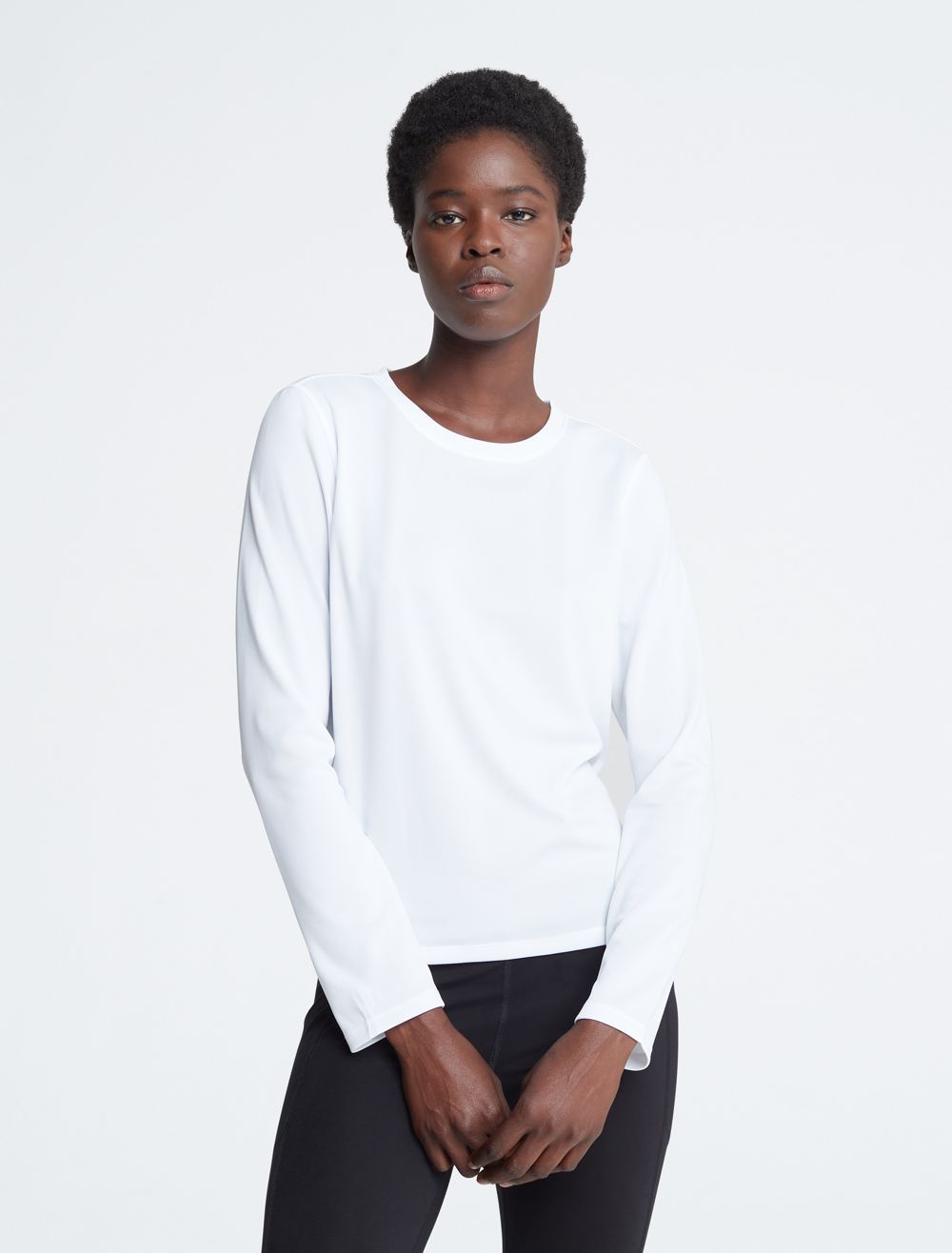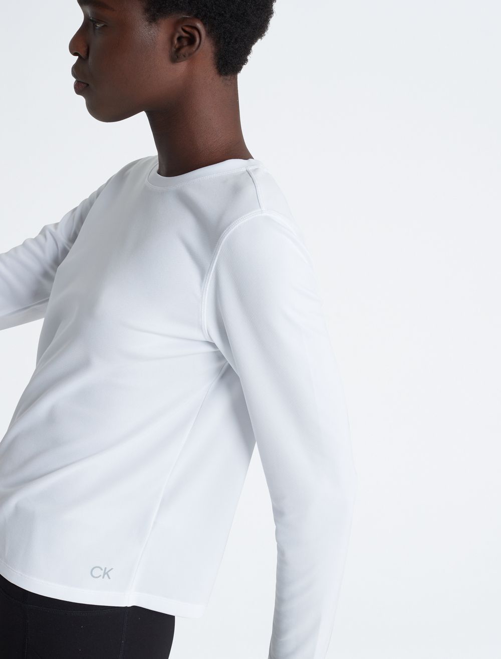 Created for limitless movement, this performance-ready t-shirt features a textured pique design. Made with long sleeves and a crewneck. Finished with a CK monogram logo detail near the hem.- Technical knit fabric with a shiny look