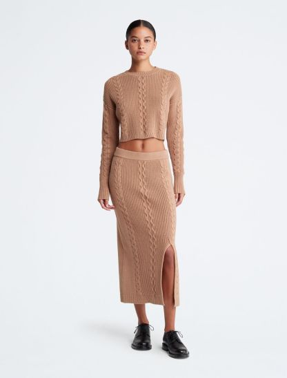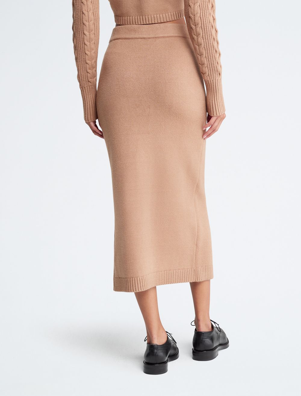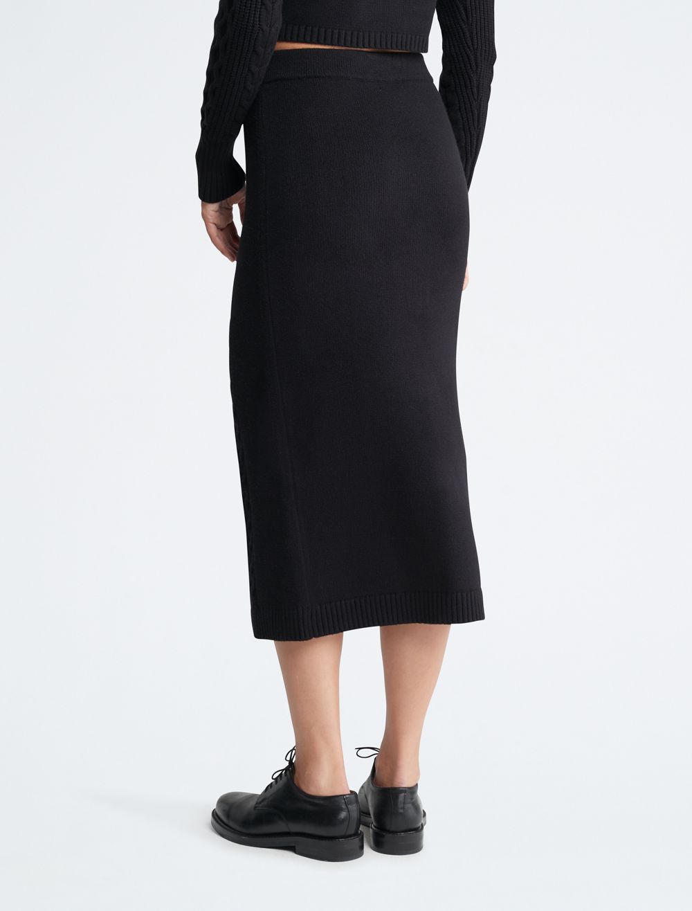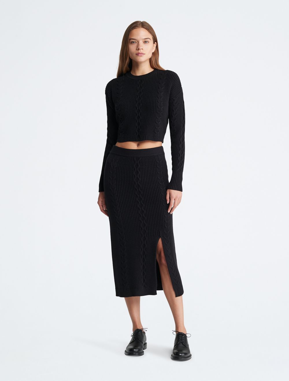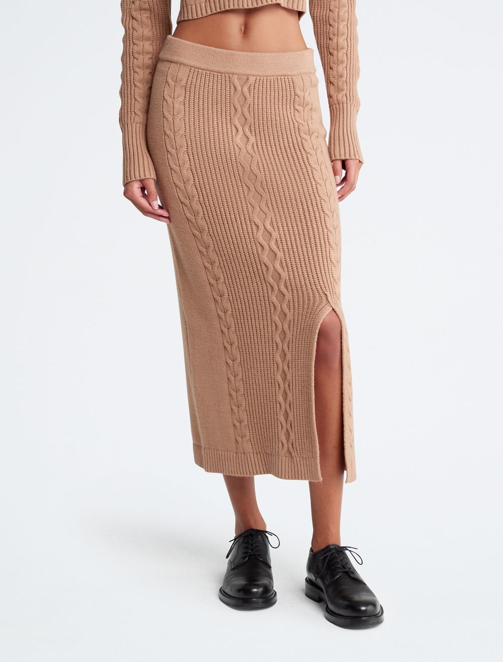 Cut in a midi length, this skirt features a cable knit with wide ribbed styling. Designed in a fitted silhouette and made with a high rise waist. Finished with an open slit detail at the hem.- Cable knit with wide ribbed styling