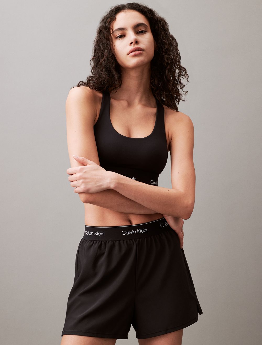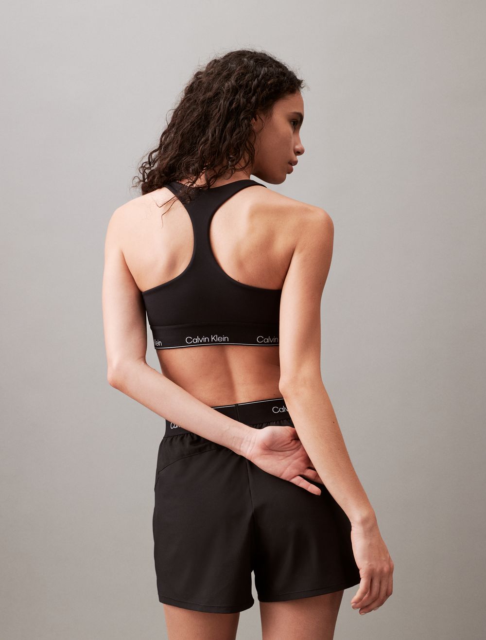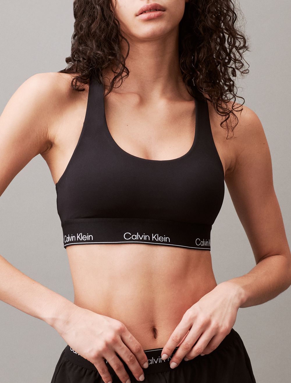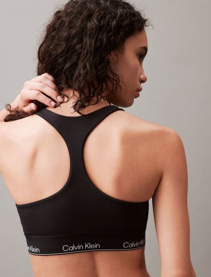 Featuring minimal, solid styling, this padded sports bra is constructed from moisture-wicking fabric for total comfort and breathability during workouts. Created with a racerback silhouette and a scoop neckline. Designed with an elastic underband detailed with repeating CK logos.- Moisture wicking fabric to keep you cool + dry