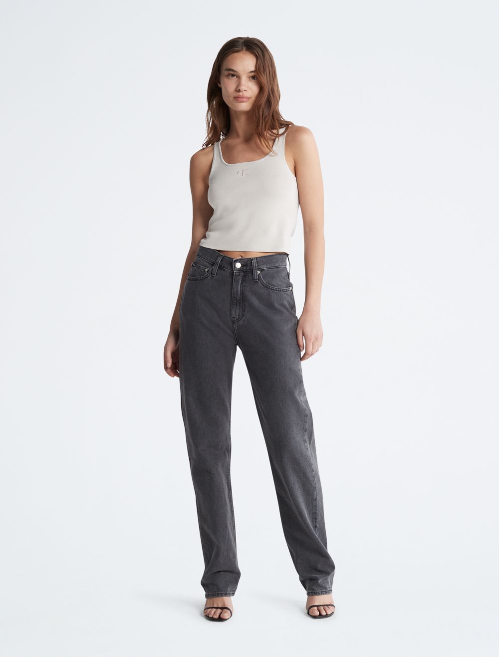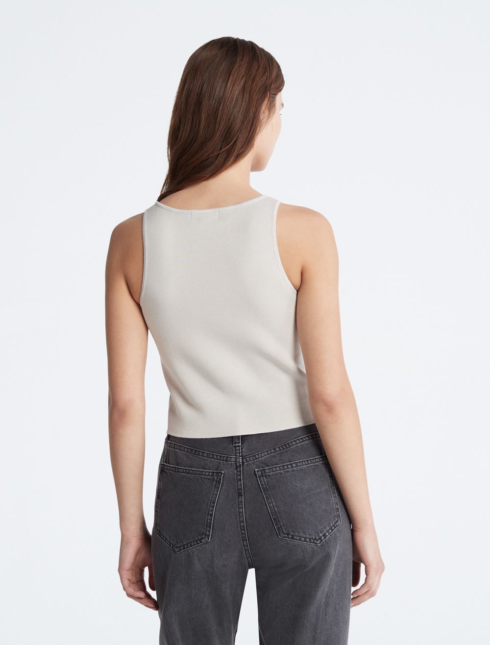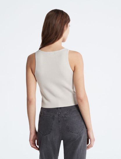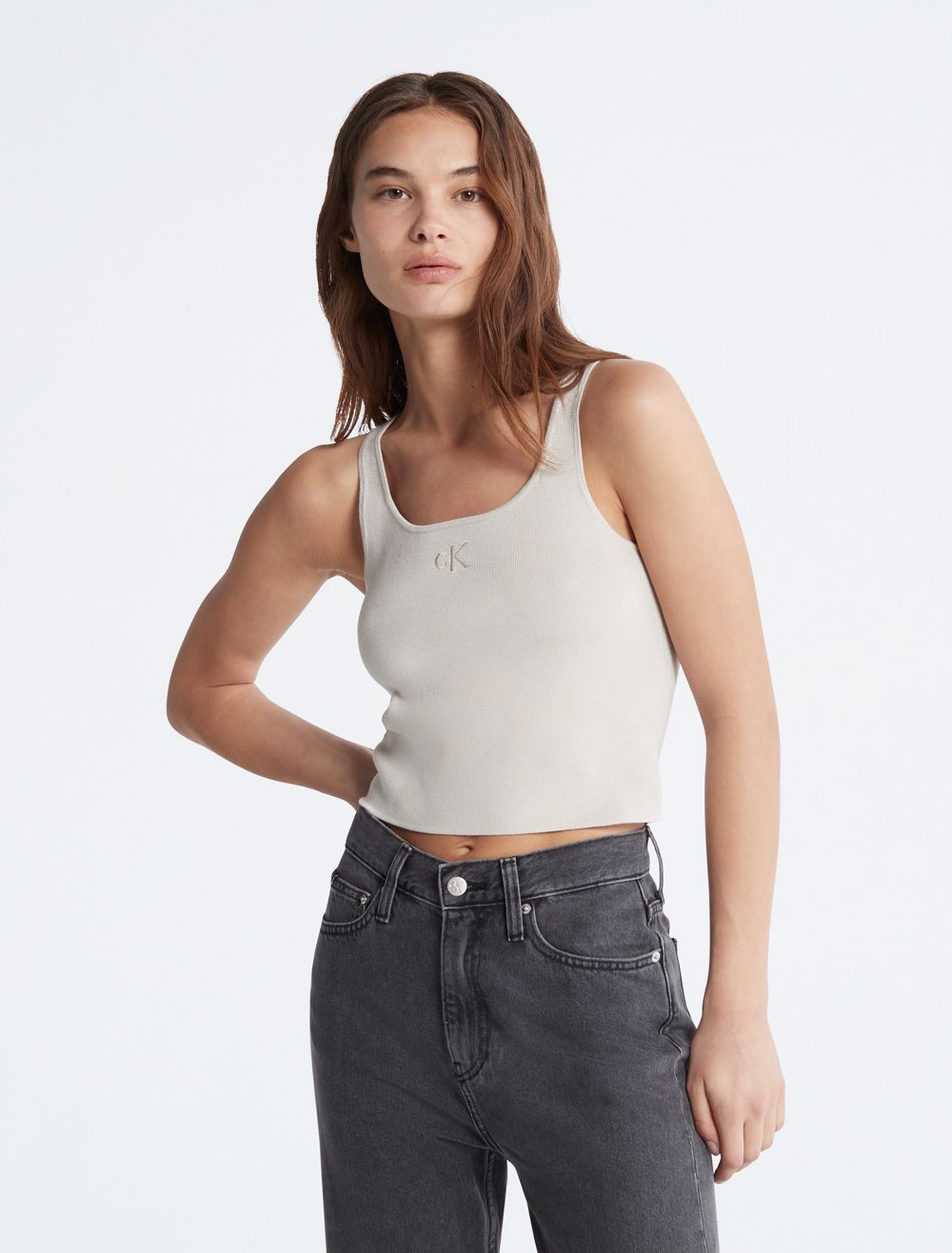 A minimal essential, this tank top features a sleeveless silhouette with a scoopneck. Cut in a cropped length and designed with an embroidered CK monogram logo at the front. Crafted completely from rayon for a light, weightless feel.- Cropped length