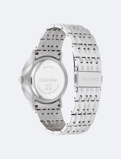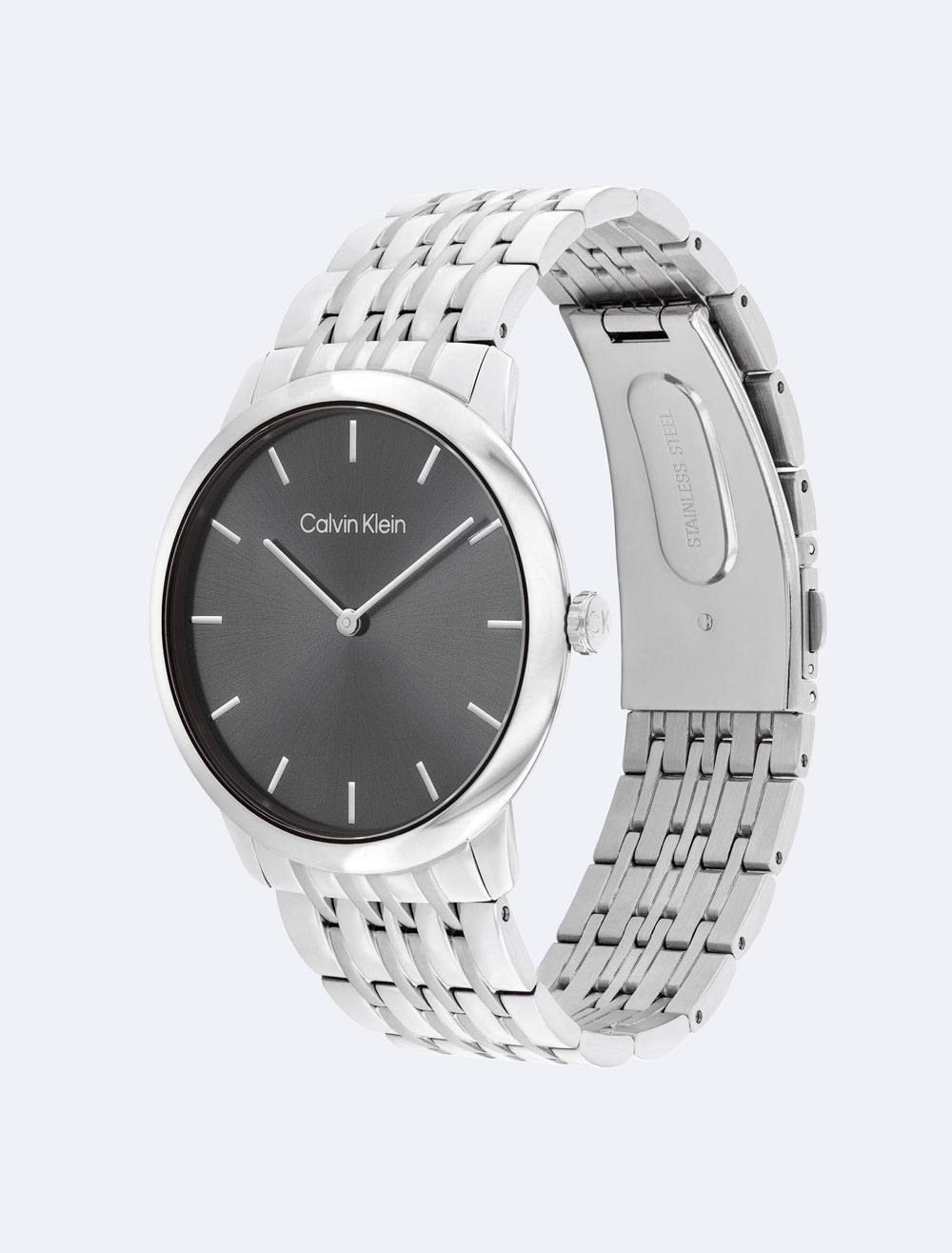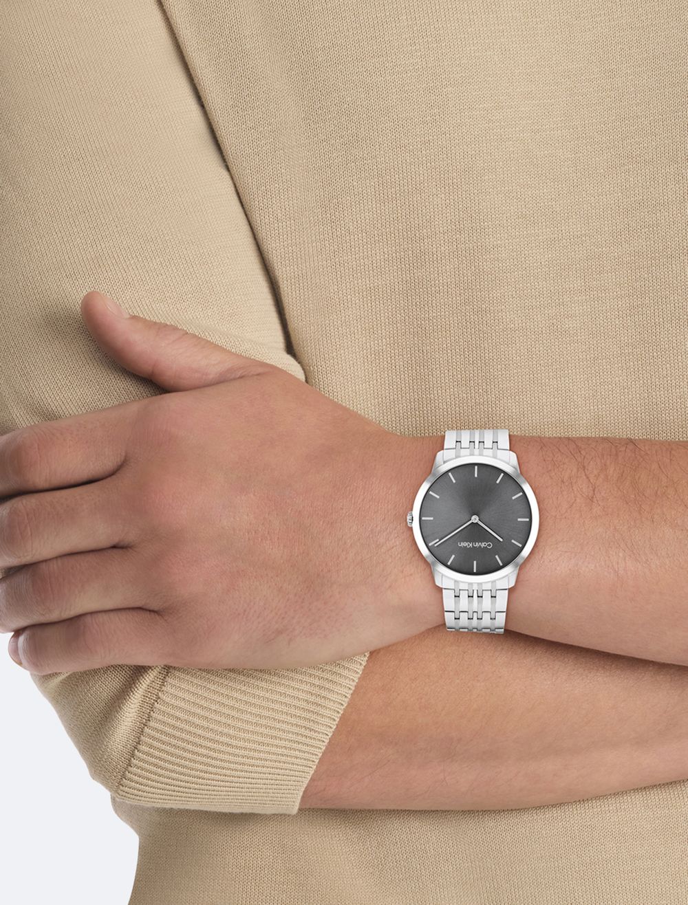 This understated timepiece has a versatile slim case profile, curved crystal and clean sunray dial with stick indices. Available on an integrated dual-finish multi-link bracelet- 40mm stainless steel, black IP, or gold-plated case