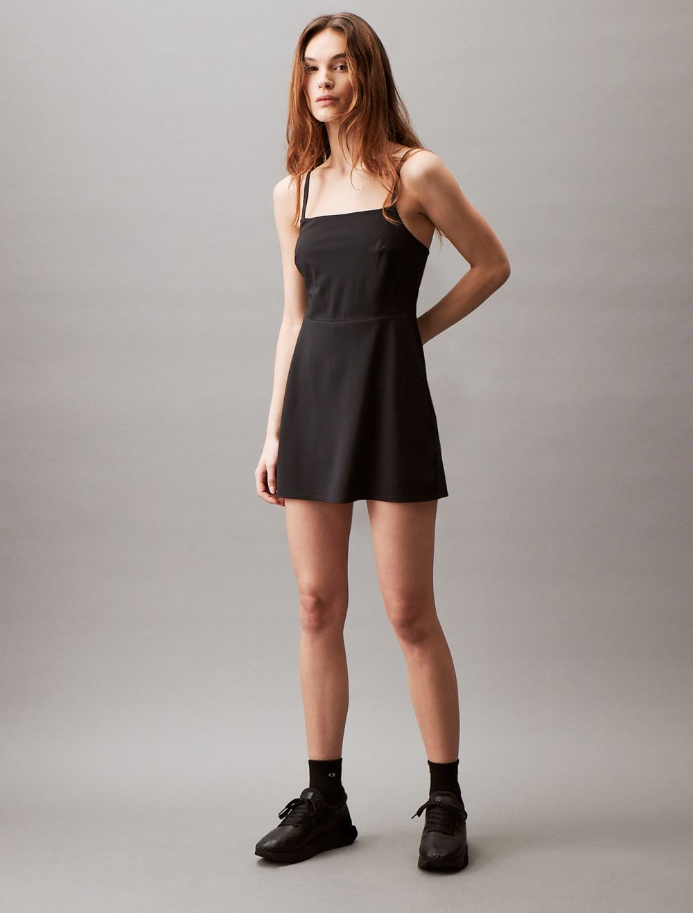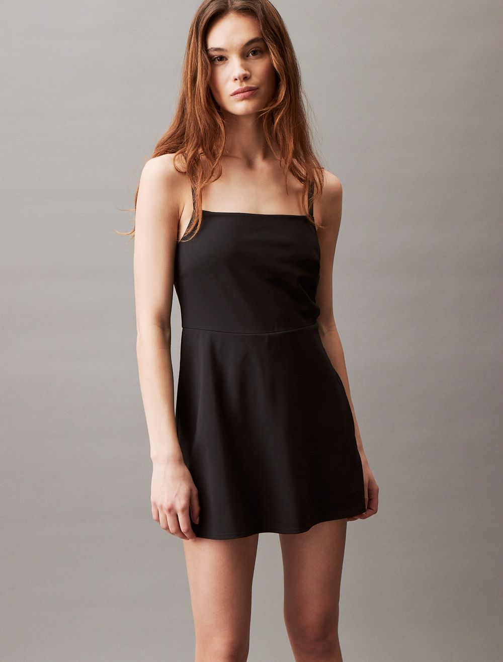 Featuring minimal, solid styling, this dress is created with a square neckline and cut in a mini length. Made with adjustable shoulder straps for a personalized fit. Finished with a CK logo detail at the lower back.- Moisture wicking fabric to keep you cool + dry