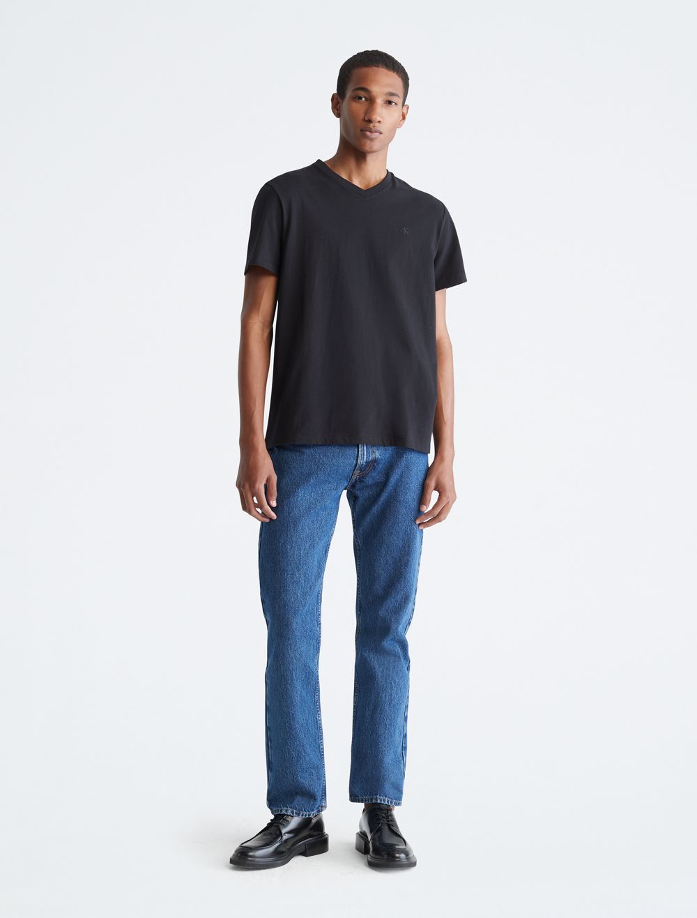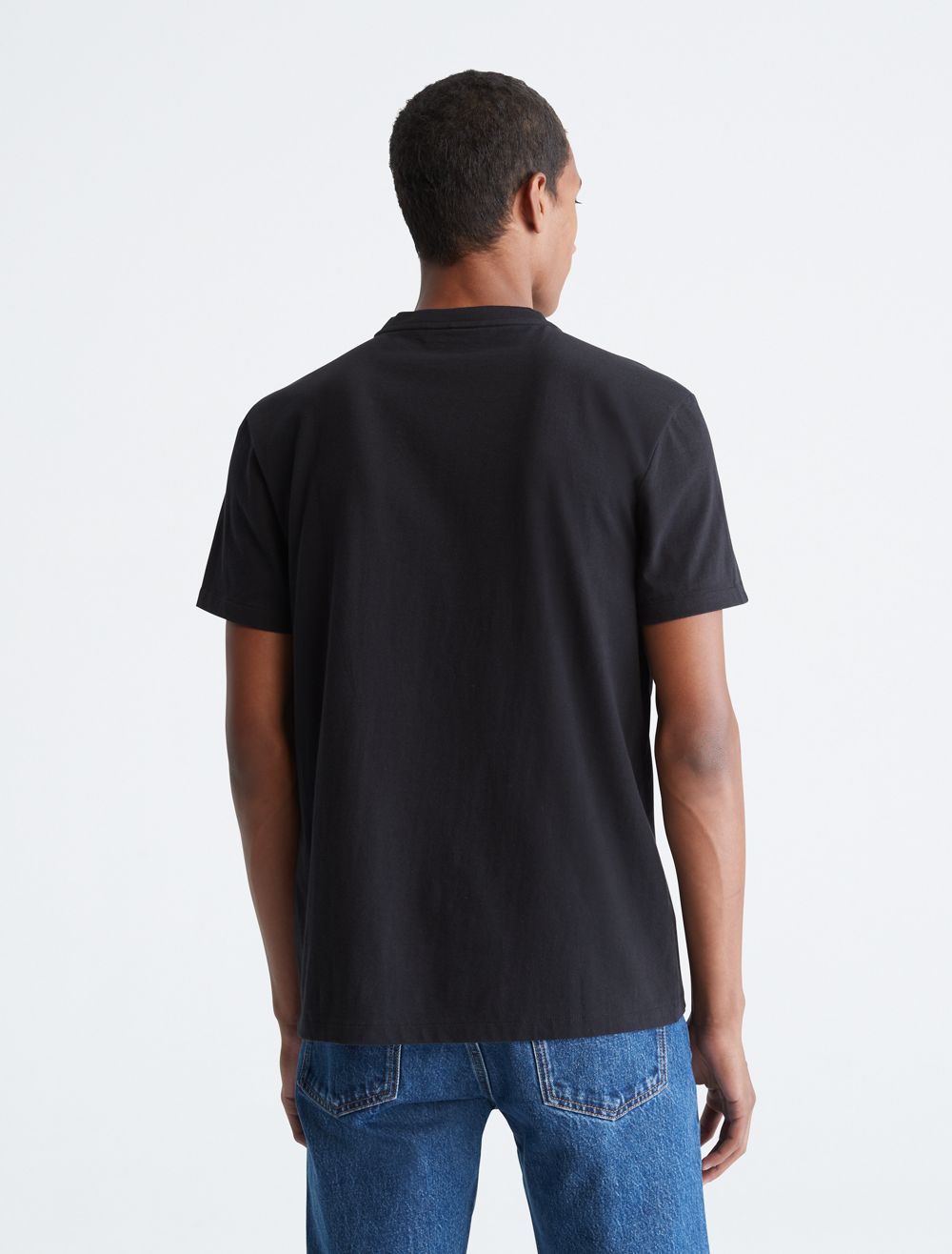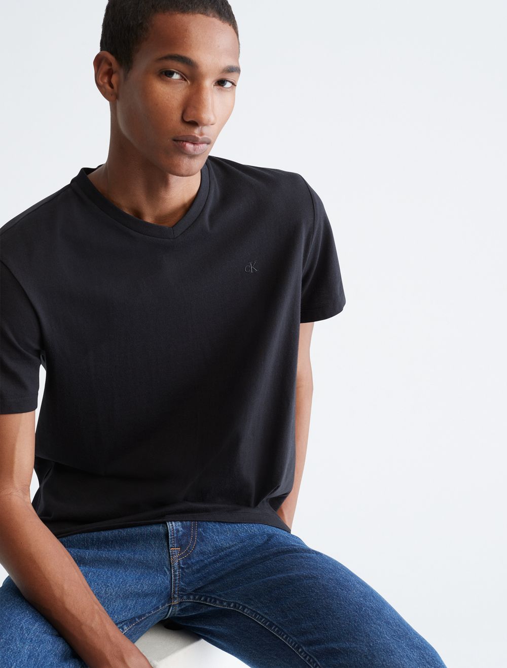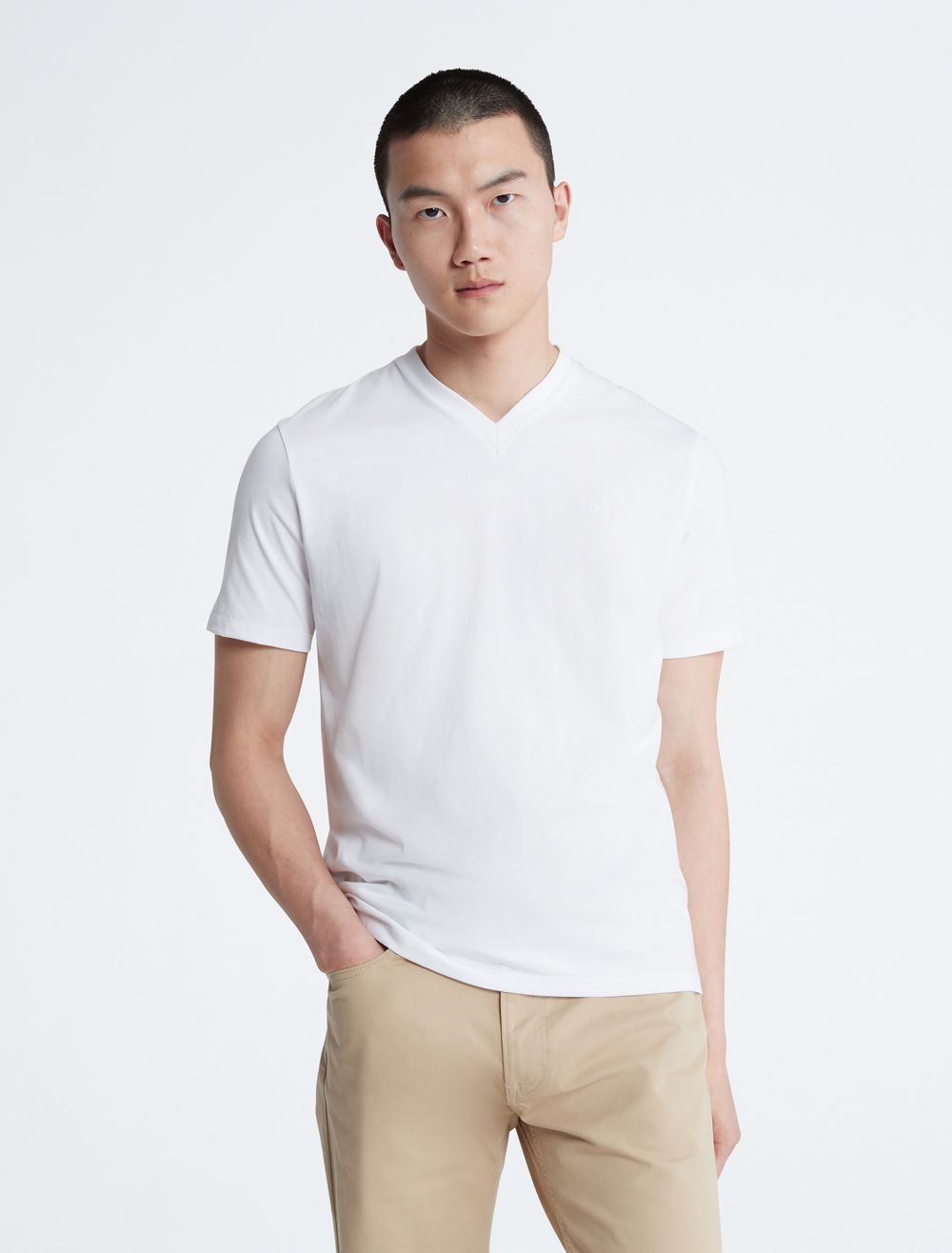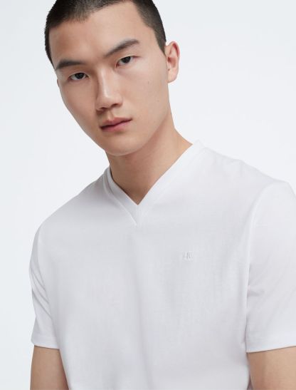Crafted from compact cotton for a smooth hand with an extra sleek feel, this Calvin Klein t-shirt features versatile solid styling for a timeless look. Detailed with a v-neck, a straight hem and twin-needle topstitching in a wide array of colors. Modern and street-ready, this Calvin Klein Jeans graphic tee is a perfect layer or on-trend style statement.- Versatile solid styling in a diverse array of seasonal colors