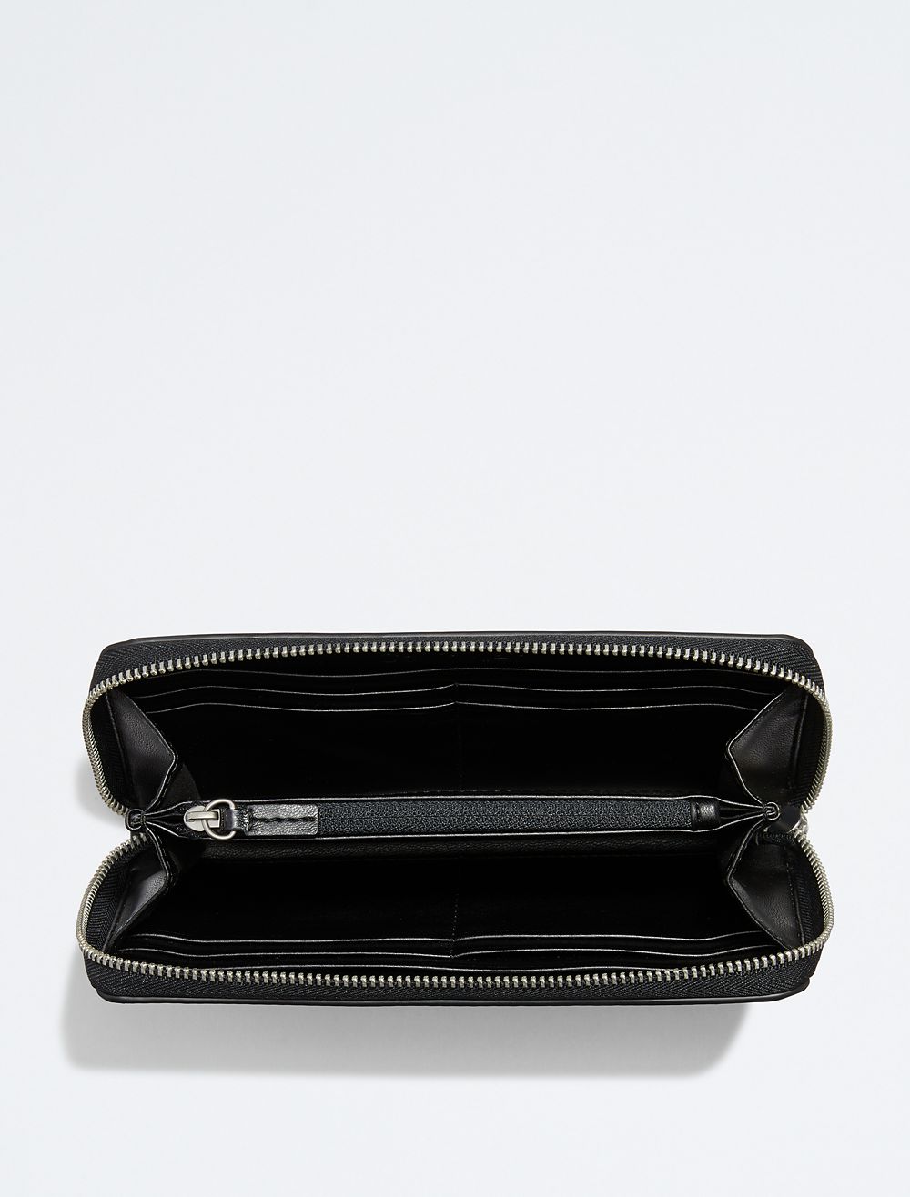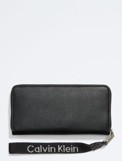 A wristlet styled with an interior zip pocket and interior accordion pockets fitted with card slots. Made with a full zip closure and a wrist strap. Features a CK logo styling along the wrist strap and an embossed CK monogram logo at the front.- Zip-around closure