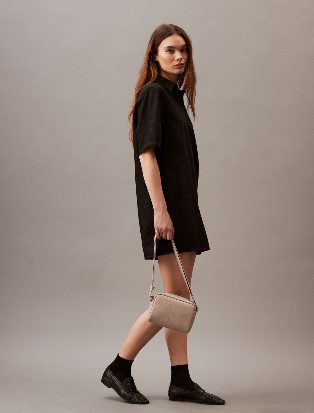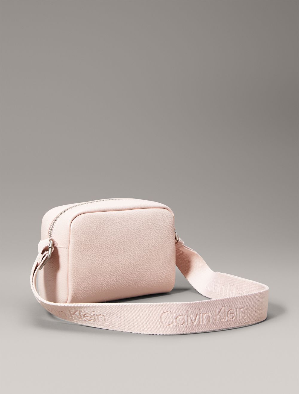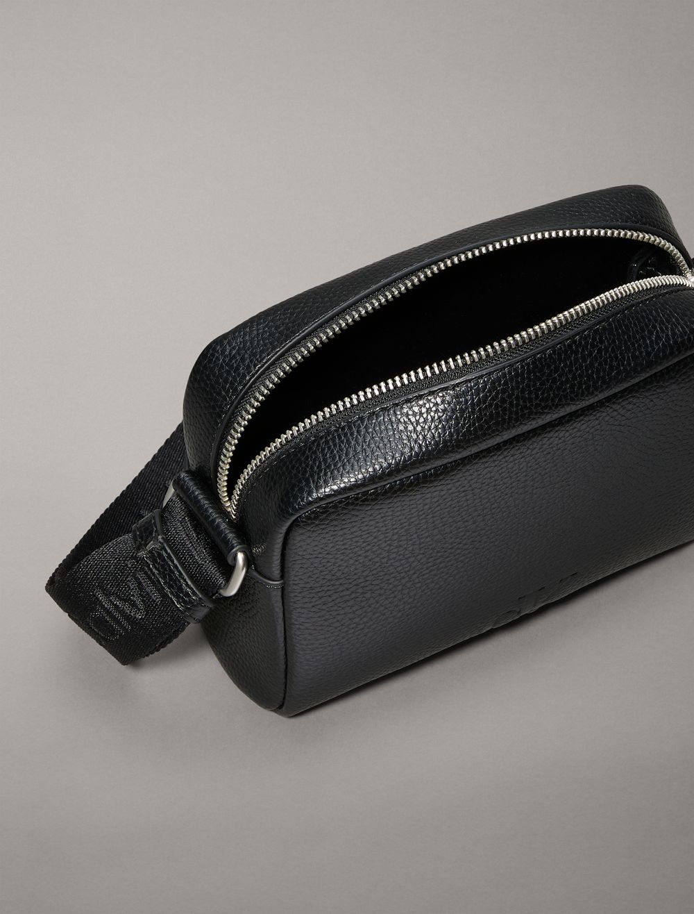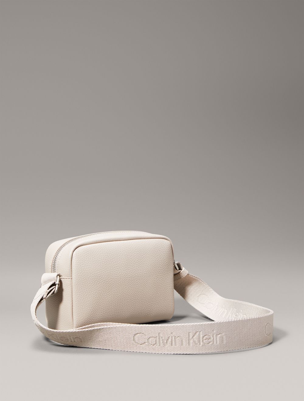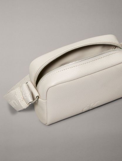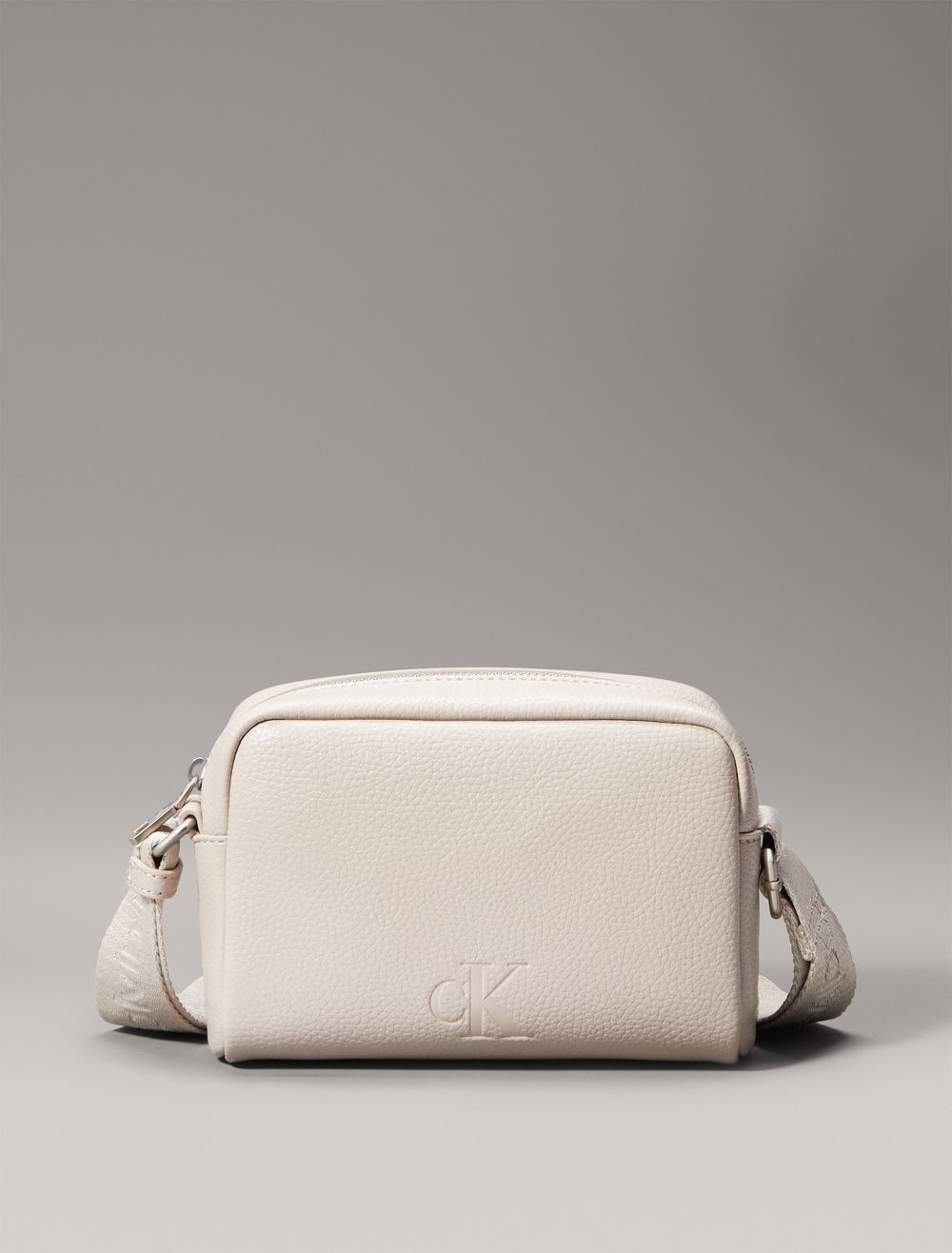 A camera bag made with a structured silhouette and minimal styling. Created with a zip closure and an adjustable shoulder strap. Features a CK logo design along the shoulder strap and an embossed CK monogram logo at the top flap.- Boxy silhouette