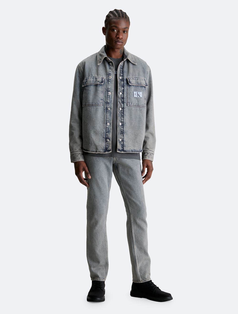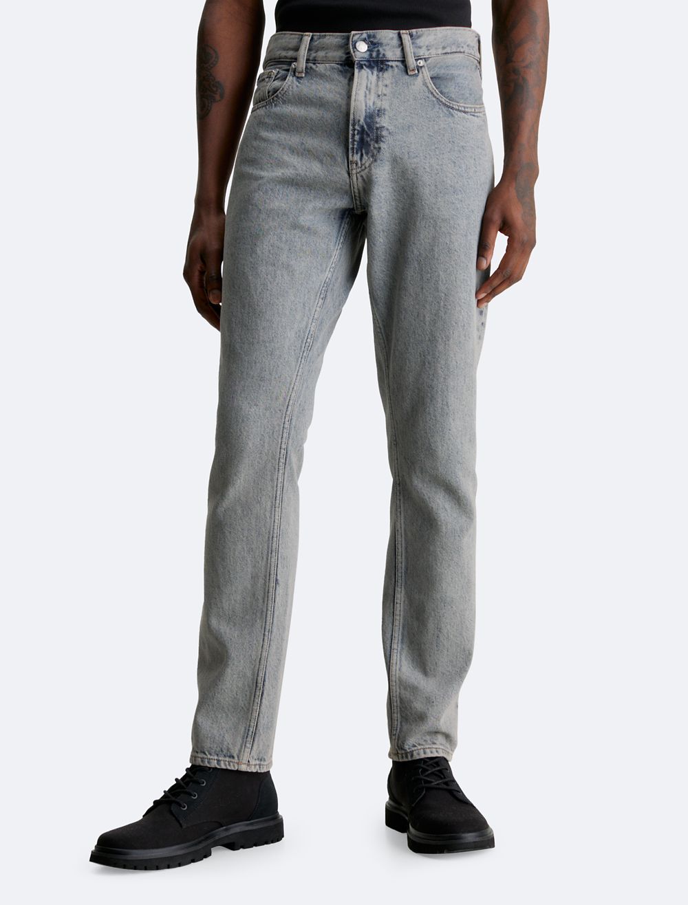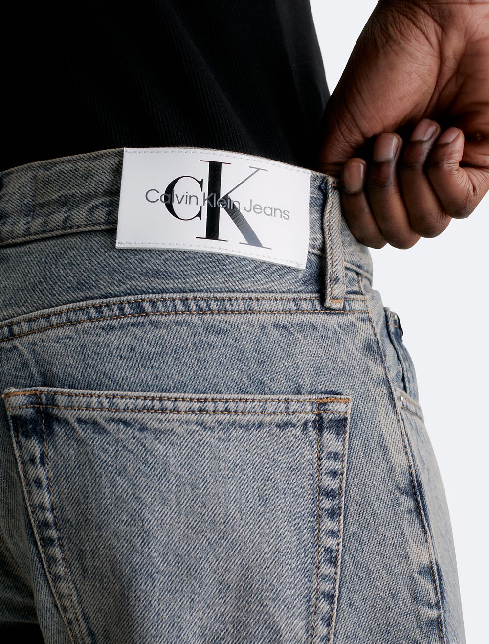 Crafted completely from rigid cotton denim, these jeans are made with a sturdy feel that will break-in over time. Cut in a straight leg silhouette with a medium rise waist. Detailed with a Calvin Klein logo patch at the back waist and finished with topstitching accents.- Straight leg silhouette