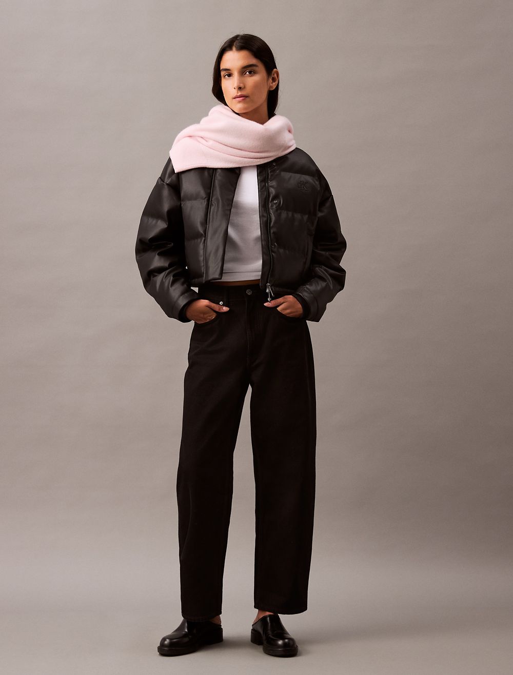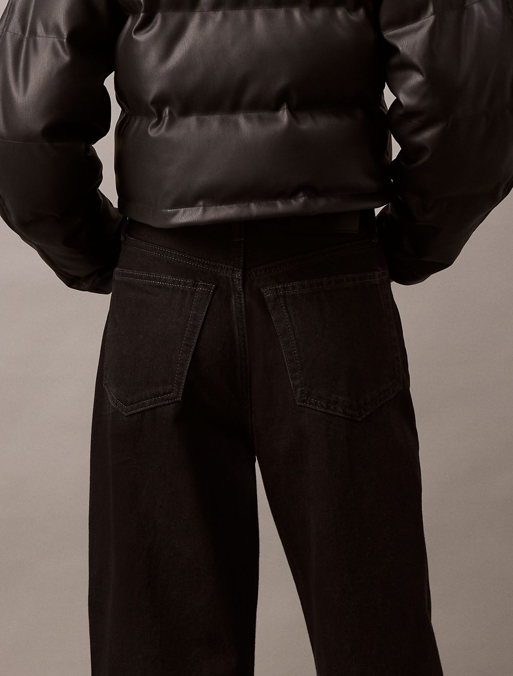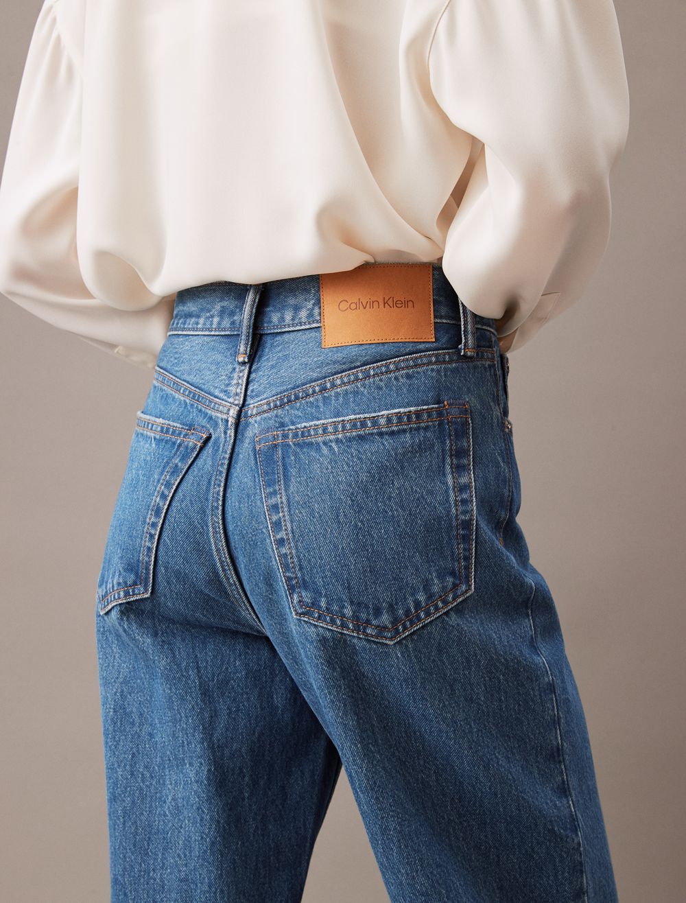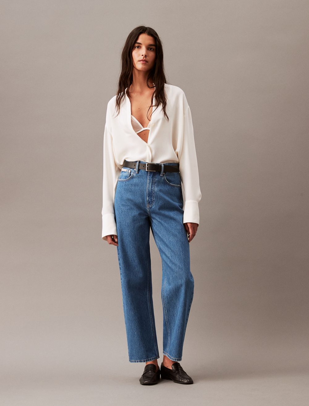 Cut with a high rise waist, these barrel jeans have a tapered wide-leg fit. Features classic 5-pocket styling with topstitching and seaming details for a crisp, elevated shape. Detailed with CK branded hardware and a logo patch at the back waist. Crafted completely from cotton for a classic, sturdy feel that will break-in over time.- High rise waist