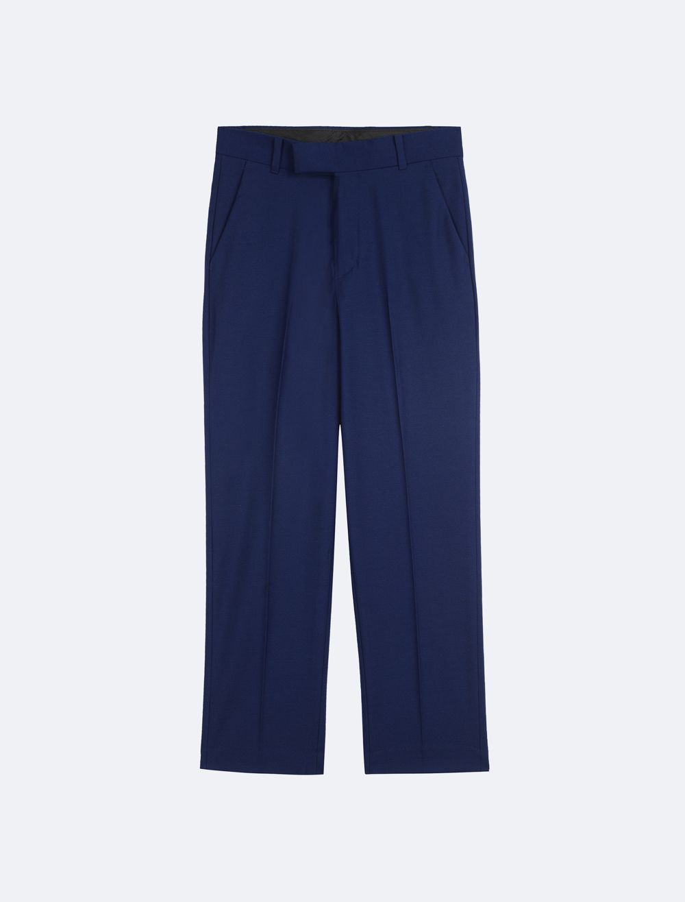 - Pressed creases along the leg