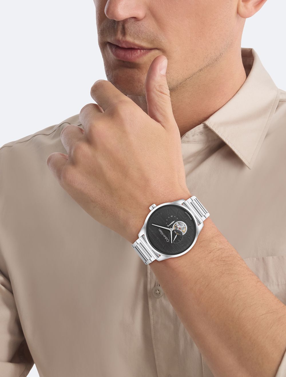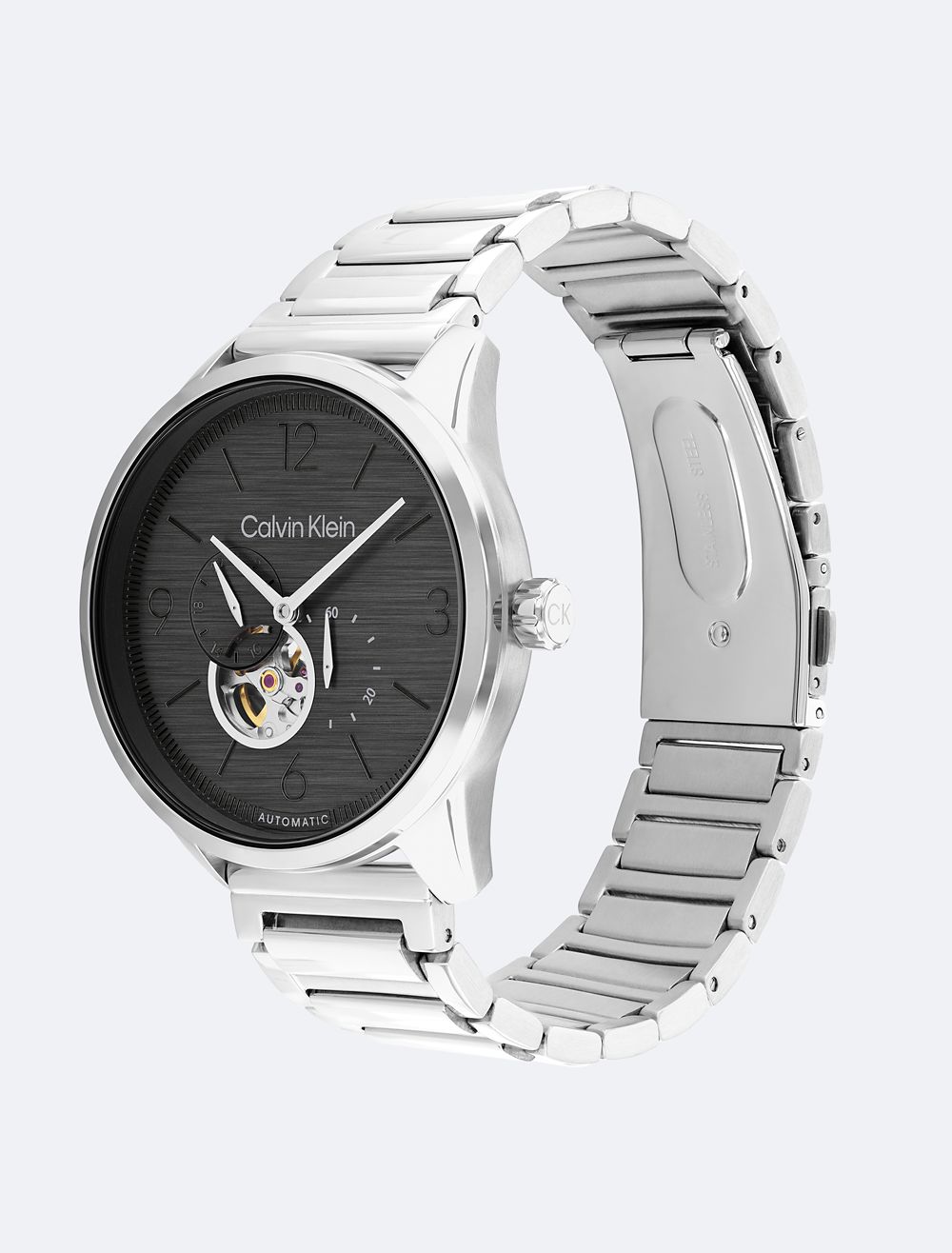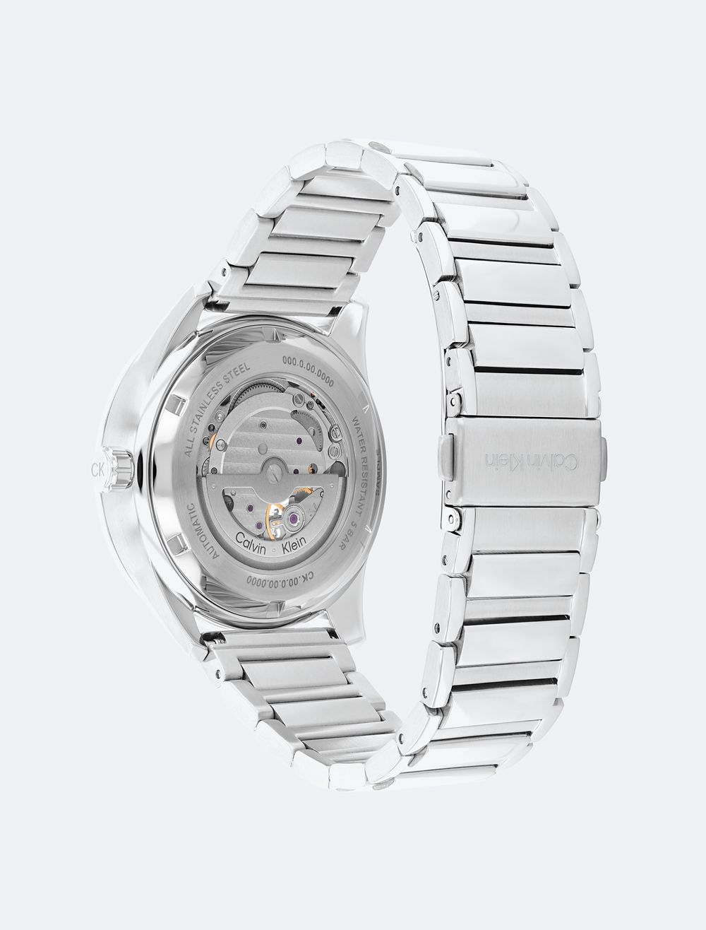 Movement driven. This automatic watch has a beautiful exhibition case back with an exposed battery-free movement further enhanced by its minimalistic dial treatment.- Stainless steel