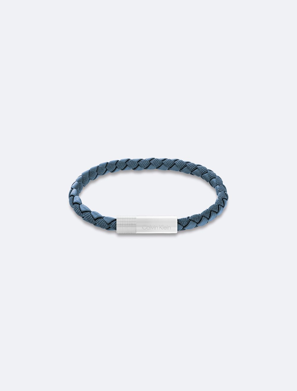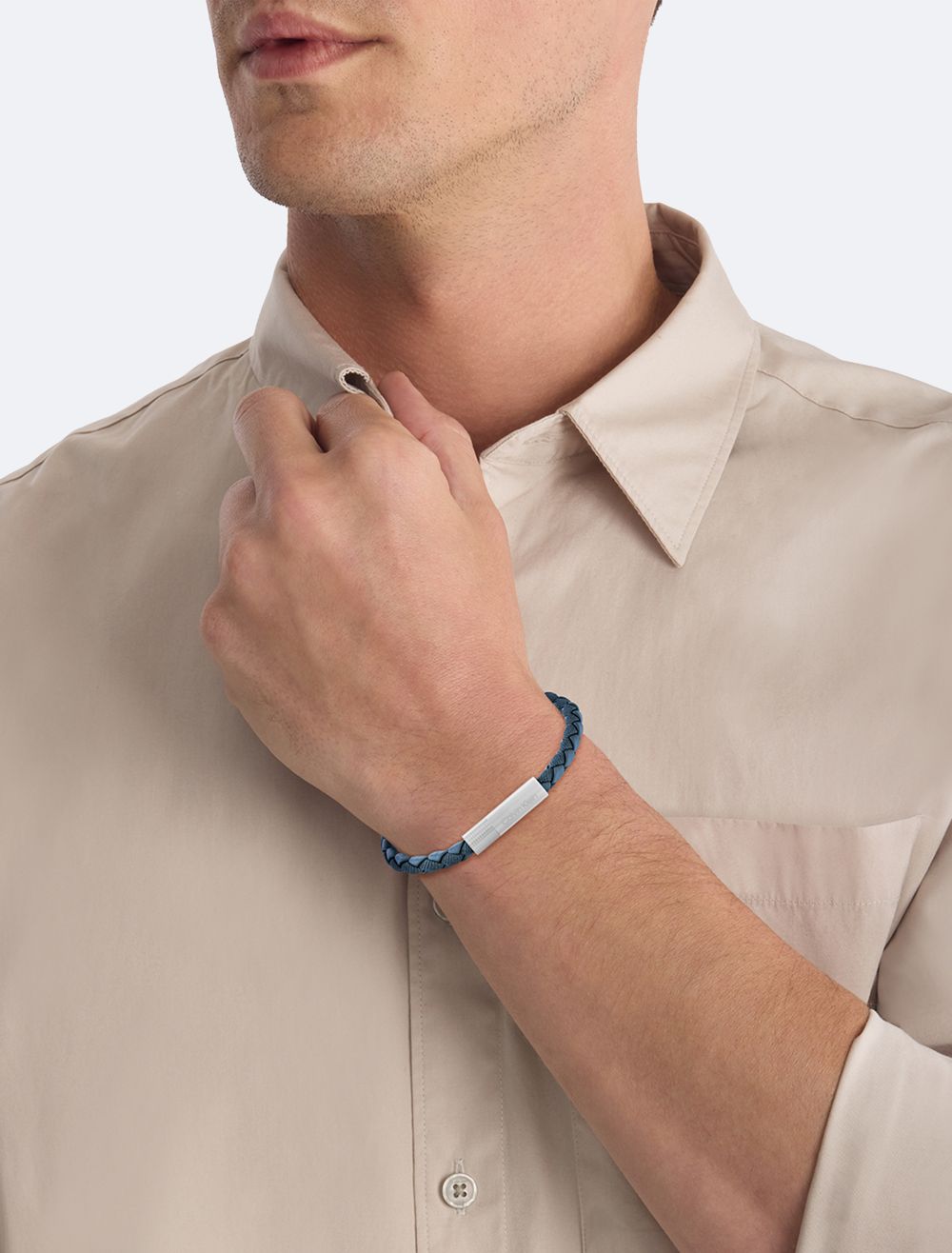 This braided leather bracelet features engraved logo hardware detailed with a linear pattern. Made with a magnetic closure.- Stainless steel or gold plated hardware
