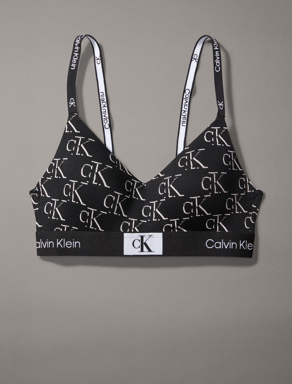 Amplified classics, CK 1996 is a vibrant logo story featuring our iconic monogram framed in a box. A new approach to print and color with a distinct graphic language. This lightly lined bralette is designed with a recycled cotton stretch blend and repeating classic logos.- Blended with recycled cotton for a sustainable design