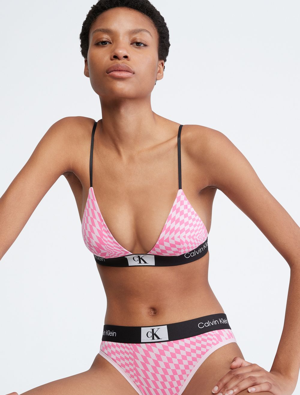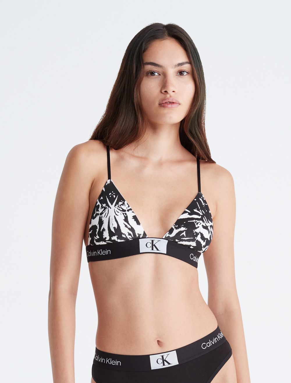 Amplified classics, CK 1996 is a vibrant logo story featuring our iconic monogram framed in a box. A new approach to print and color with a distinct graphic language. This unlined triangle bralette is designed with a recycled cotton stretch blend and repeating classic logos.- Blended with recycled cotton for a sustainable design