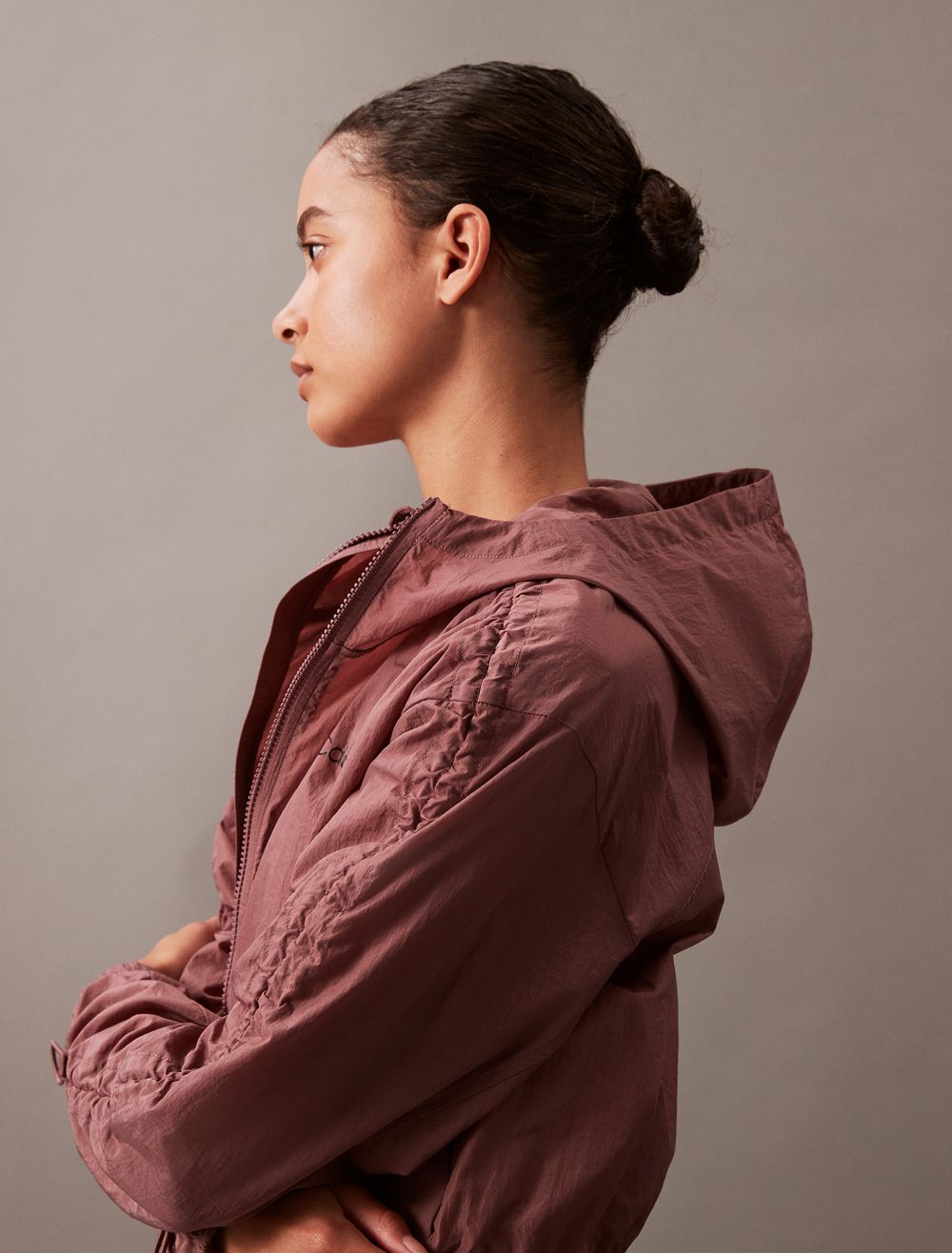 Constructed from crinkled nylon fabric, this windbreaker jacket is designed to support dynamic movement while maintaining comfort and breathability. Created with full zip closure and a hood. Styled with elastic sleeve cuffs and an elastic hem.- Crinkled nylon fabric