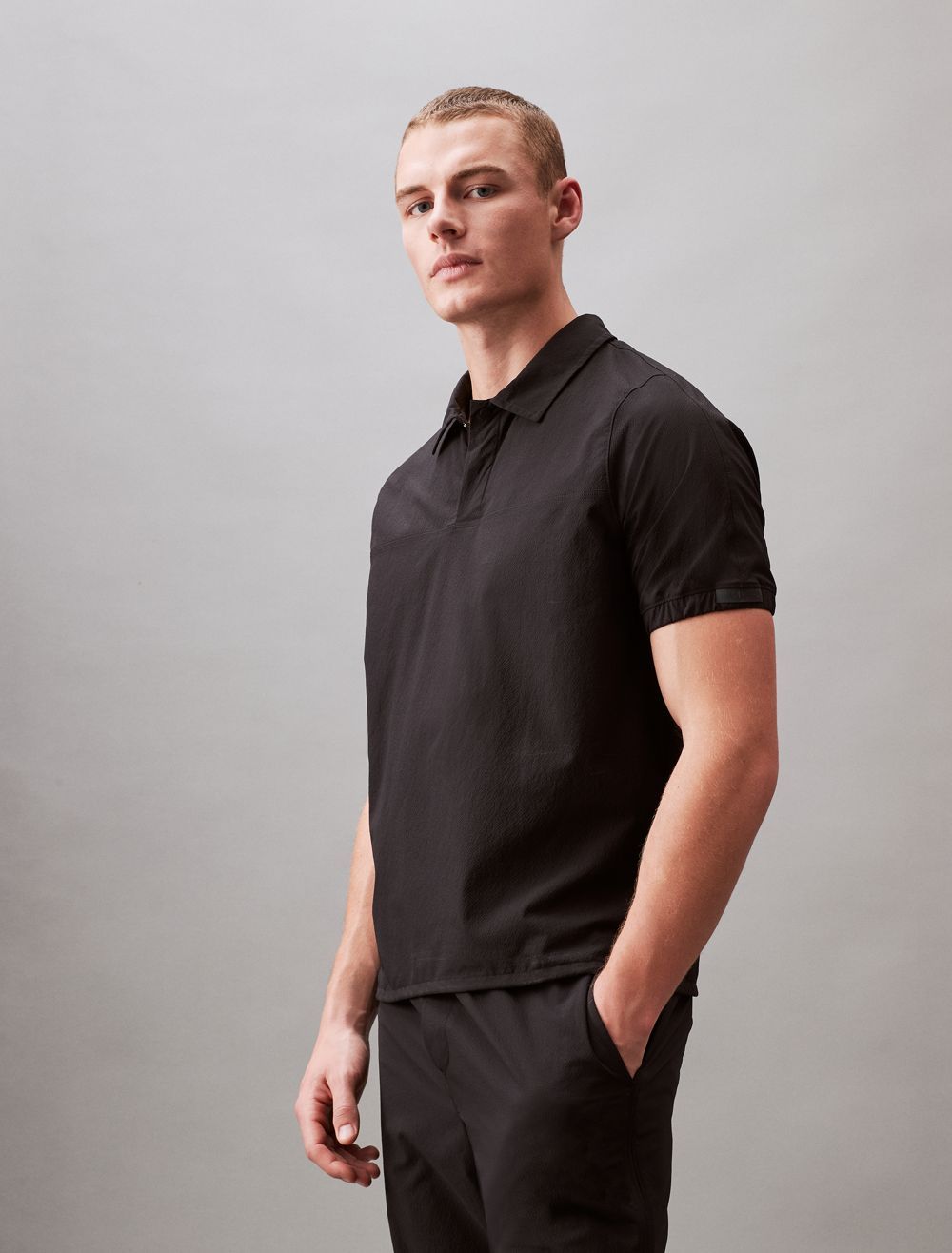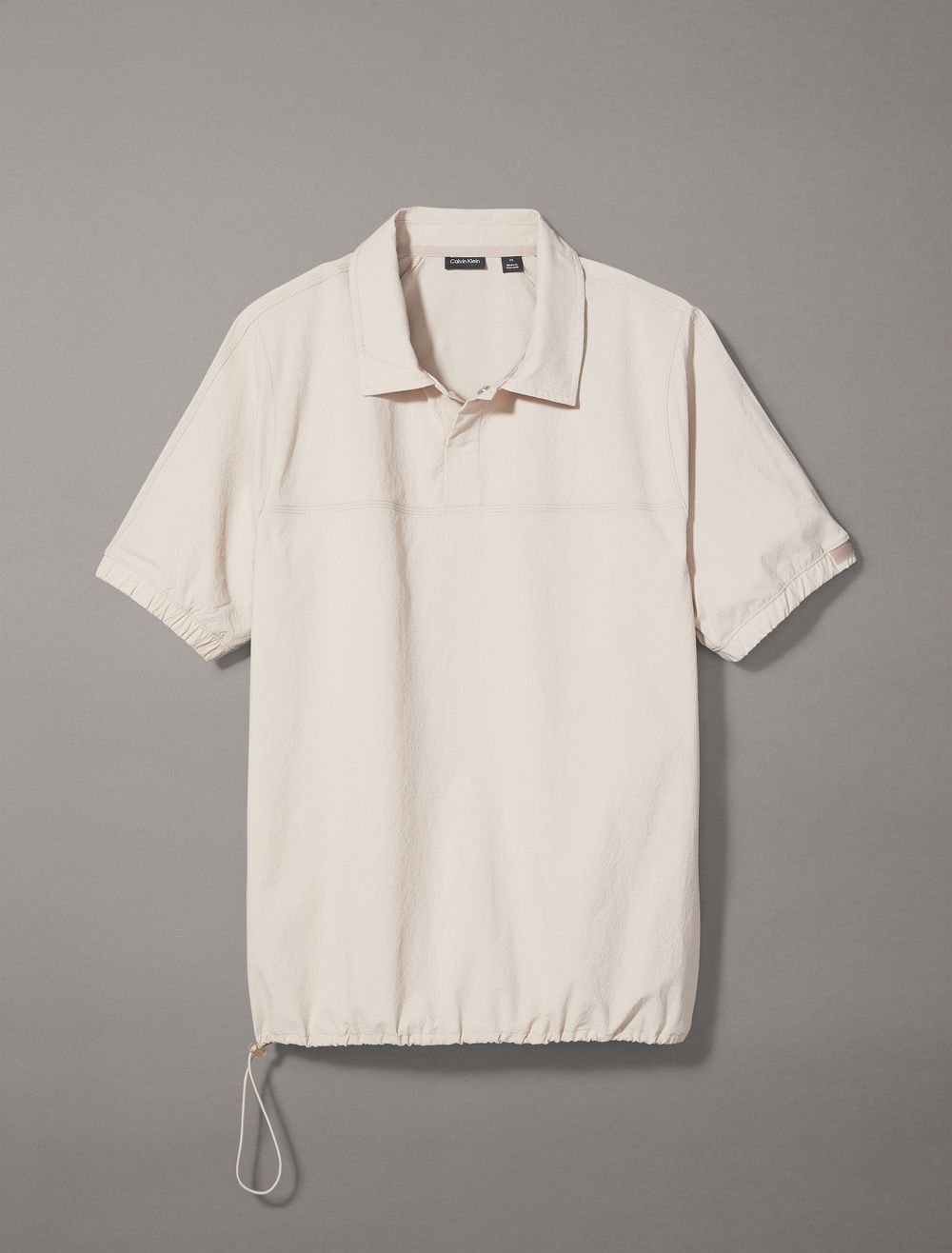 Constructed from cooling, moisture wicking fabric, this polo shirt is designed to support dynamic movement while maintaining comfort and breathability. Created with elastic sleeve cuffs and an adjustable drawstring at the hem. Detailed with snap button closures at the collar.- Constructed from moisture wicking fabric for added breathability