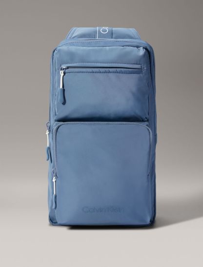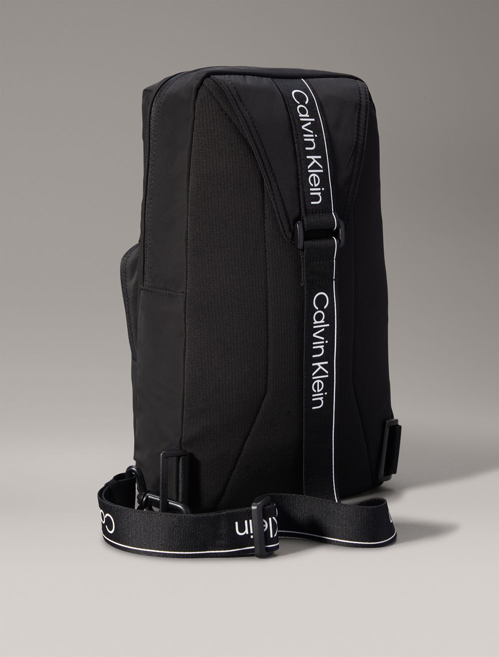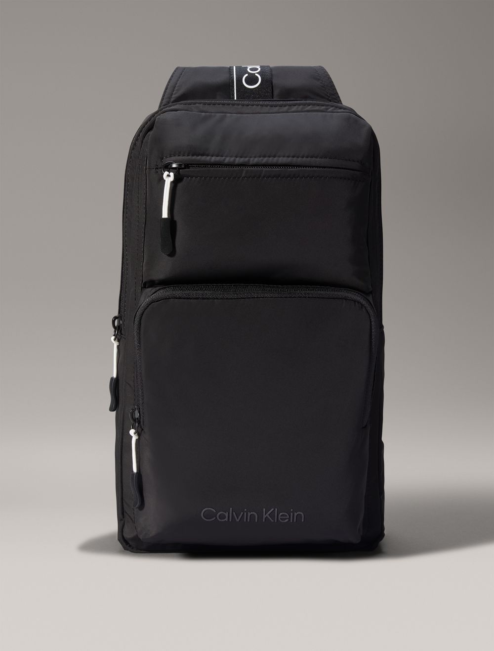 Crafted from 100% recycled polyester, this sling bag is made with reduced environmental impact. Detailed with a zip closure at the main compartment and two front zip pockets. Designed with an adjustable logo shoulder strap and tonal Calvin Klein logo styling at one front pocket.- Zip closure at the main compartment