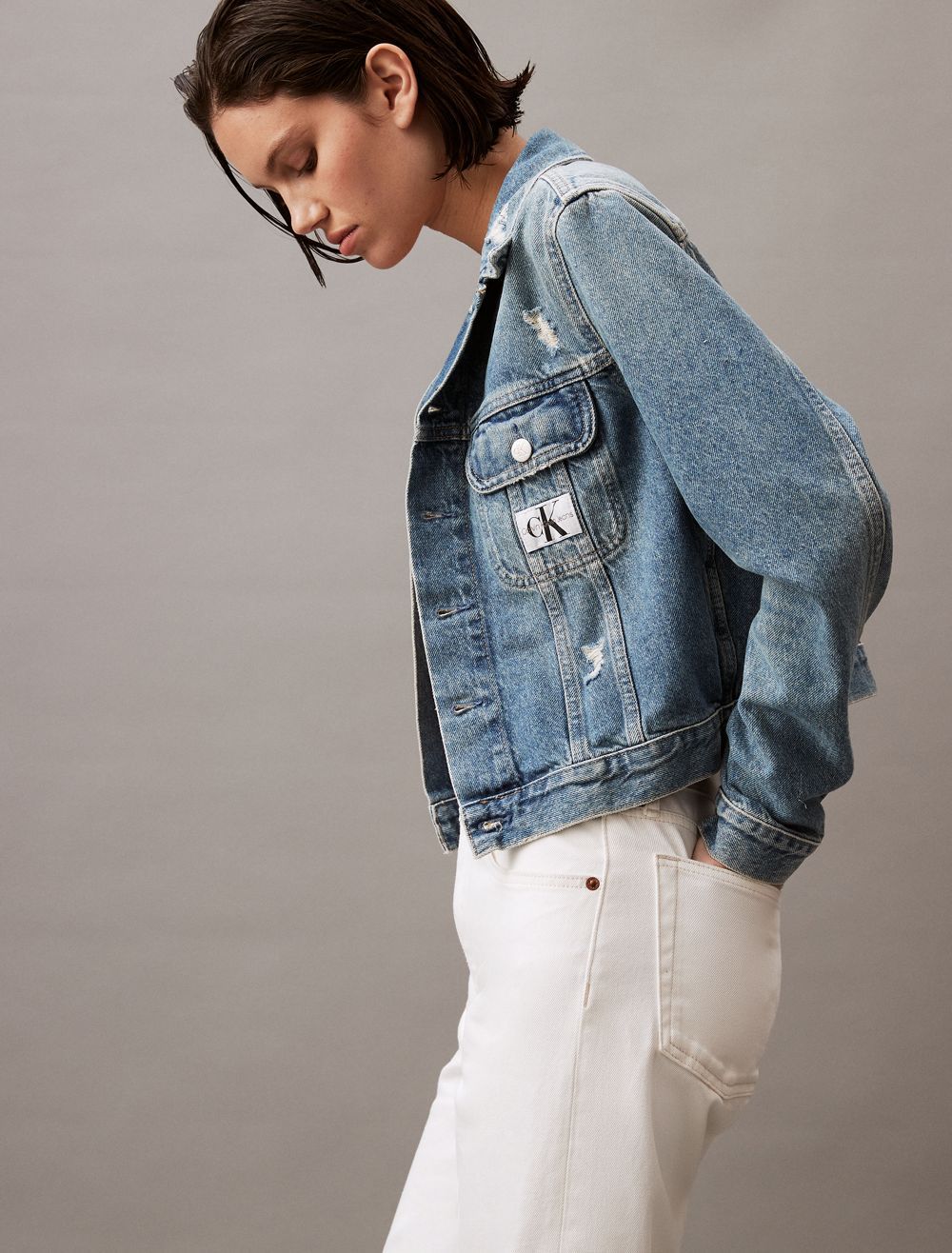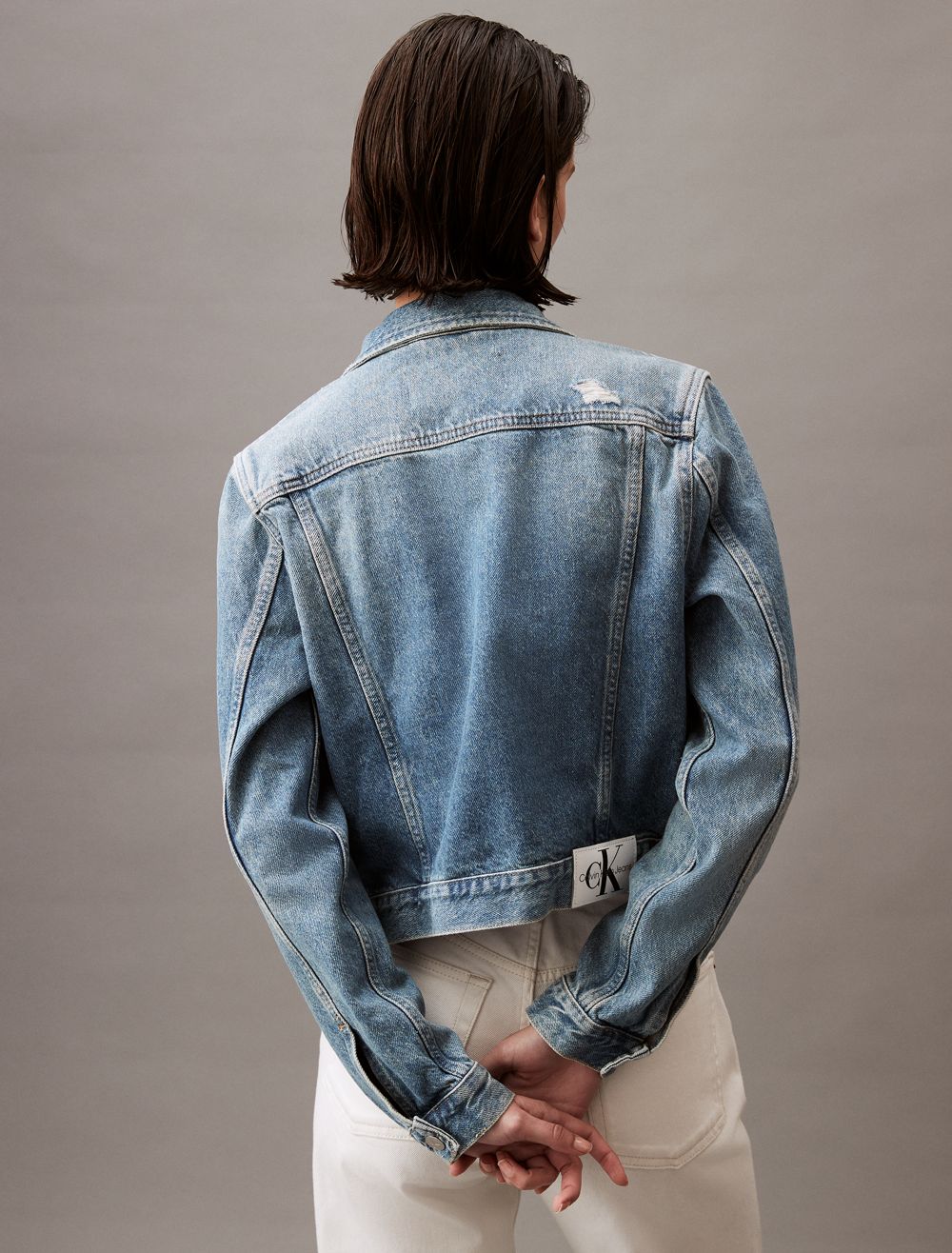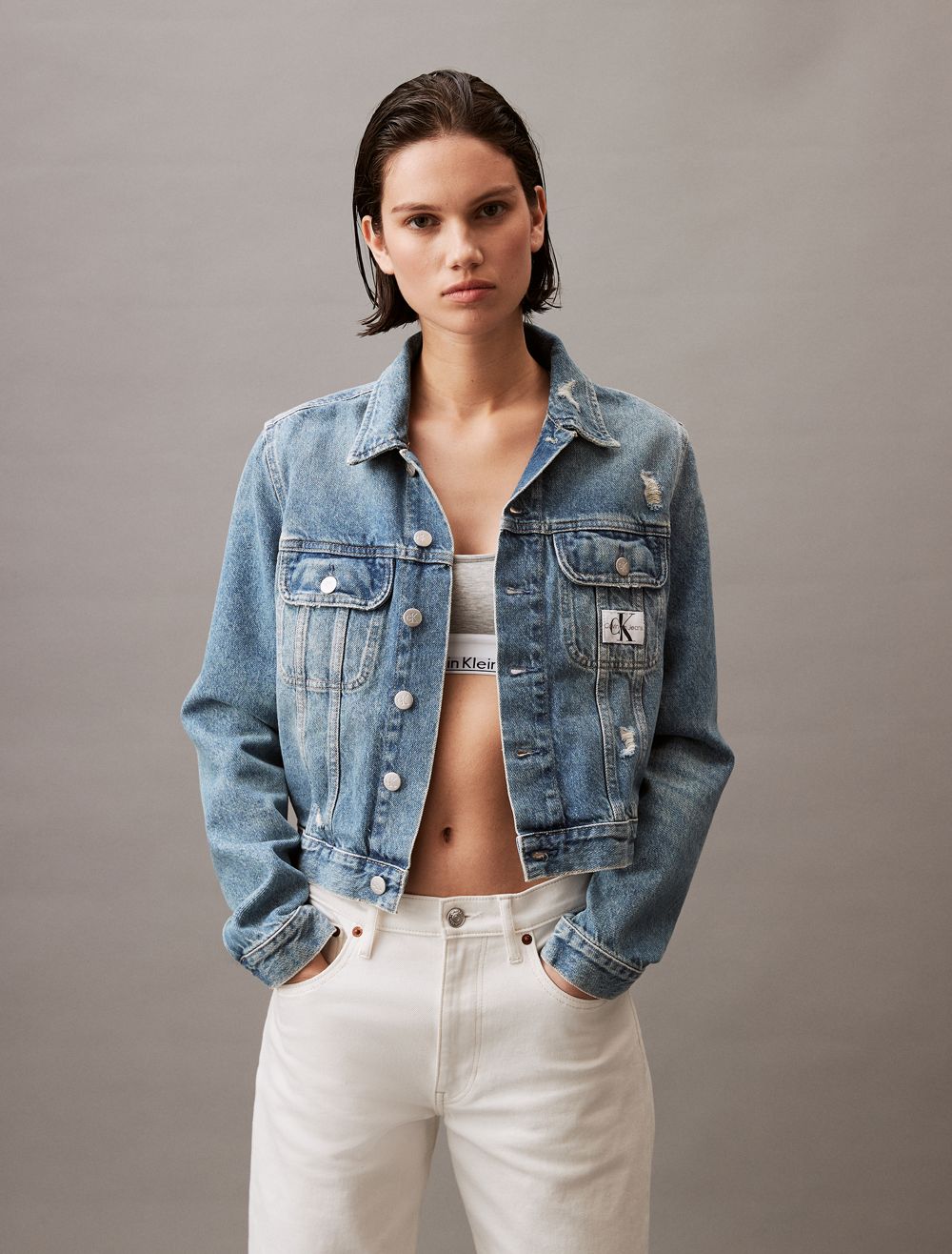 Cut in a cropped length, this denim jacket features a 90's-inspired silhouette. Made with long sleeves and a point collar with dual chest pockets. Crafted from recycled cotton for reduced environmental impact. Designed with button closures along the front and finished with topstitching details.- Cropped length