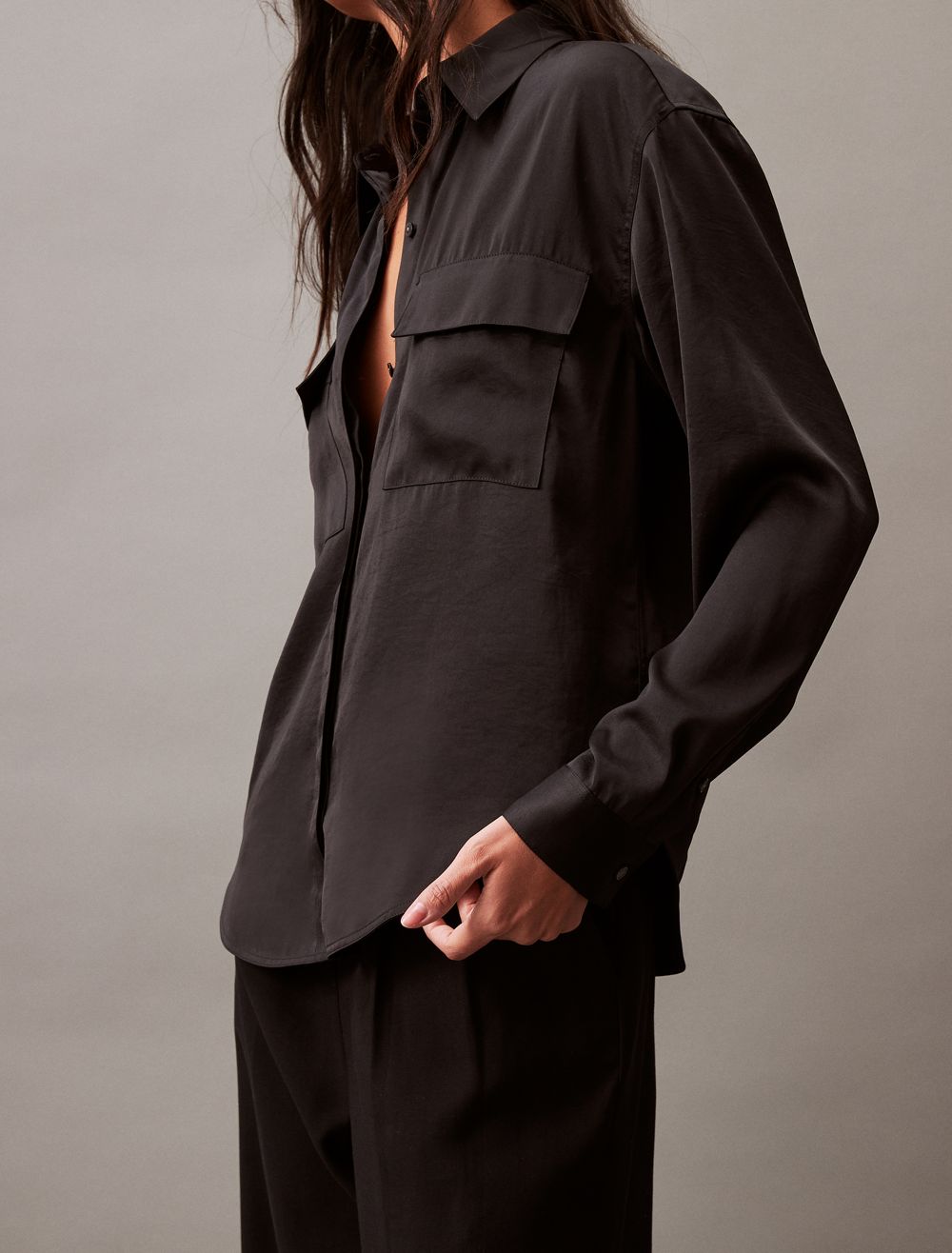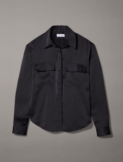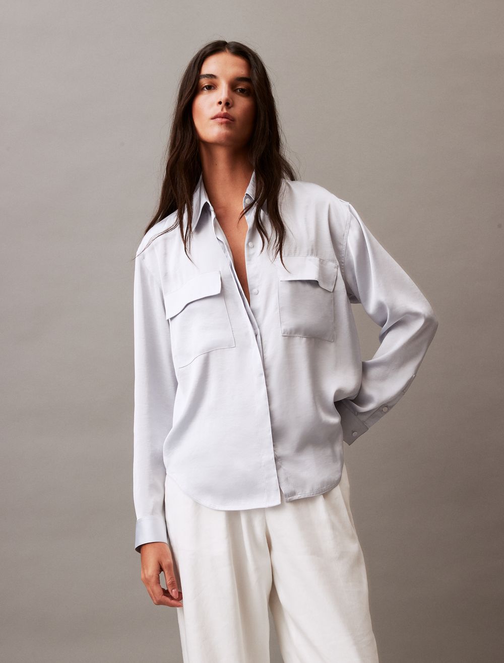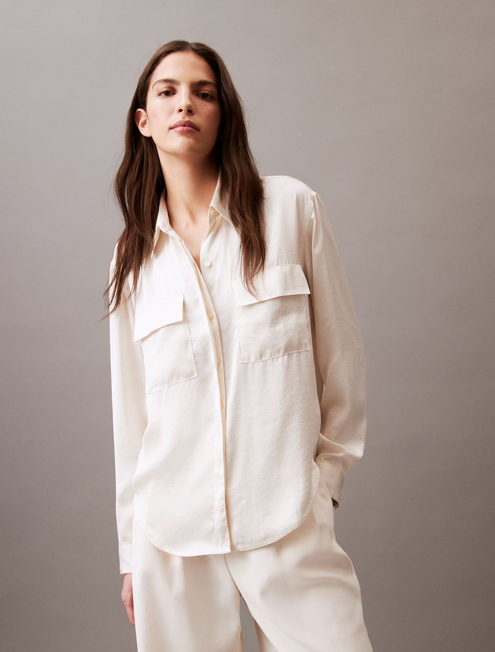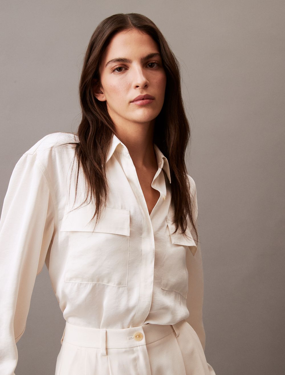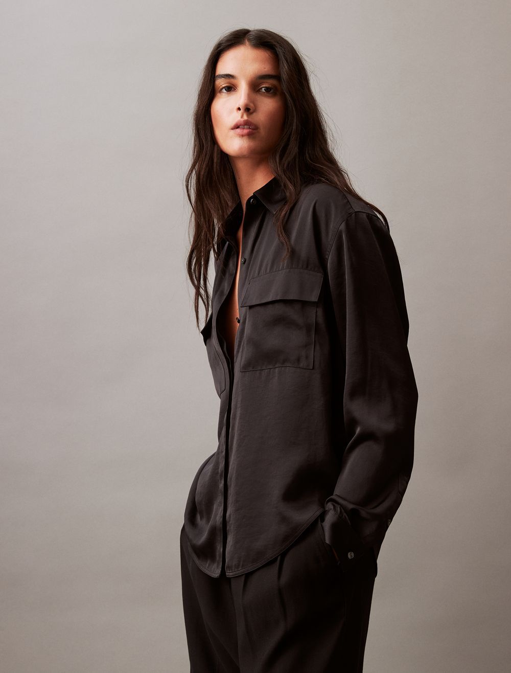 Crafted from smooth, lustrous satin, this button-down shirt appears elegant tucked into pleated pants or left untucked and slightly unbuttoned. Designed with dual chest pockets and a concealed button placket.- Long sleeves + point collar