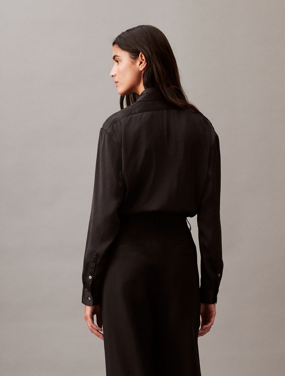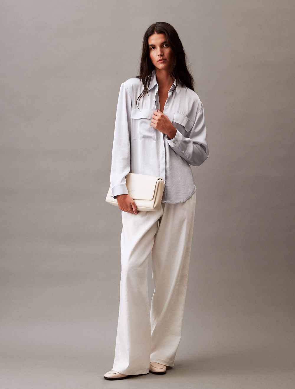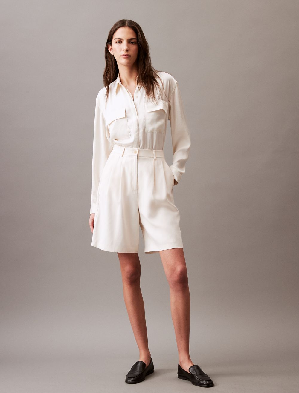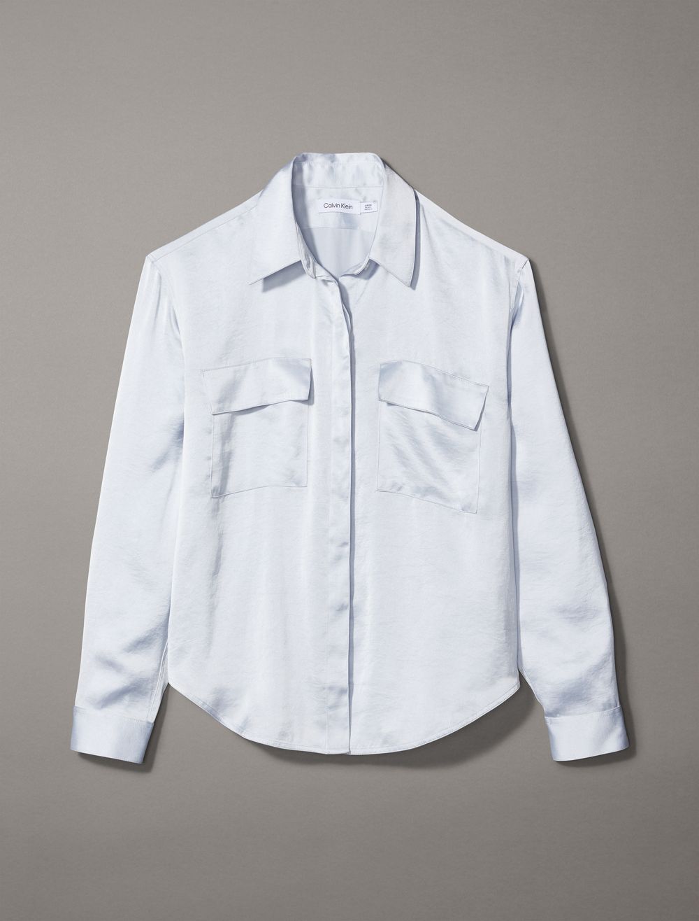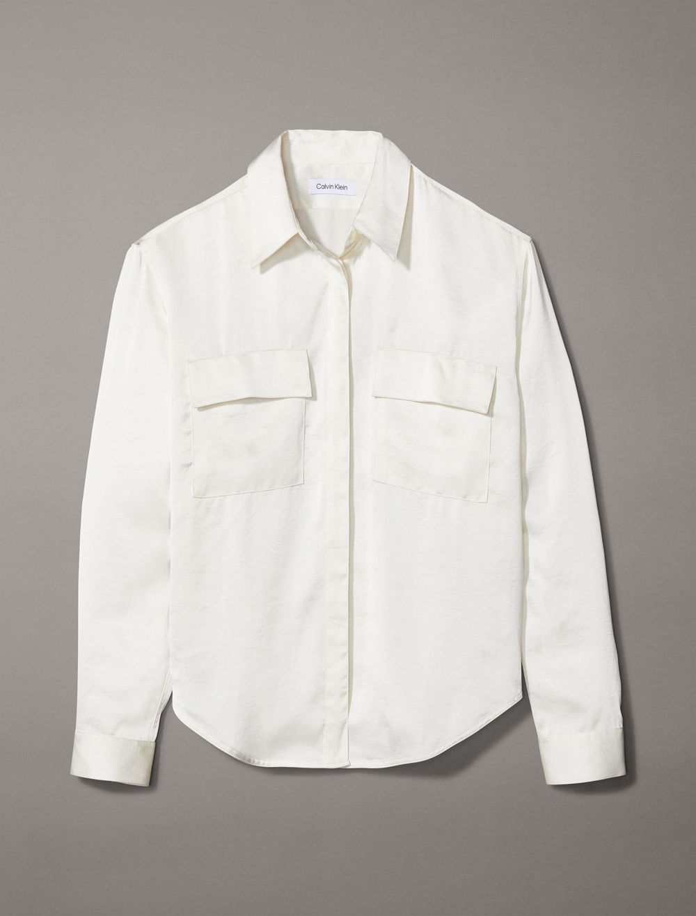 Crafted from smooth, lustrous satin, this button-down shirt appears elegant tucked into pleated pants or left untucked and slightly unbuttoned. Designed with dual chest pockets and a concealed button placket.- Long sleeves + point collar