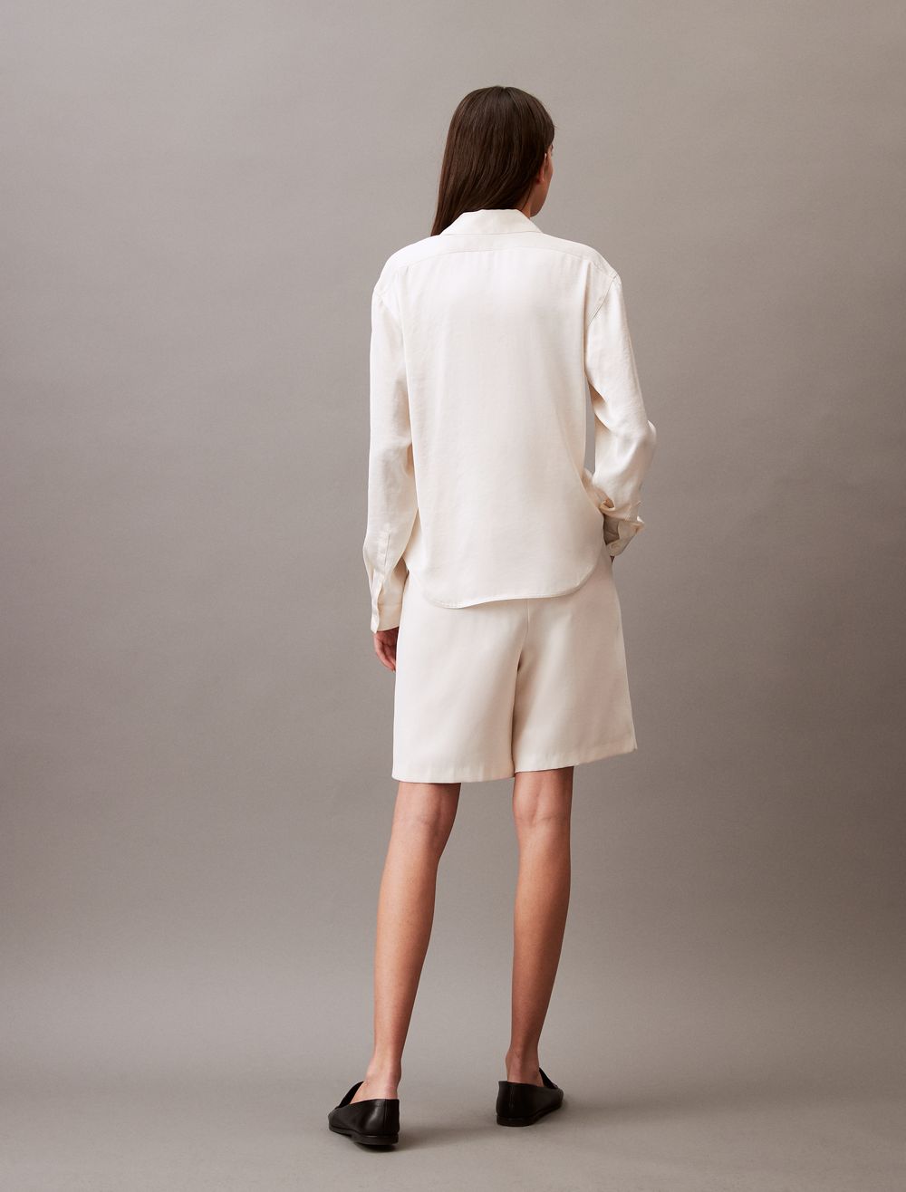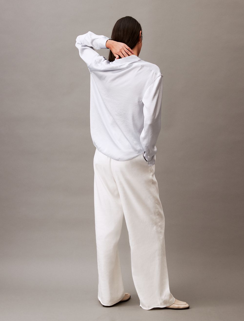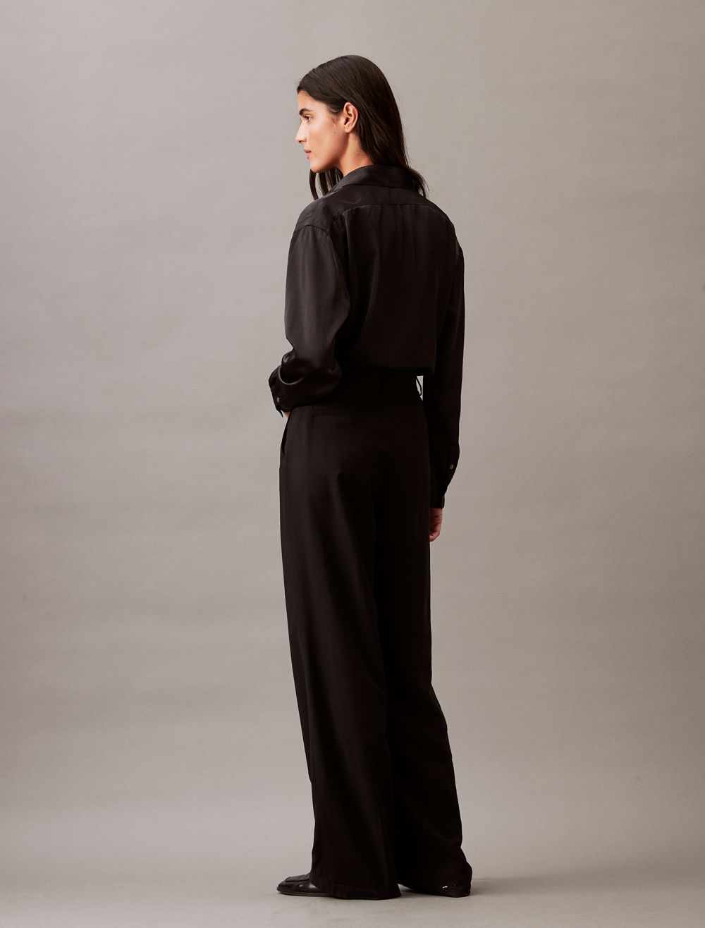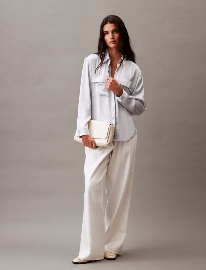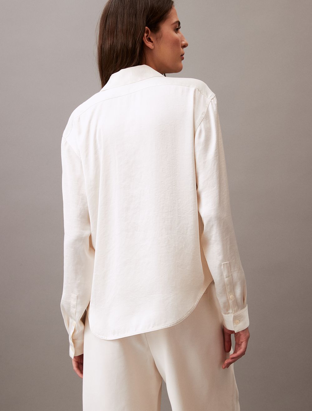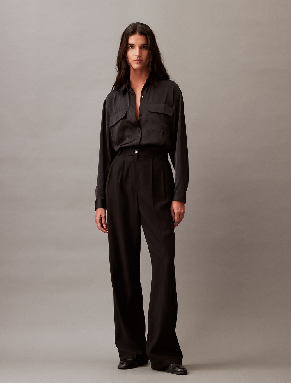 Crafted from smooth, lustrous satin, this button-down shirt appears elegant tucked into pleated pants or left untucked and slightly unbuttoned. Designed with dual chest pockets and a concealed button placket.- Long sleeves + point collar