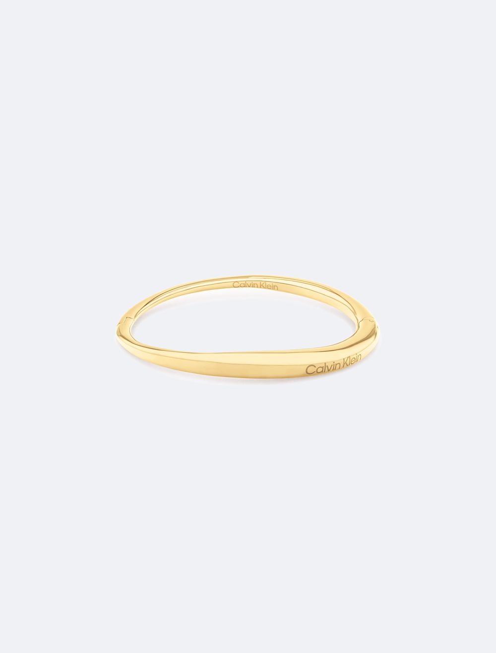 Sculpted sophistication. Crafted from polished stainless steel, this bracelet features a water droplet-inspired shape. Made with a hinge closure and finished with an engraved CK logo.- Offered in stainless steel or gold plating