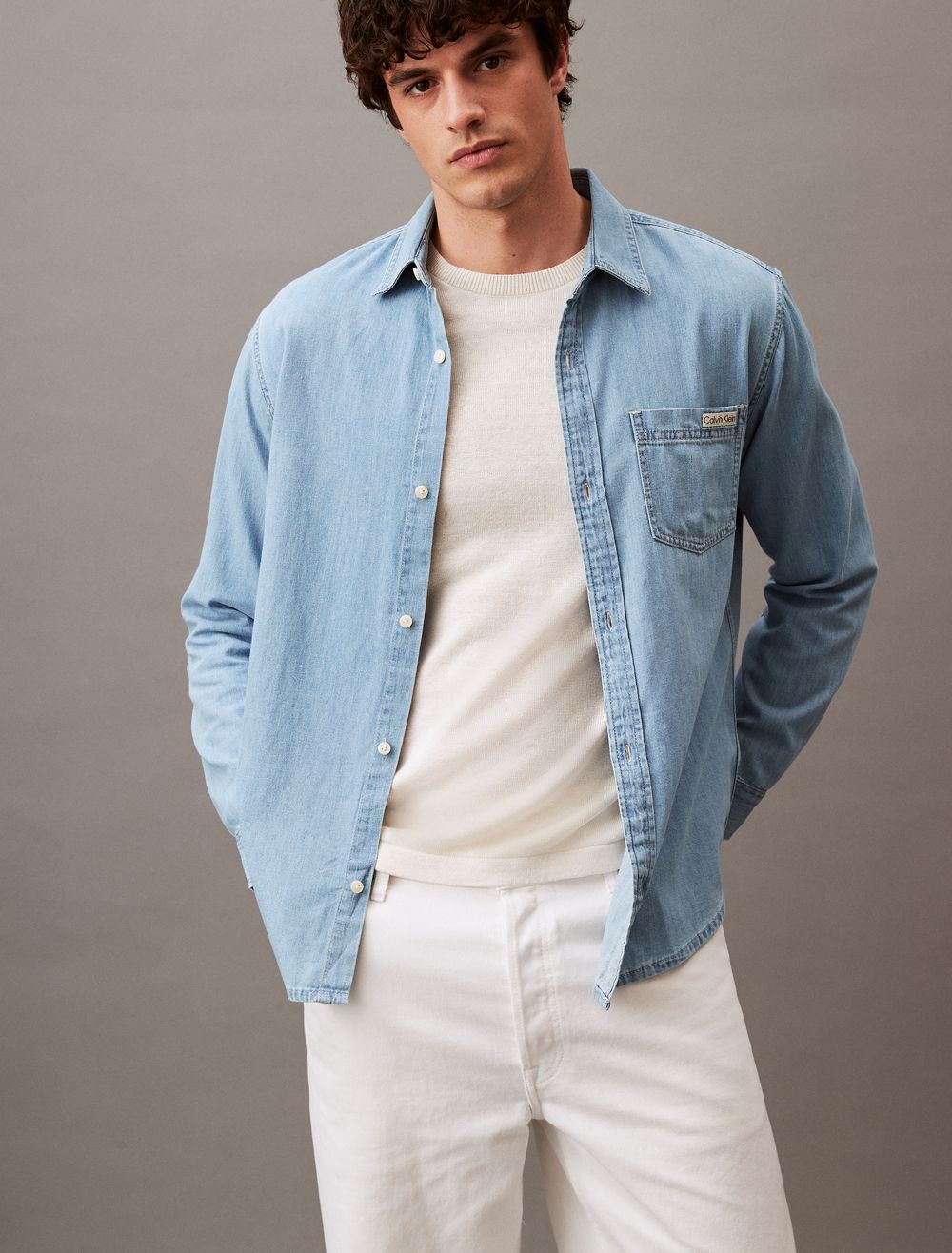 Crafted completely from cotton, this denim button-down shirt is a lightweight layer above classic outfits. Styled with long sleeves and a point collar. Designed with a patch pocket at the upper chest and finished with topstitching details.- Long sleeves + point collar