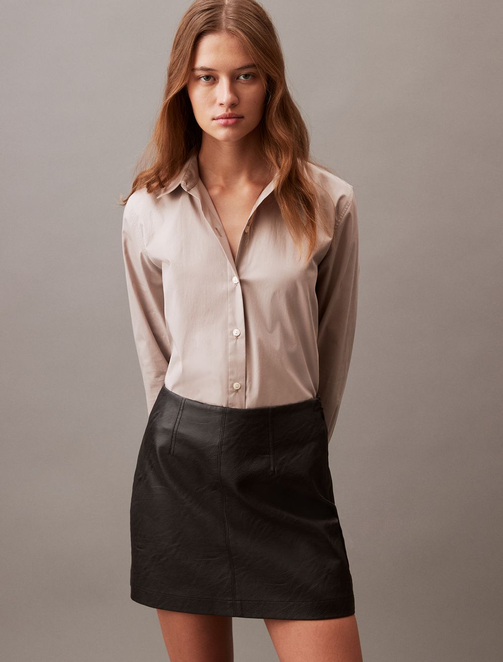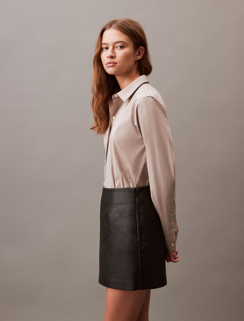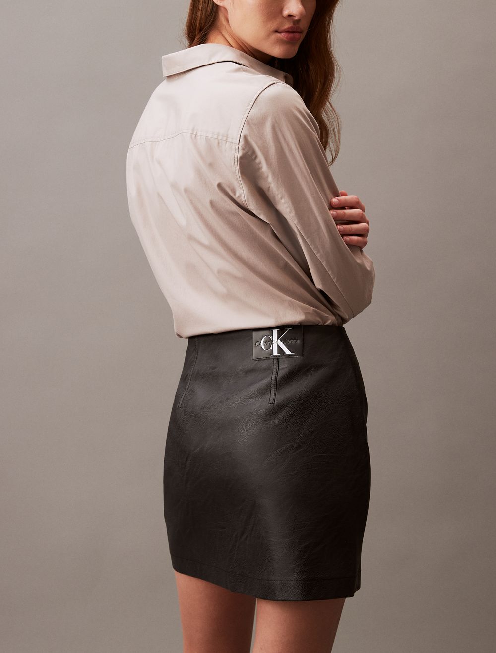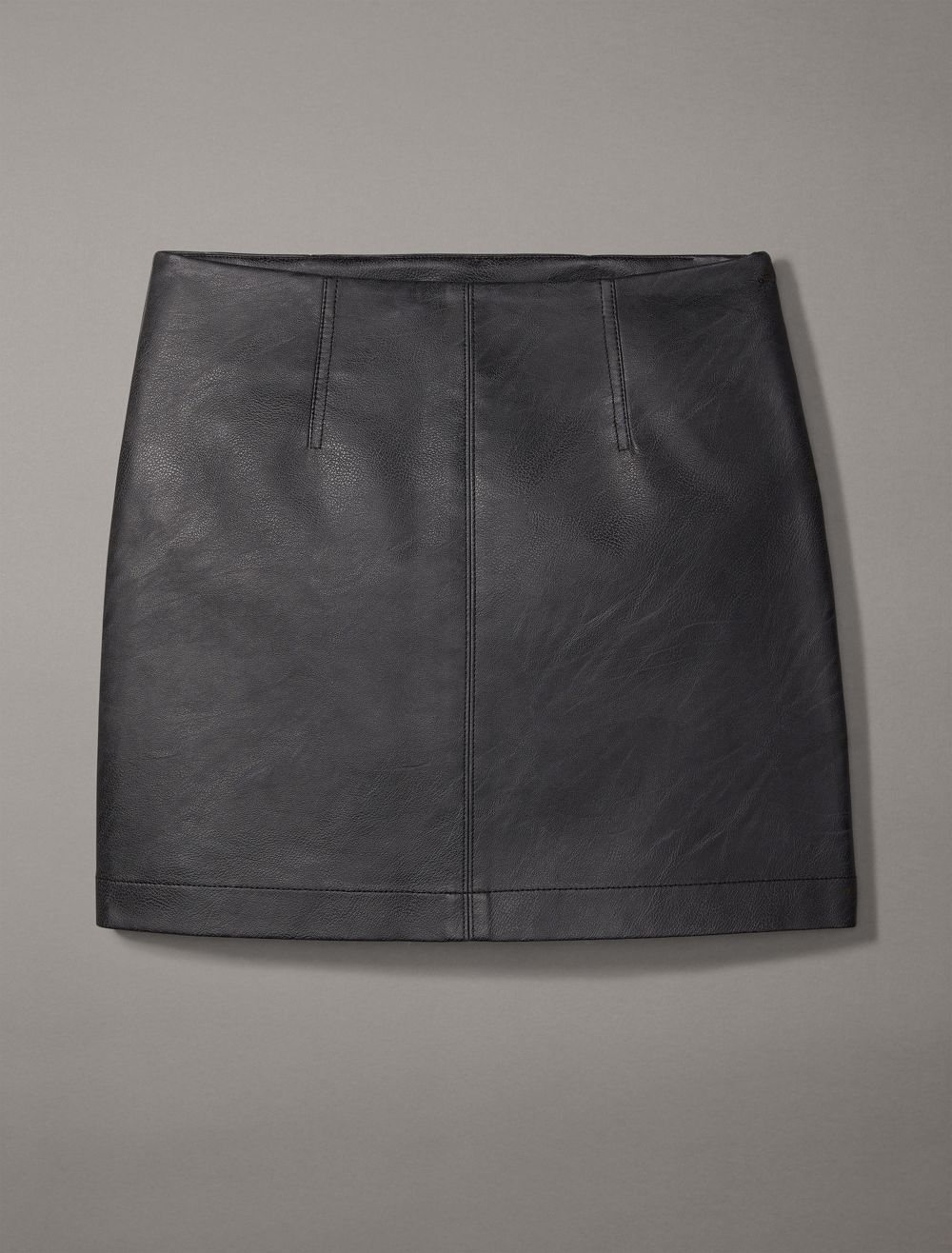 Crafted from faux leather, this miniskirt has a slim, fitted shape and a high rise waist. Detailed with seaming lines and topsitching accents. Finished with a CK monogram logo patch at the back waist.- Slim, fitted silhouette