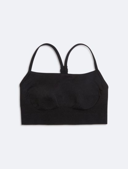 Defined with a smooth seamless knit, this sports bra is designed to support flexible, dynamic movement. Created with adjustable shoulder straps for a personalized fit. Styled with a scoopneck and made with a fine ribbed texture.- Seamless knit