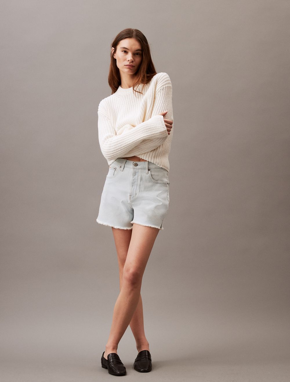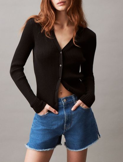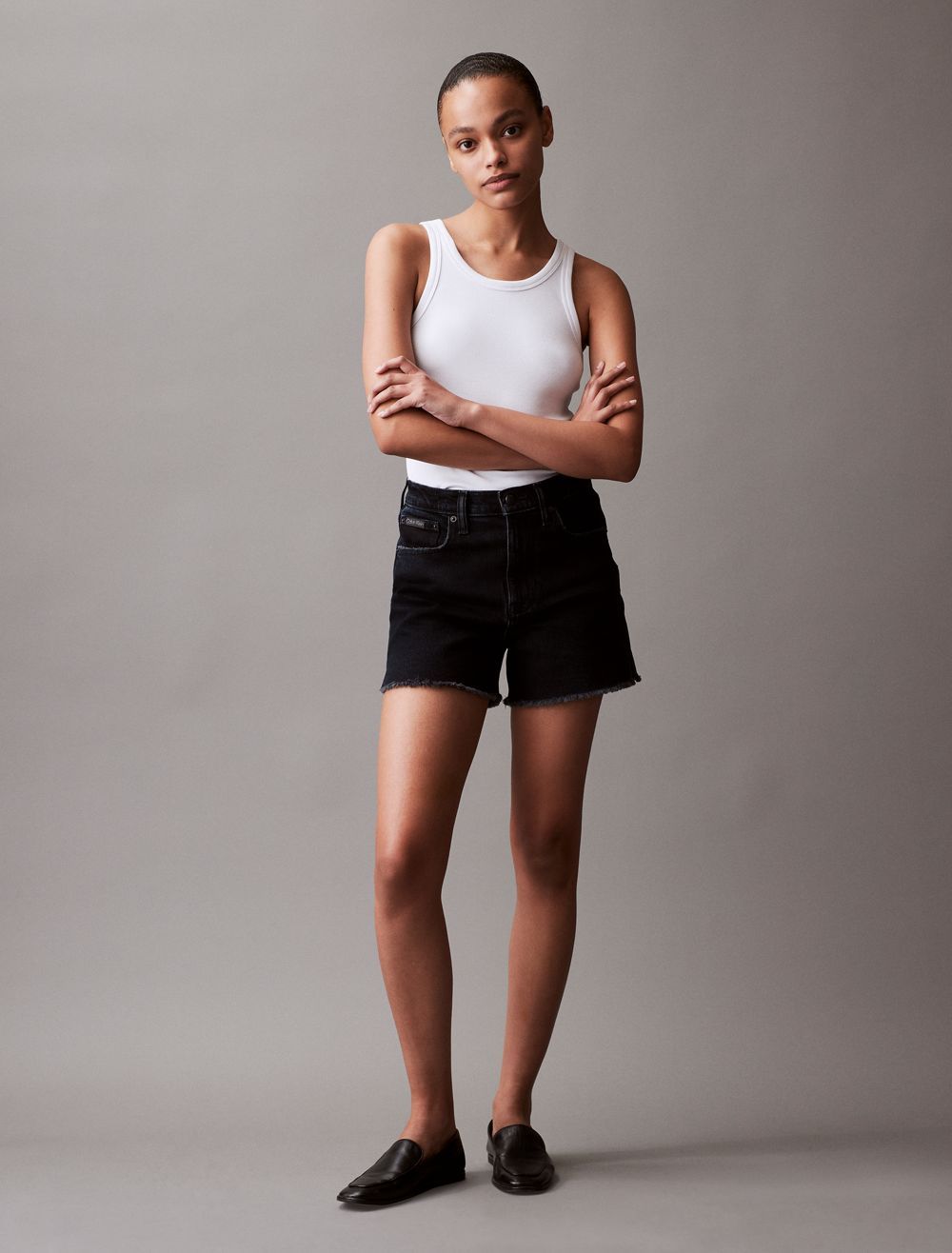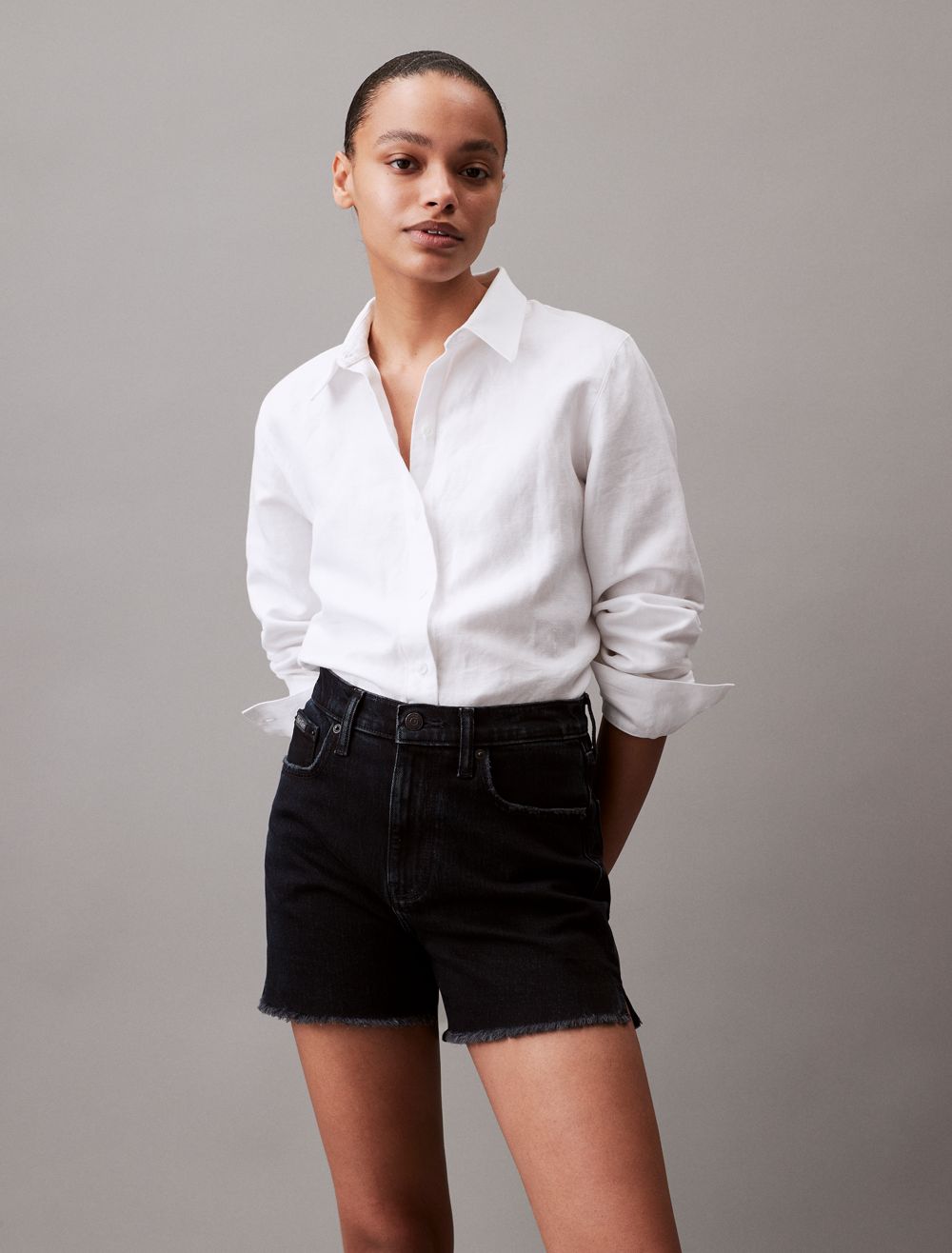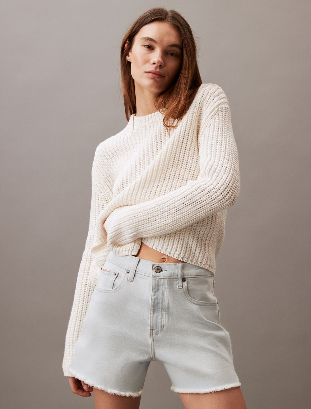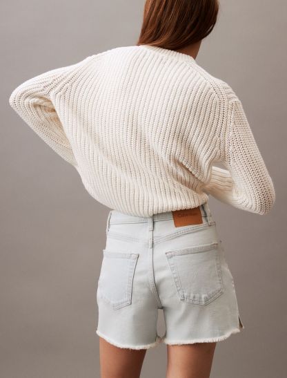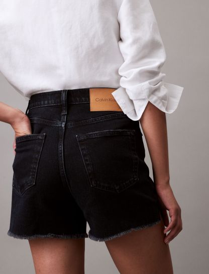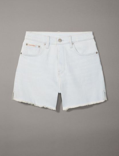 Cut with a high rise waist, these shorts are crafted from cotton-stretch denim for an effortless fit. Detailed with distressed styling at the hem and designed with slip pockets at both sides. Finished with a CK logo patch at the back waist.- High rise waist
