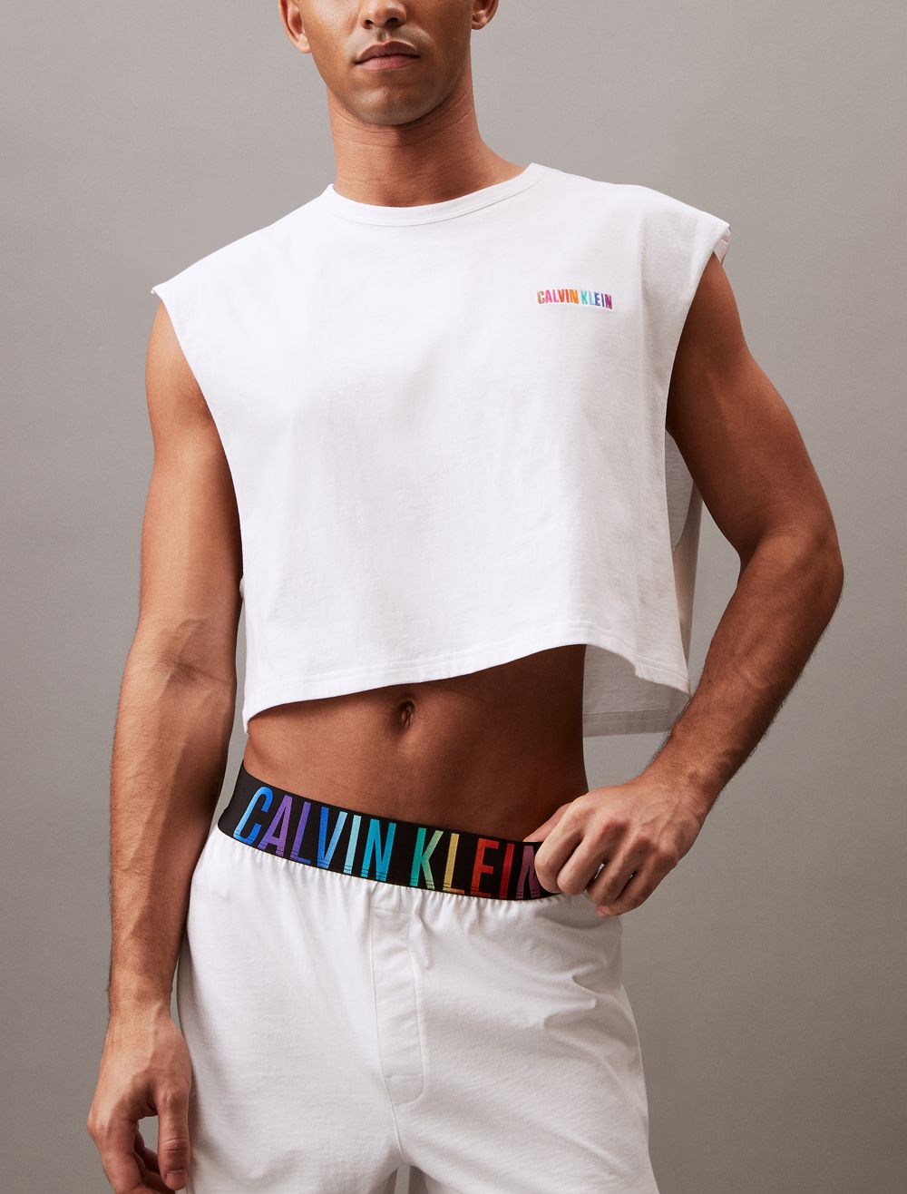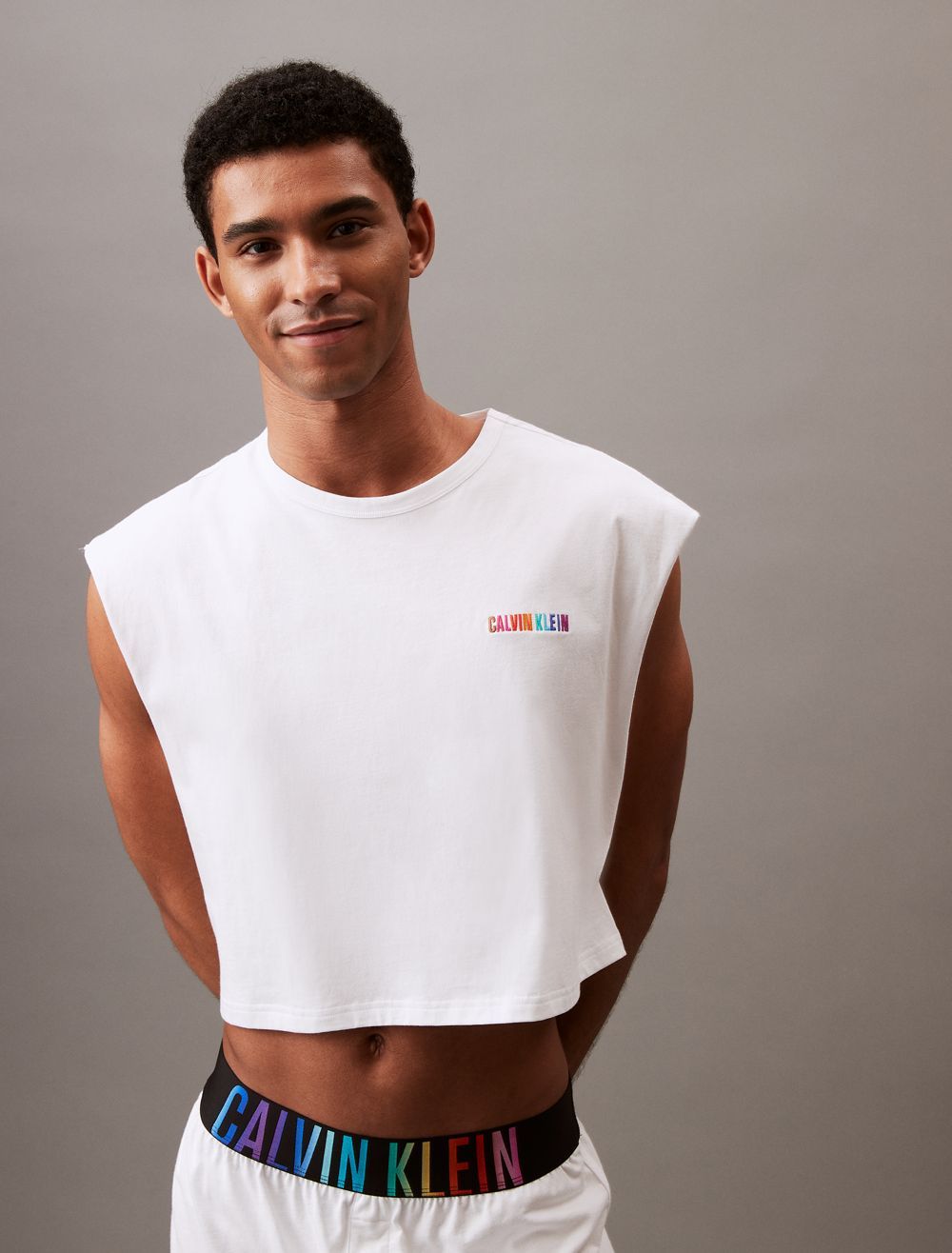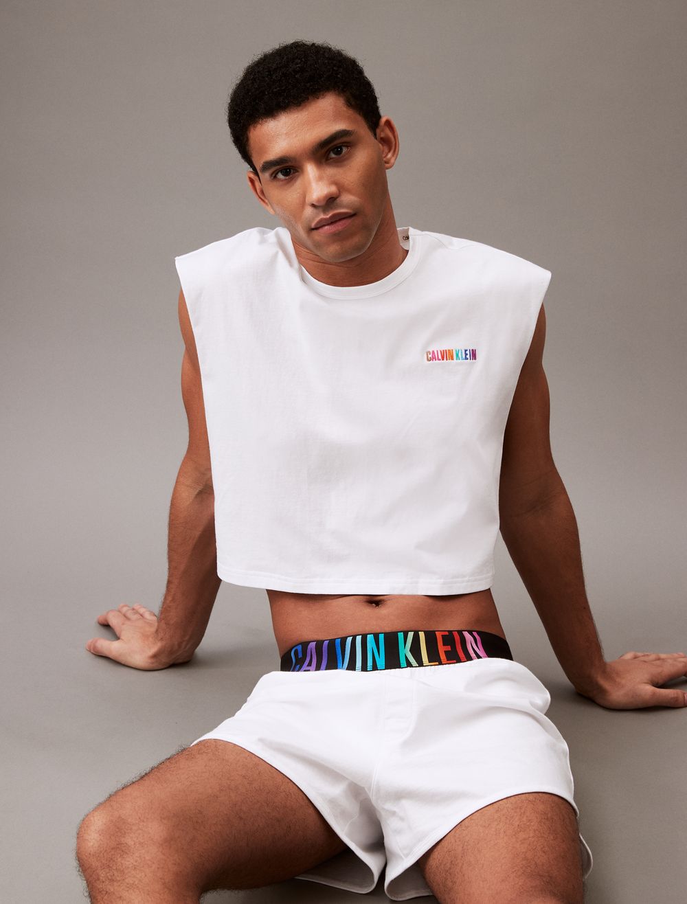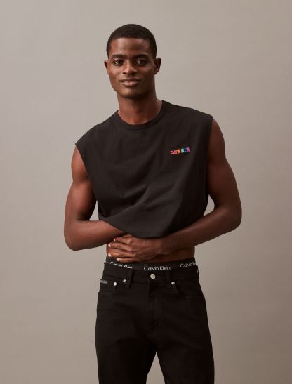 Wear it with Pride. A bold iteration of our iconic logo with maximum comfort and enhanced movement. This Calvin Klein tank is made completely from soft organic cotton and cut in a cropped length.- Pride styling in a limited edition rainbow color palette