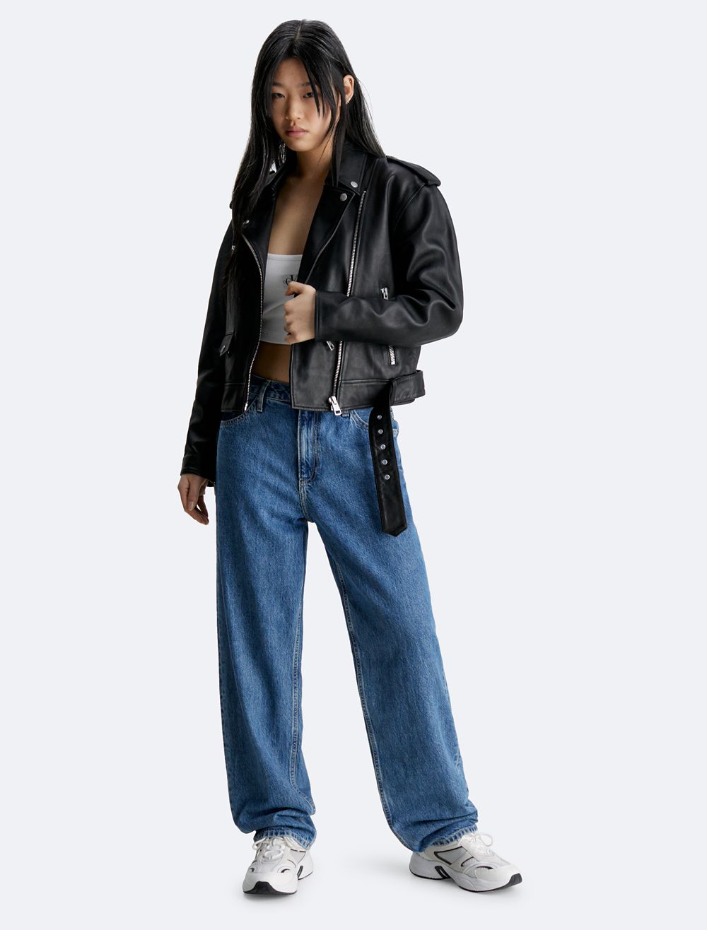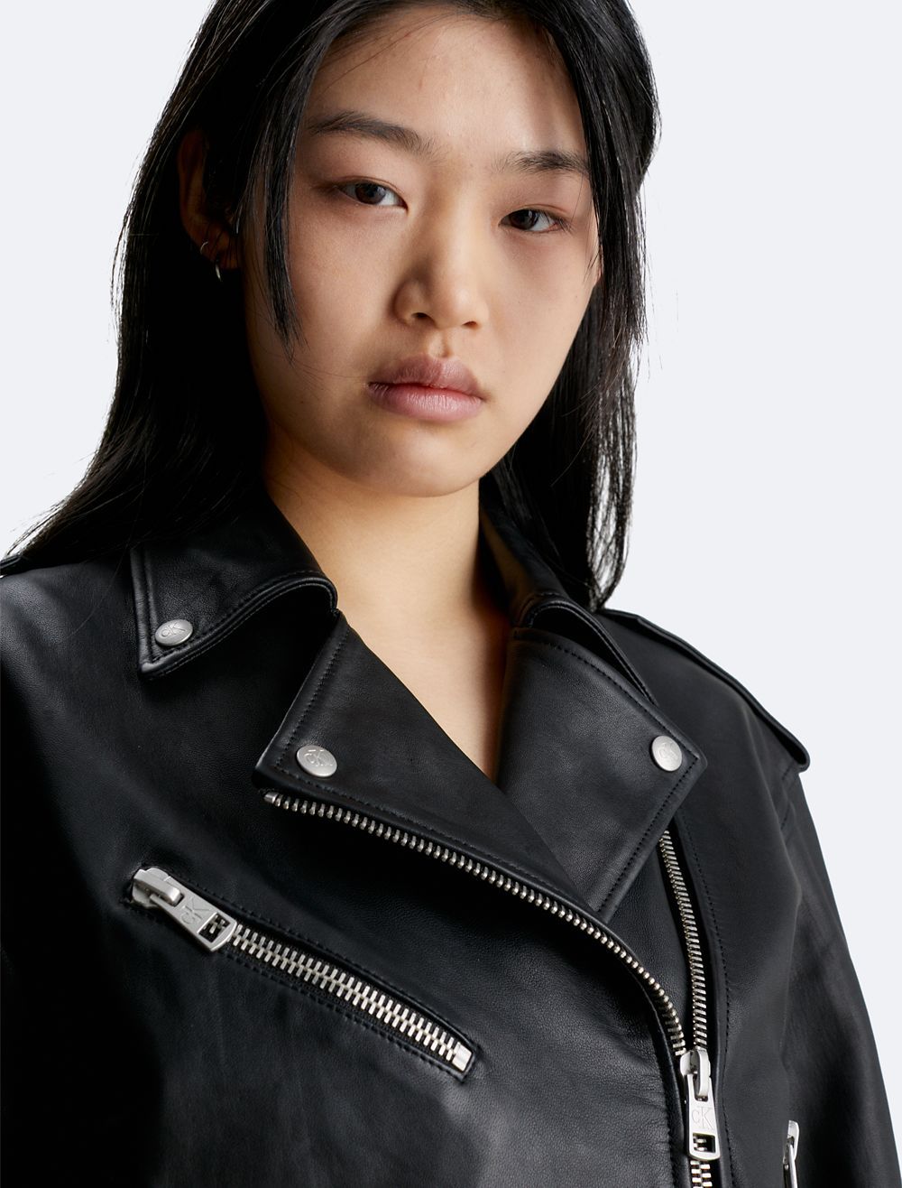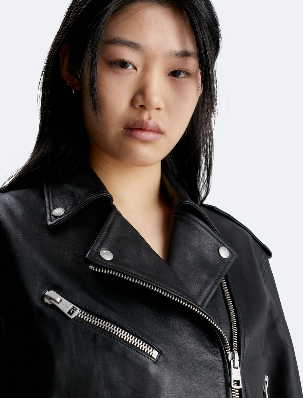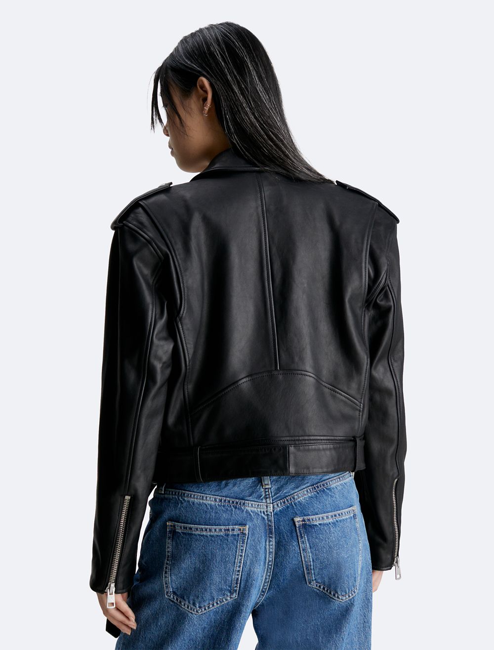 Synonymous with polished nonchalance and understated cool, the biker jacket continues to hold a classic status in curated wardrobes. Crafted completely from genuine leather, this rendition is made with an asymmetical zip closure and zip pockets at both sides. Detailed with metal hardware and an adjustable belt at the waist.- Long sleeves + biker collar