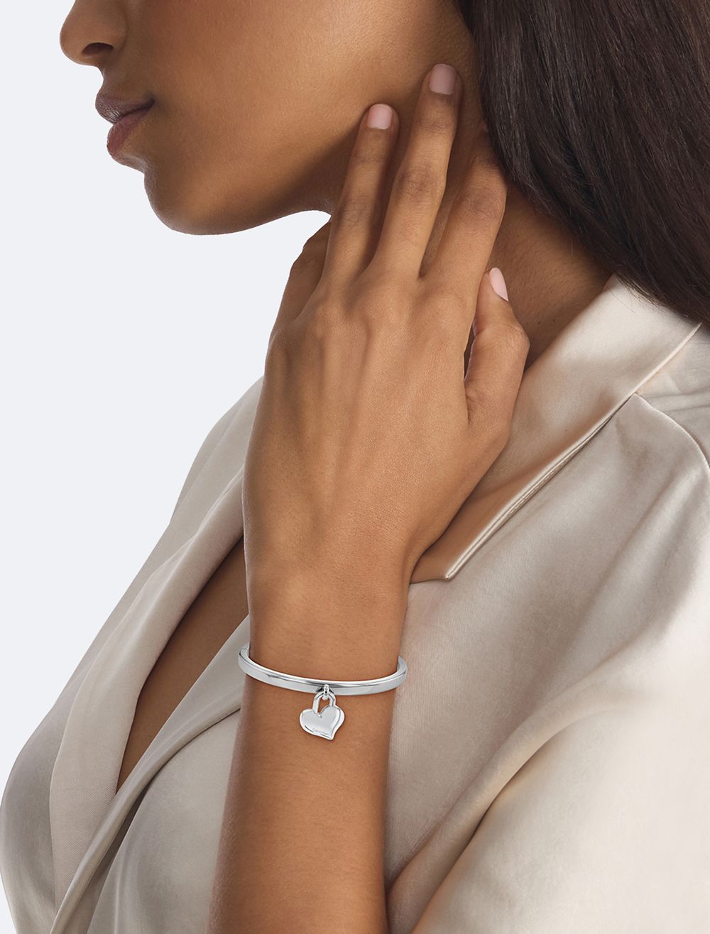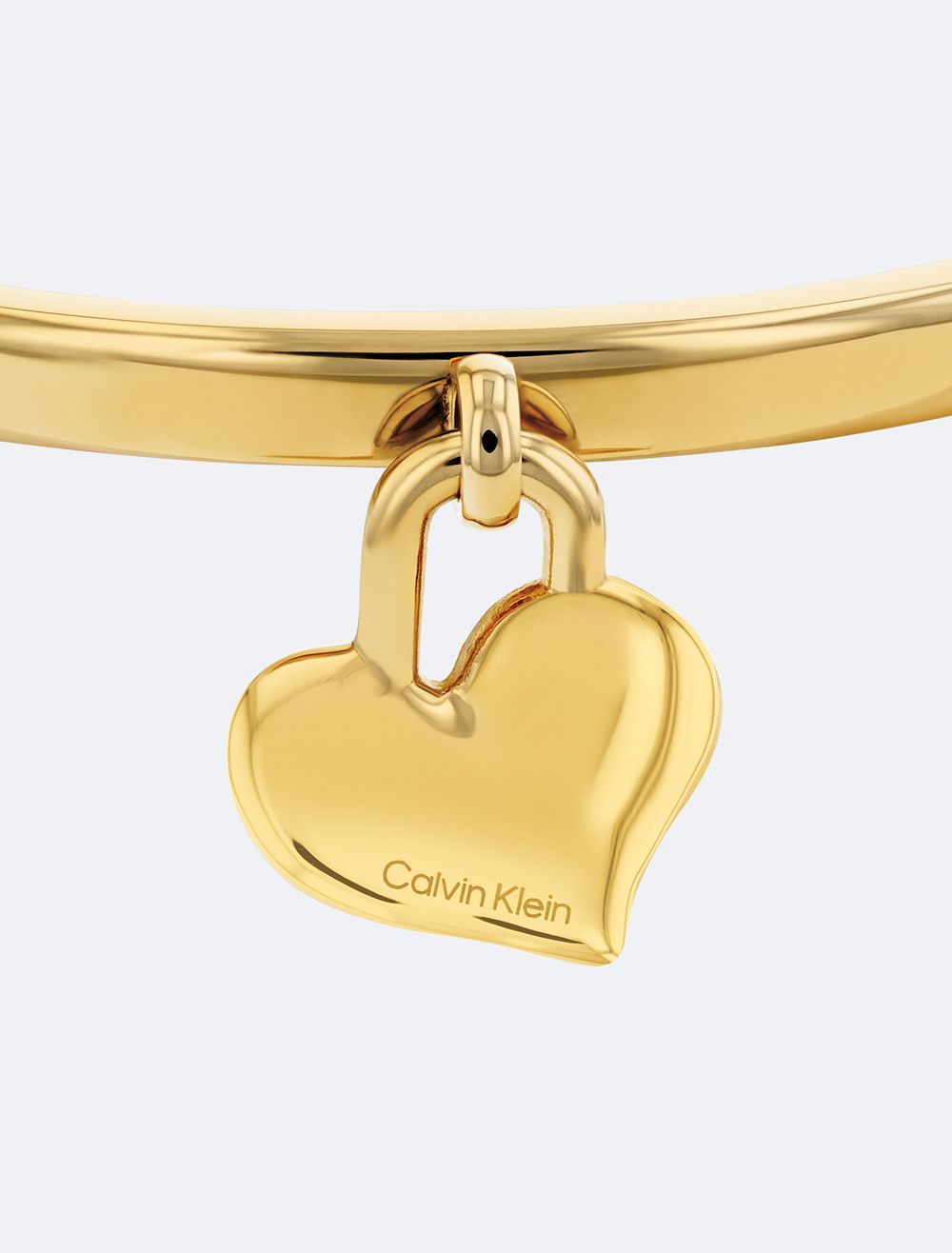 Feminine and sensual. Artfully sculpted asymmetric heart charm on a smooth, high polish bangle.- Polished stainless steel or gold plated