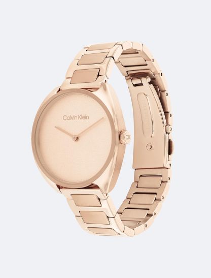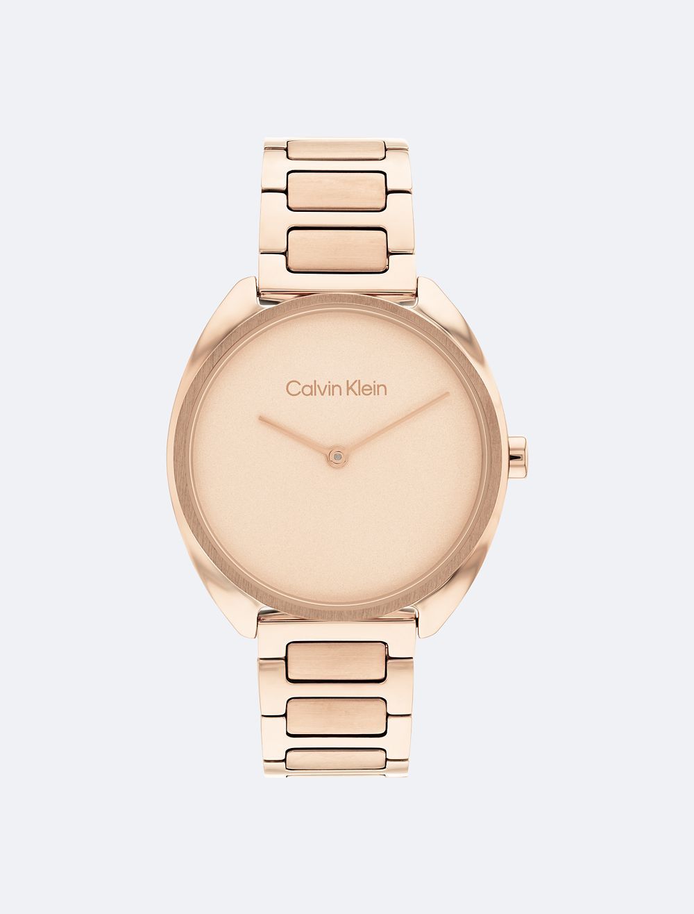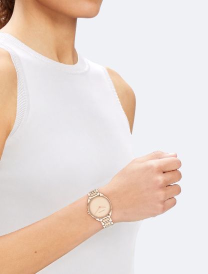 Understated feminine style. Softly elongated round shaped case paired with a minimalistic dial evokes a feeling of fluidity. Dual finish H-link bracelet.- Gold tone stainless steel case