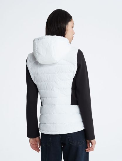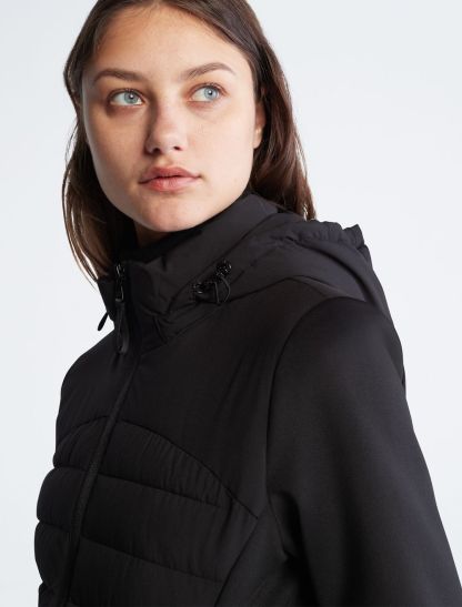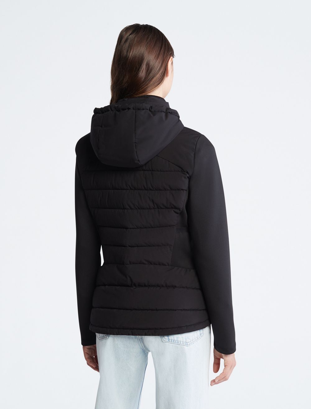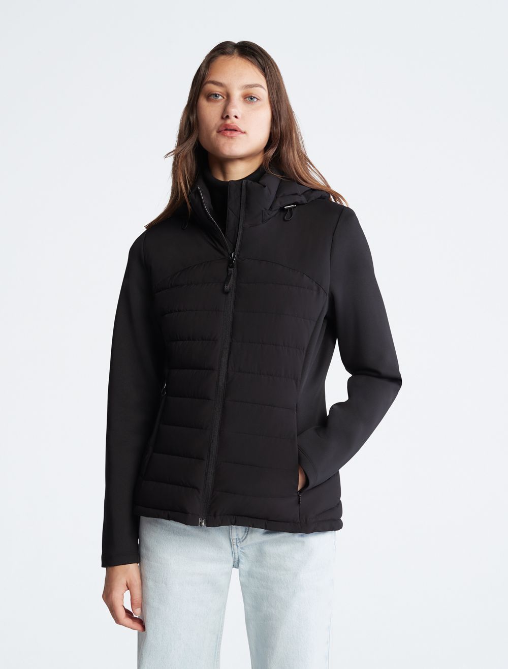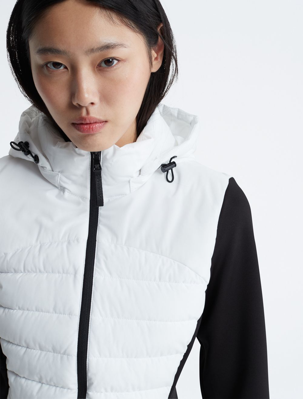 Made with a mixed media design, this jacket juxtaposes puffed styling at the chest with smooth texture along the sleeves. Created with a stand collar and a drawstring hood for full coverage in colder weather. Features a zip closure along the front and slip pockets at both sides.- Puffed styling at the chest