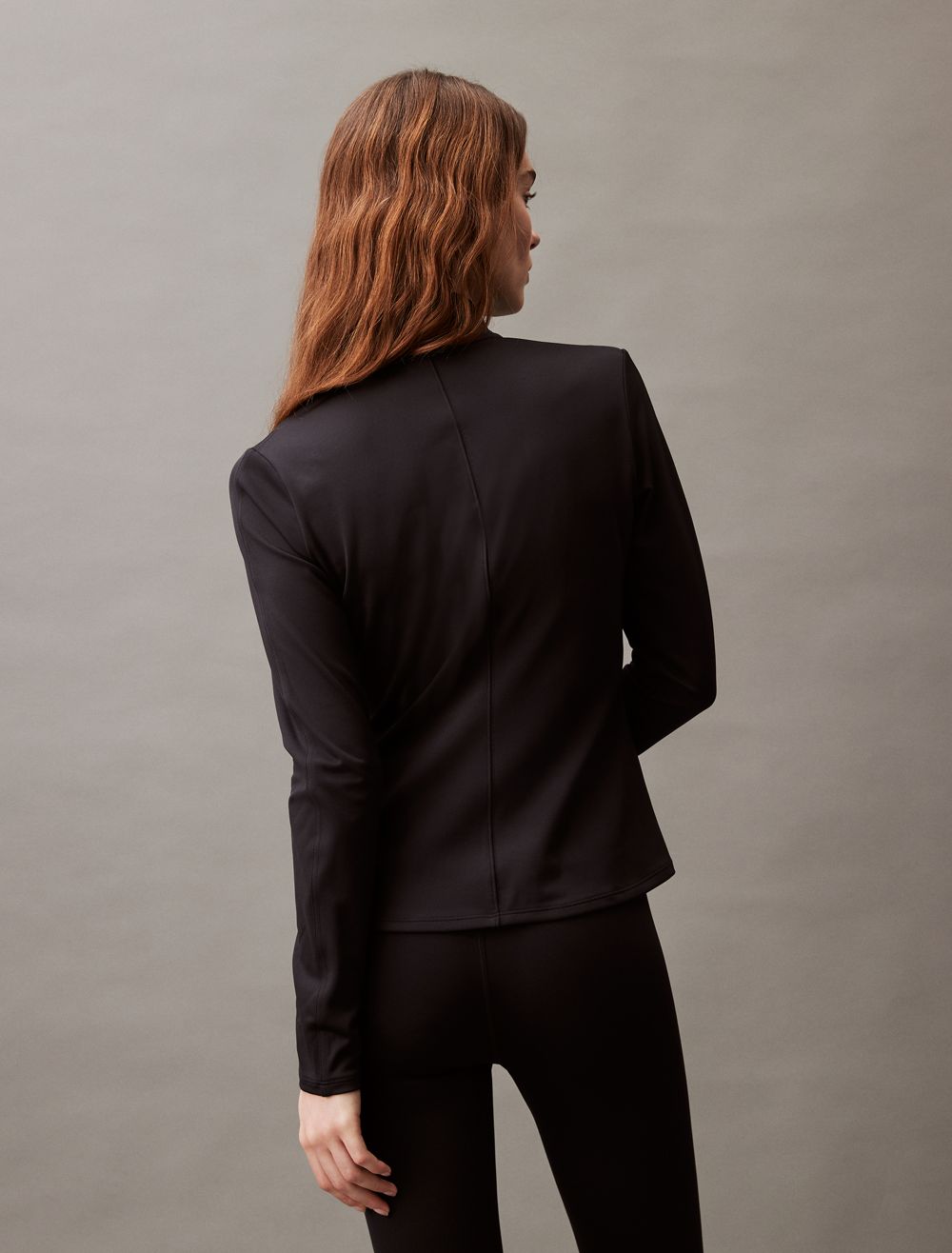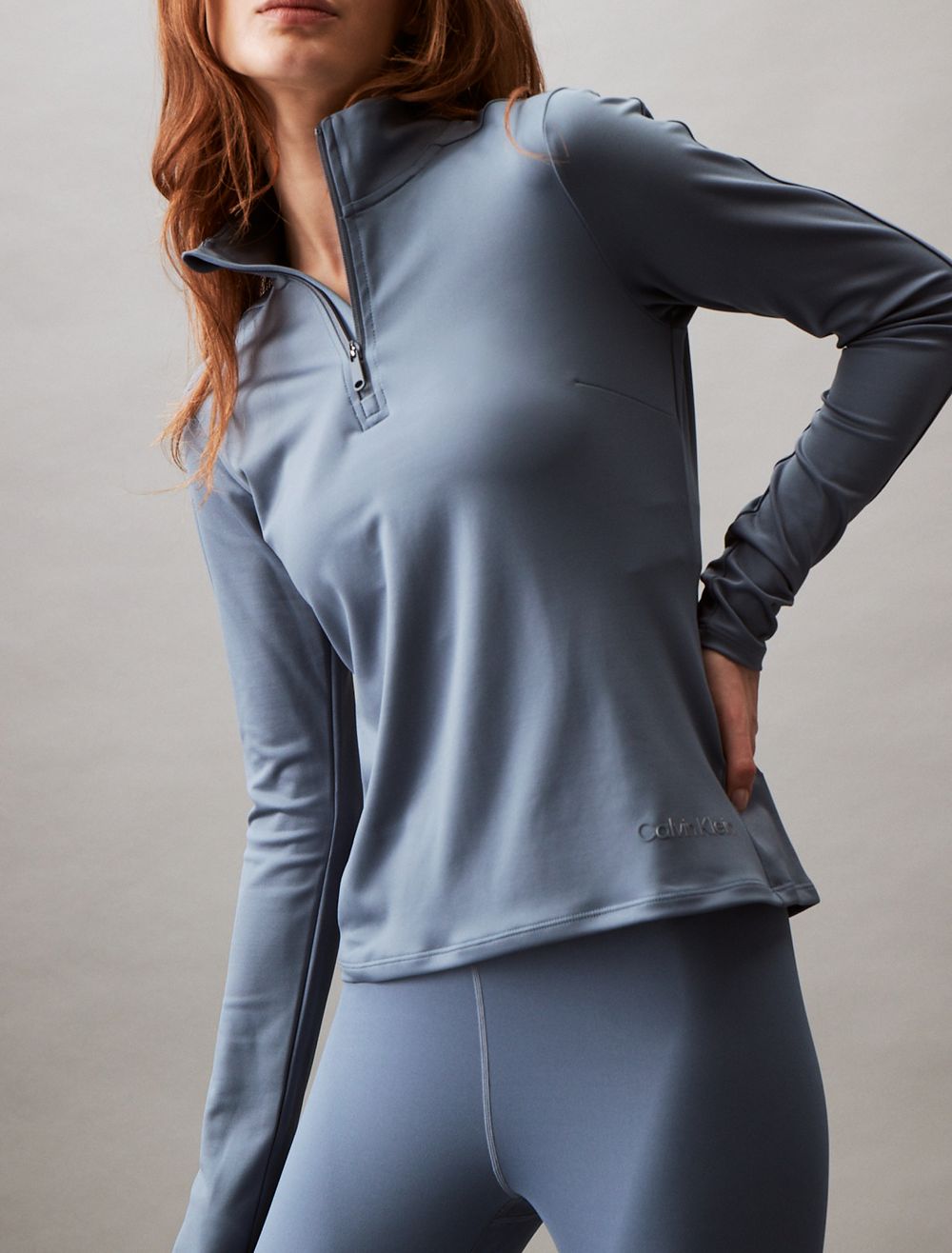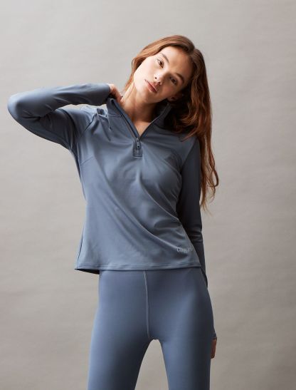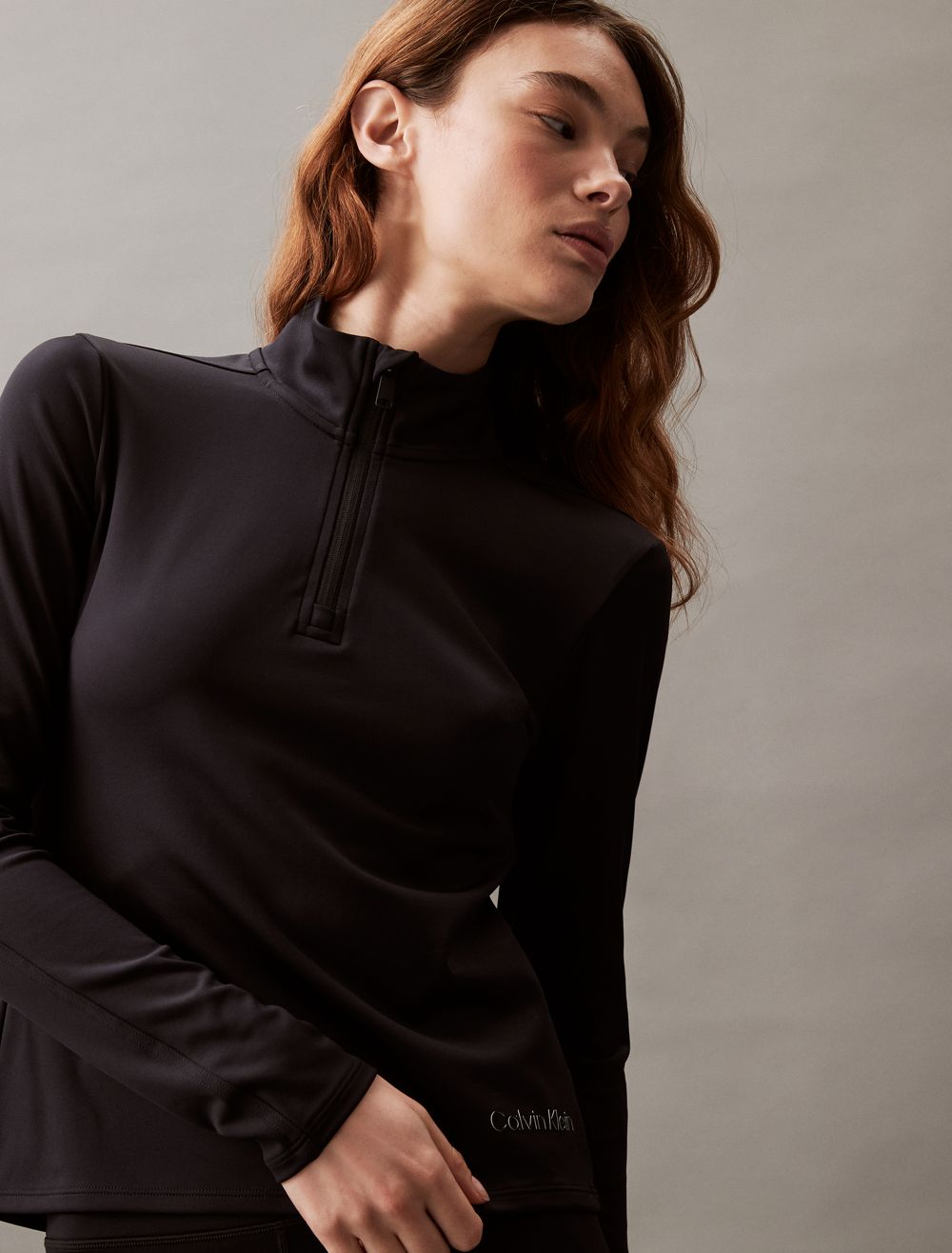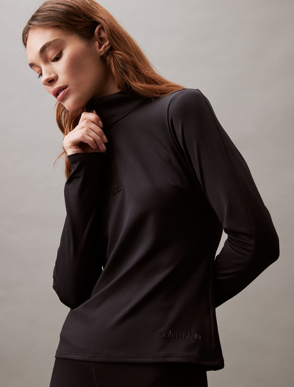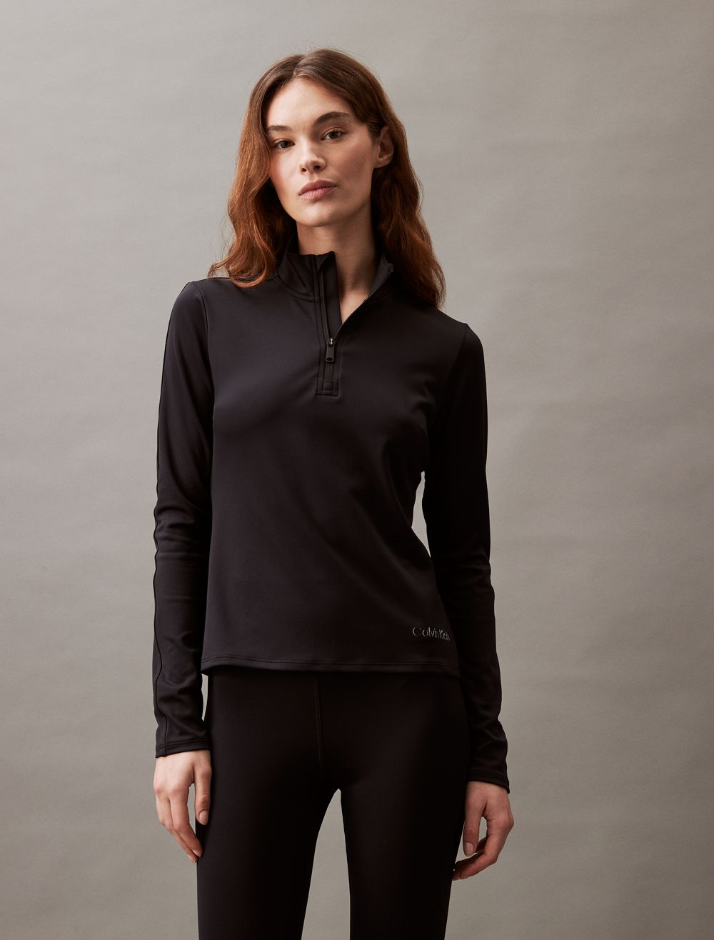 Featuring minimal, solid styling, this performance jacket is constructed from moisture-wicking fabric for total comfort and breathability during workouts. Created with a quarter zip closure and a mock neck. Defined with seaming lines for added shape and finished with a tonal CK logo detail near the hem.- Moisture wicking fabric to keep you cool + dry