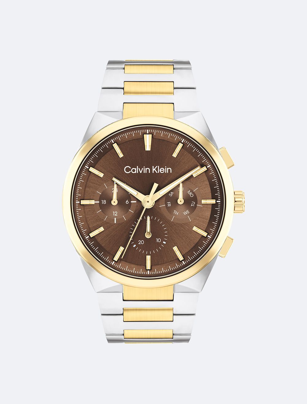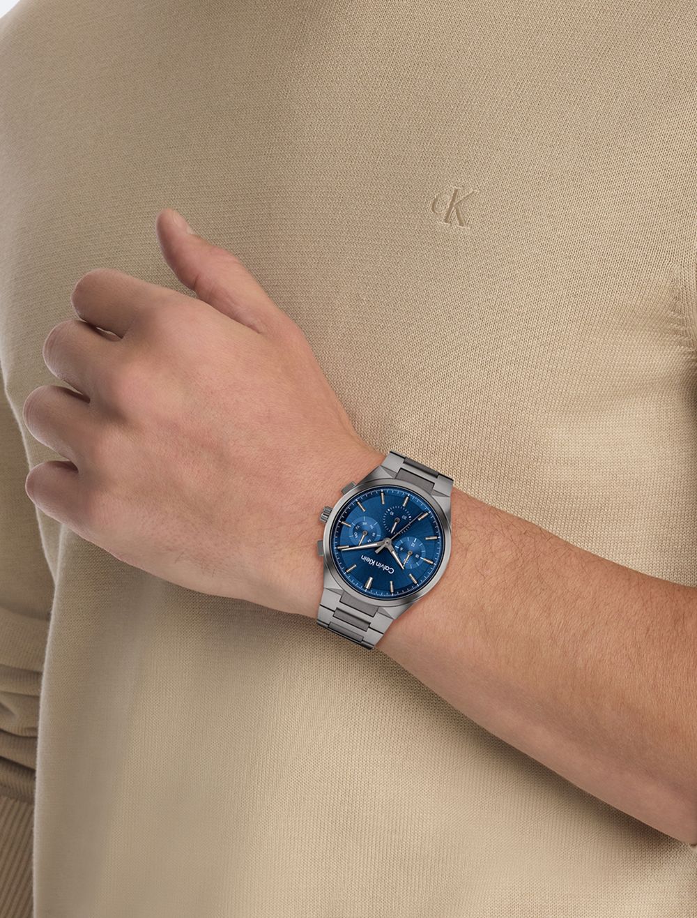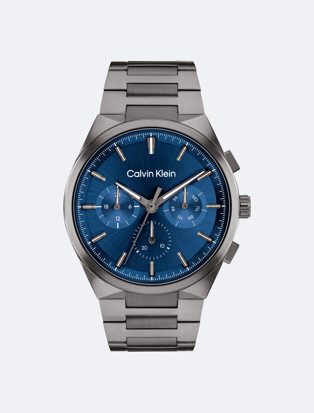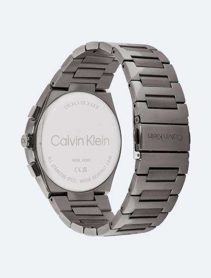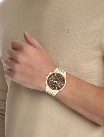 This elevated timepiece features an architecturally inspired case with subtle angularity and a slight curve built into the lugs, complemented by elongated pushers. The sunray dial and minute track highlight an energetic multi-function movement. Available on a dual finish H-link bracelet.- 44mm stainless steel, two-tone, grey IP, or gold-plated case