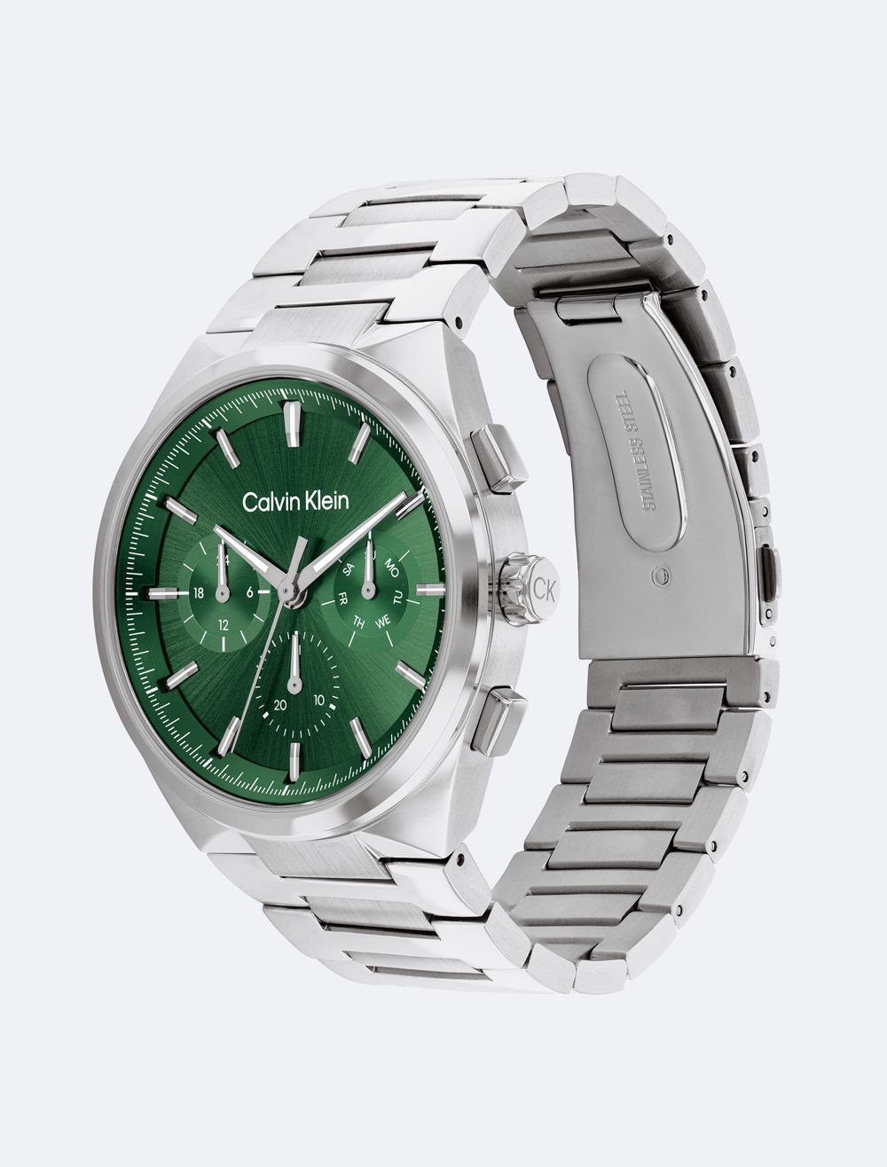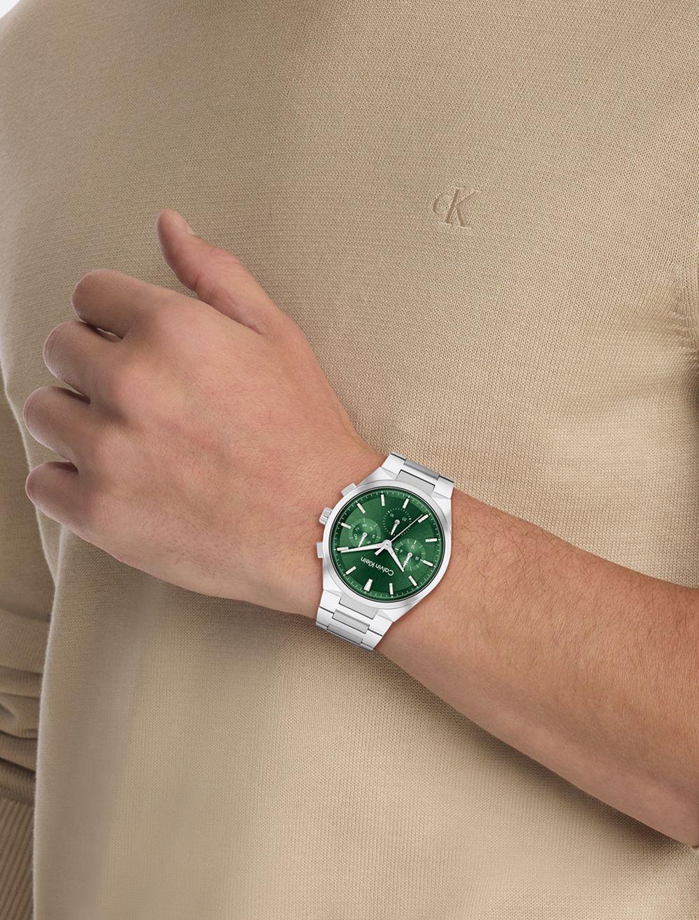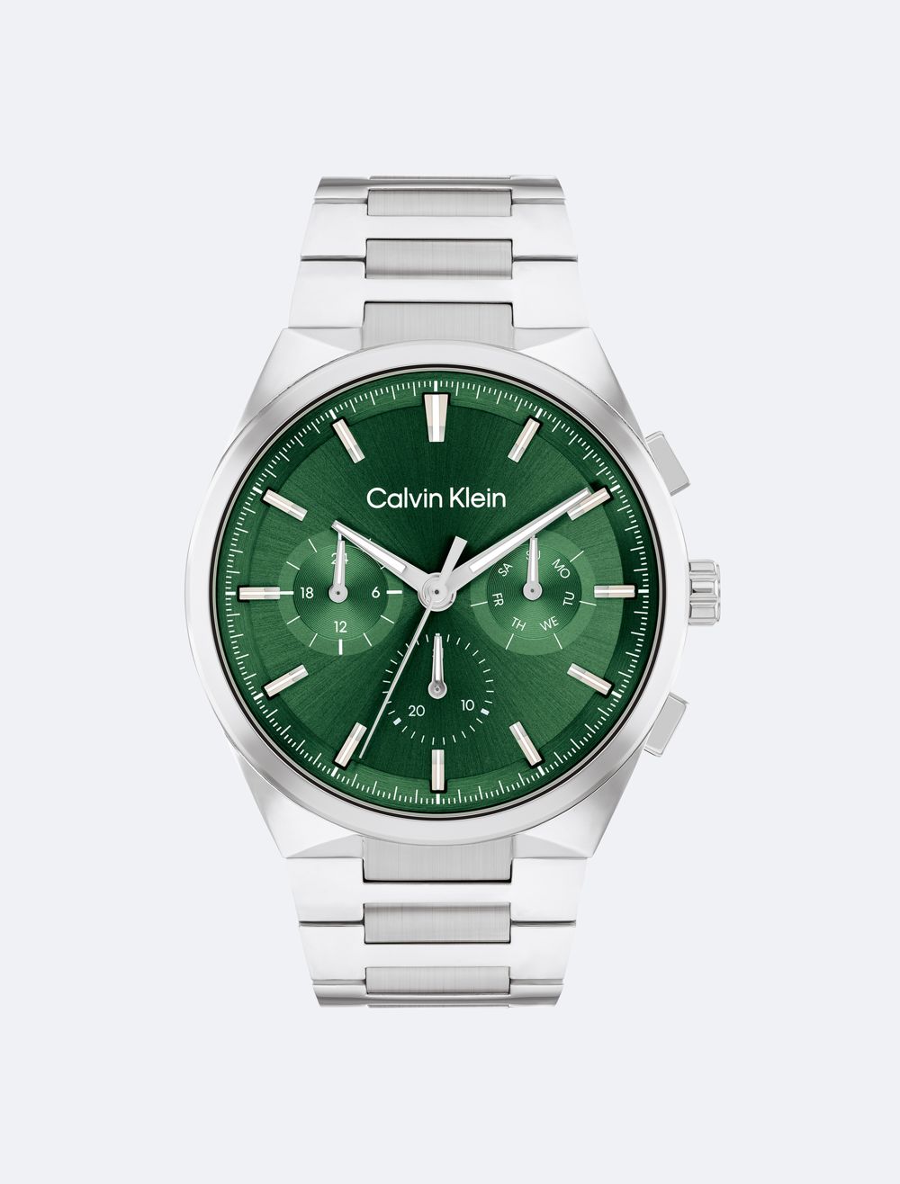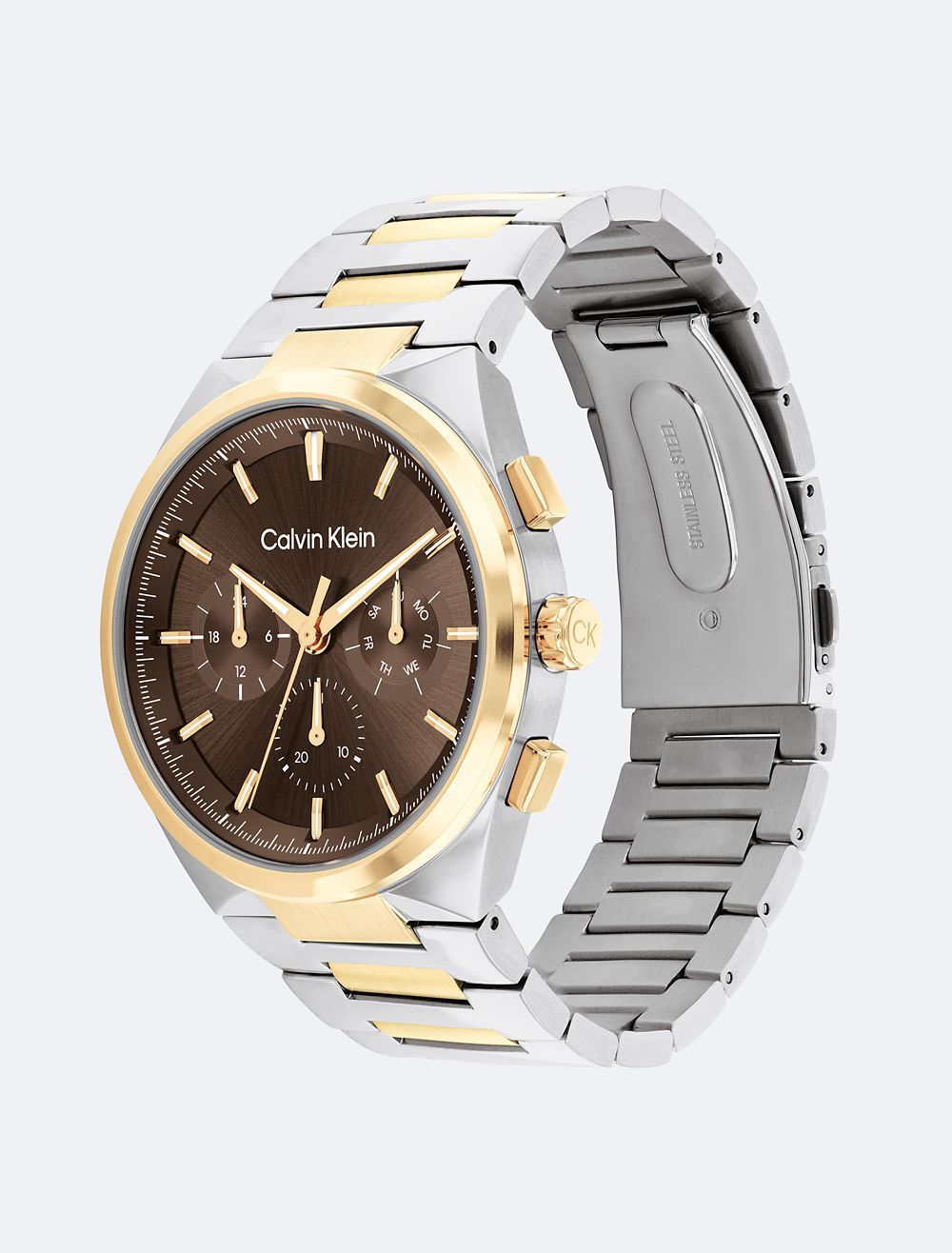 This elevated timepiece features an architecturally inspired case with subtle angularity and a slight curve built into the lugs, complemented by elongated pushers. The sunray dial and minute track highlight an energetic multi-function movement. Available on a dual finish H-link bracelet.- 44mm stainless steel, two-tone, grey IP, or gold-plated case