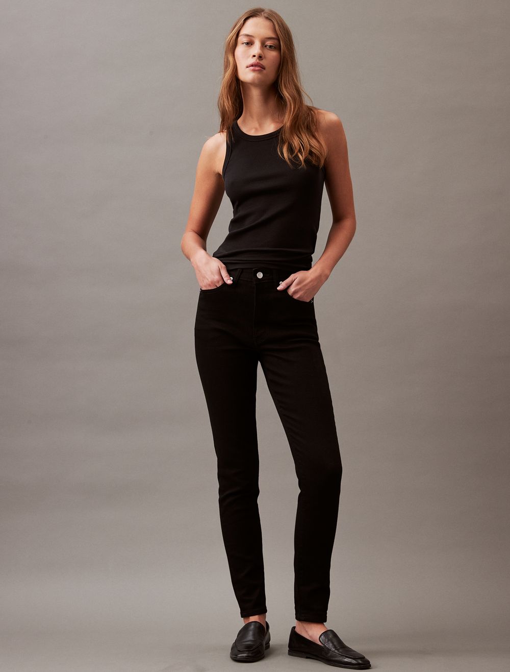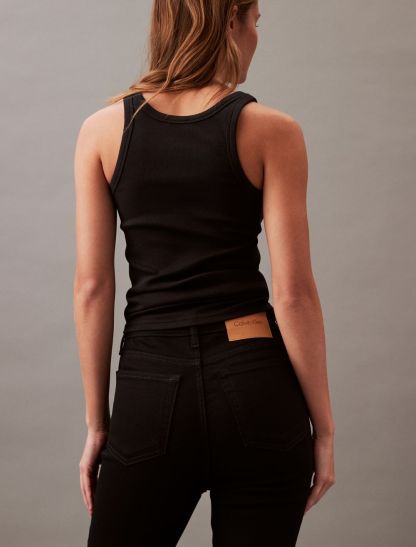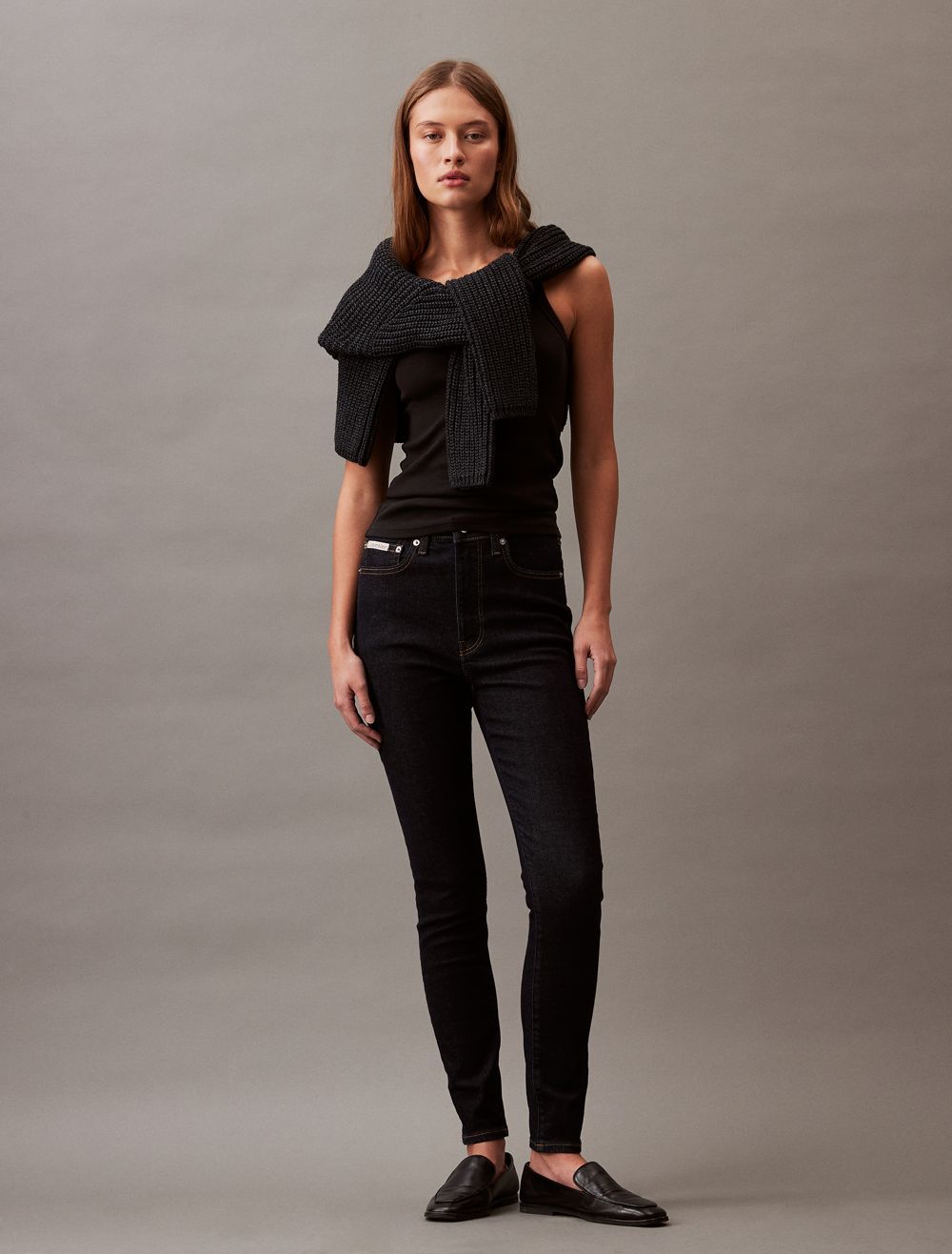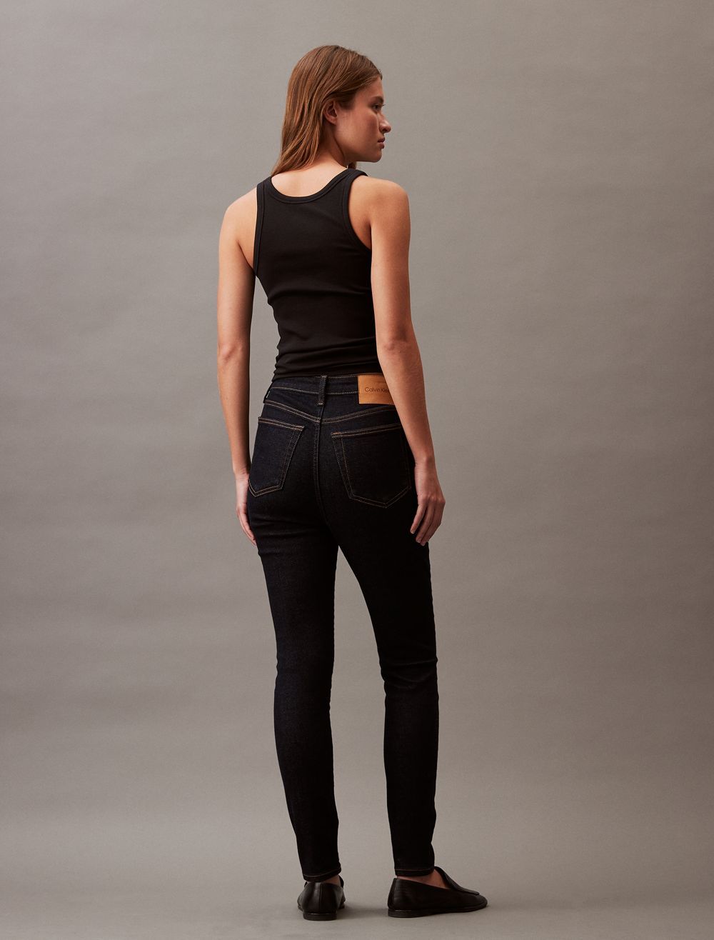 Styled in a skinny fit with a high rise waist, these jeans are made from a cotton stretch blend for easy, comfortable wear. Designed with a zip fly and a top button closure. Features classic 5-pocket styling and finished with a CK logo patch at the back waist.- High rise waist