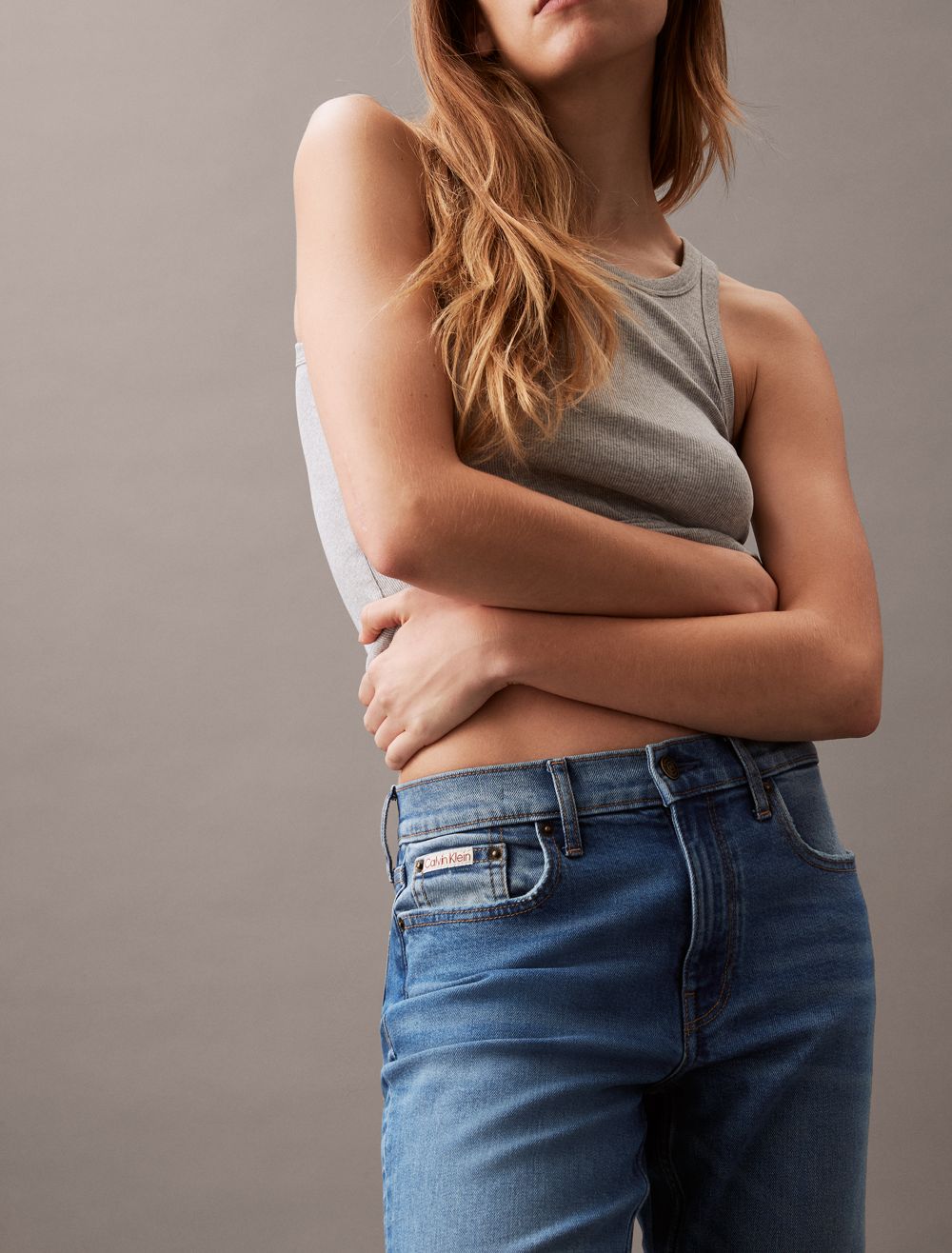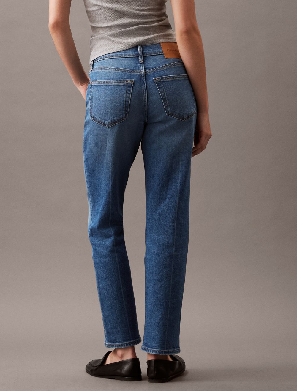 Styled in a straight leg silhouette with a mid rise waist, these jeans are made from a cotton stretch blend for easy, comfortable wear. Designed with a zip fly and a top button closure. Features classic 5-pocket styling and finished with a CK logo patch at the back waist.- Extra soft cotton stretch denim for a flexible feel and all-day comfort