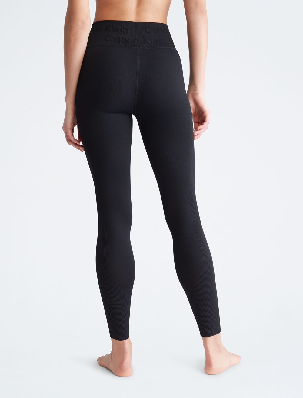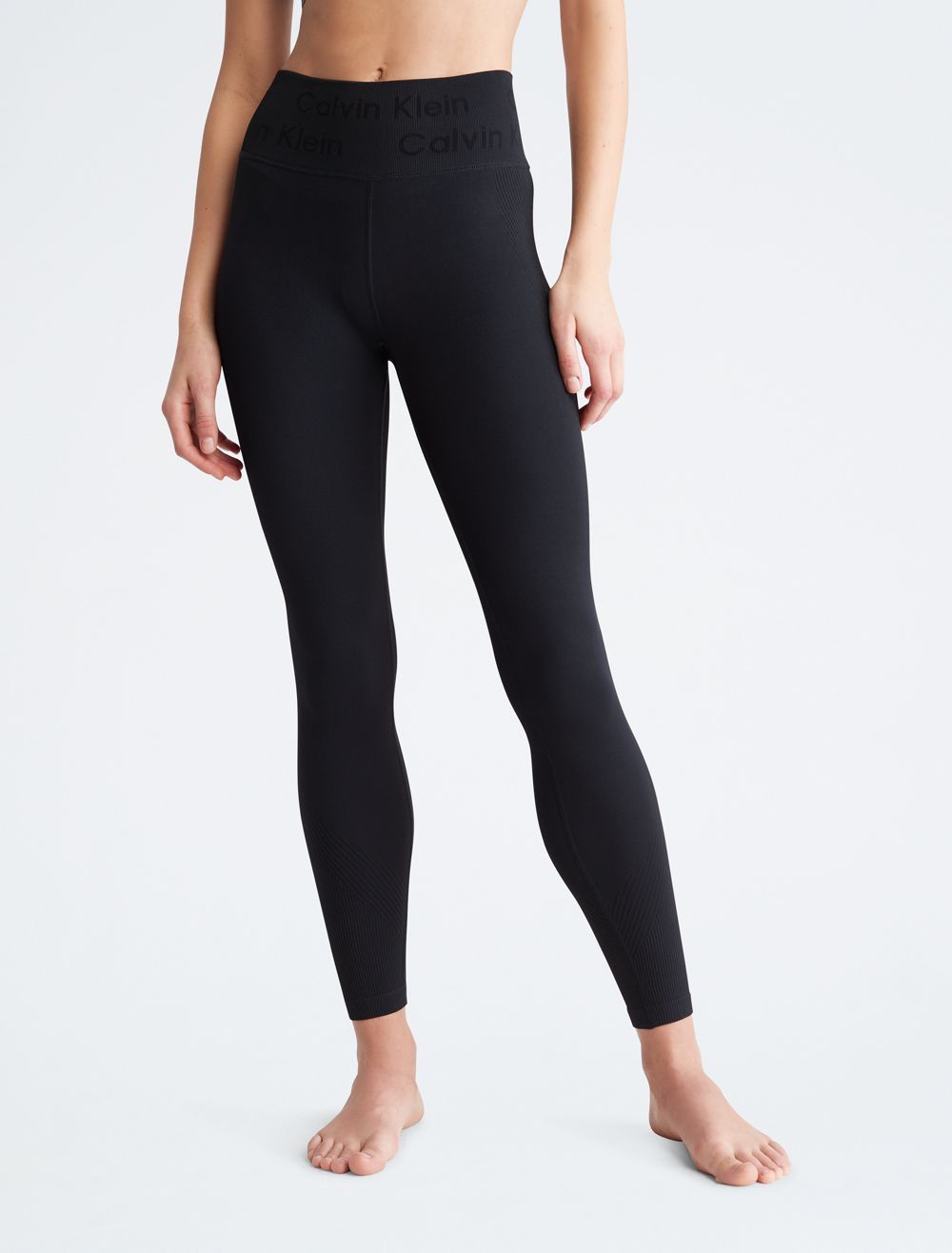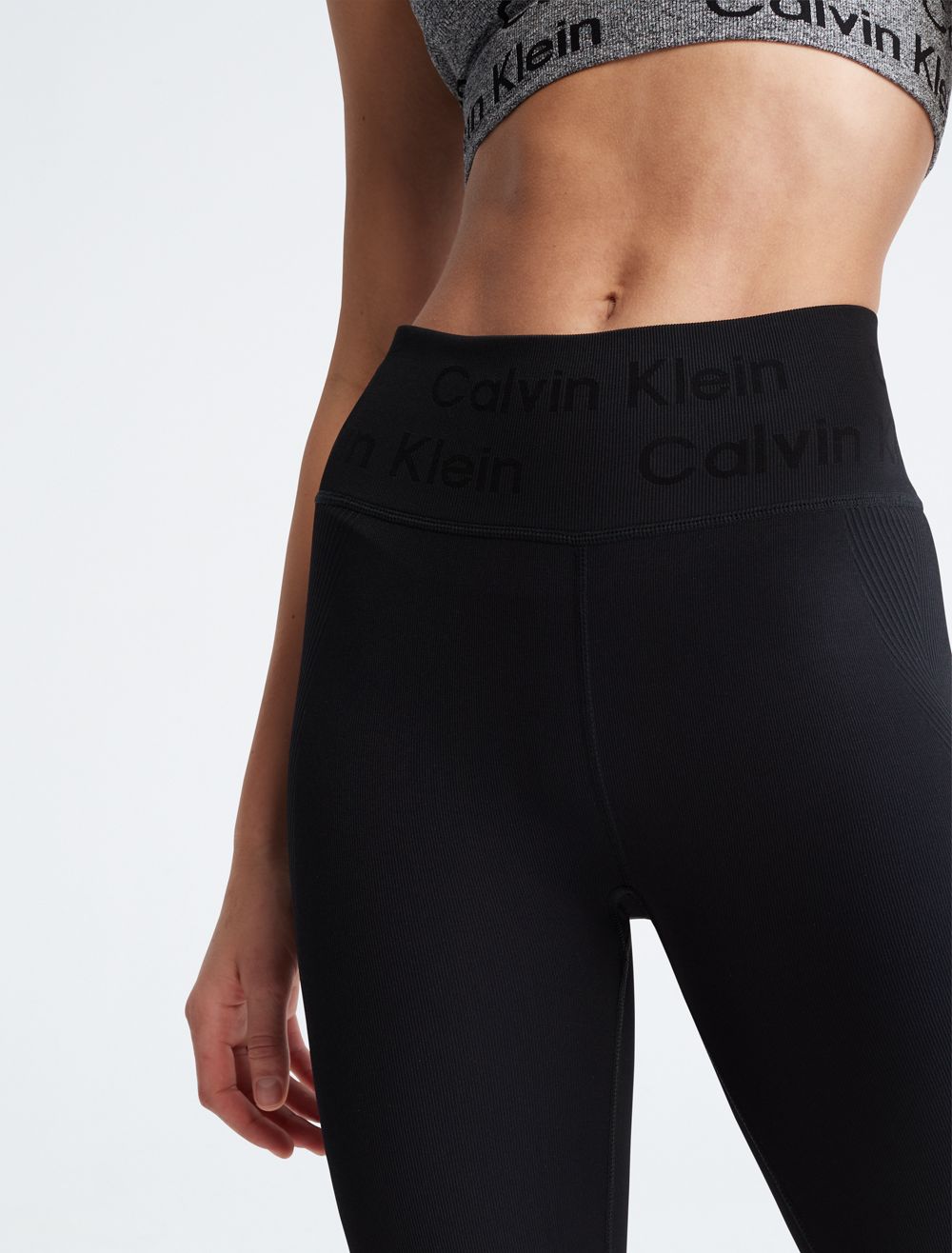 Cut with a high rise waist, these performance-ready leggings feature a ribbed texture throughout with sheer styling. Made with a form-fitting silhouette for limitless movement. Detailed with CK logo styling at the waist.- High rise waist