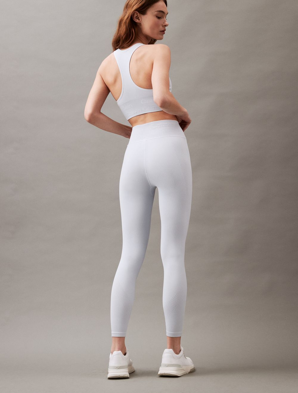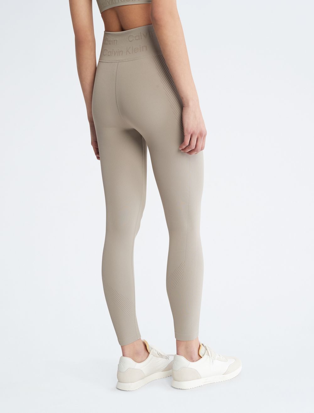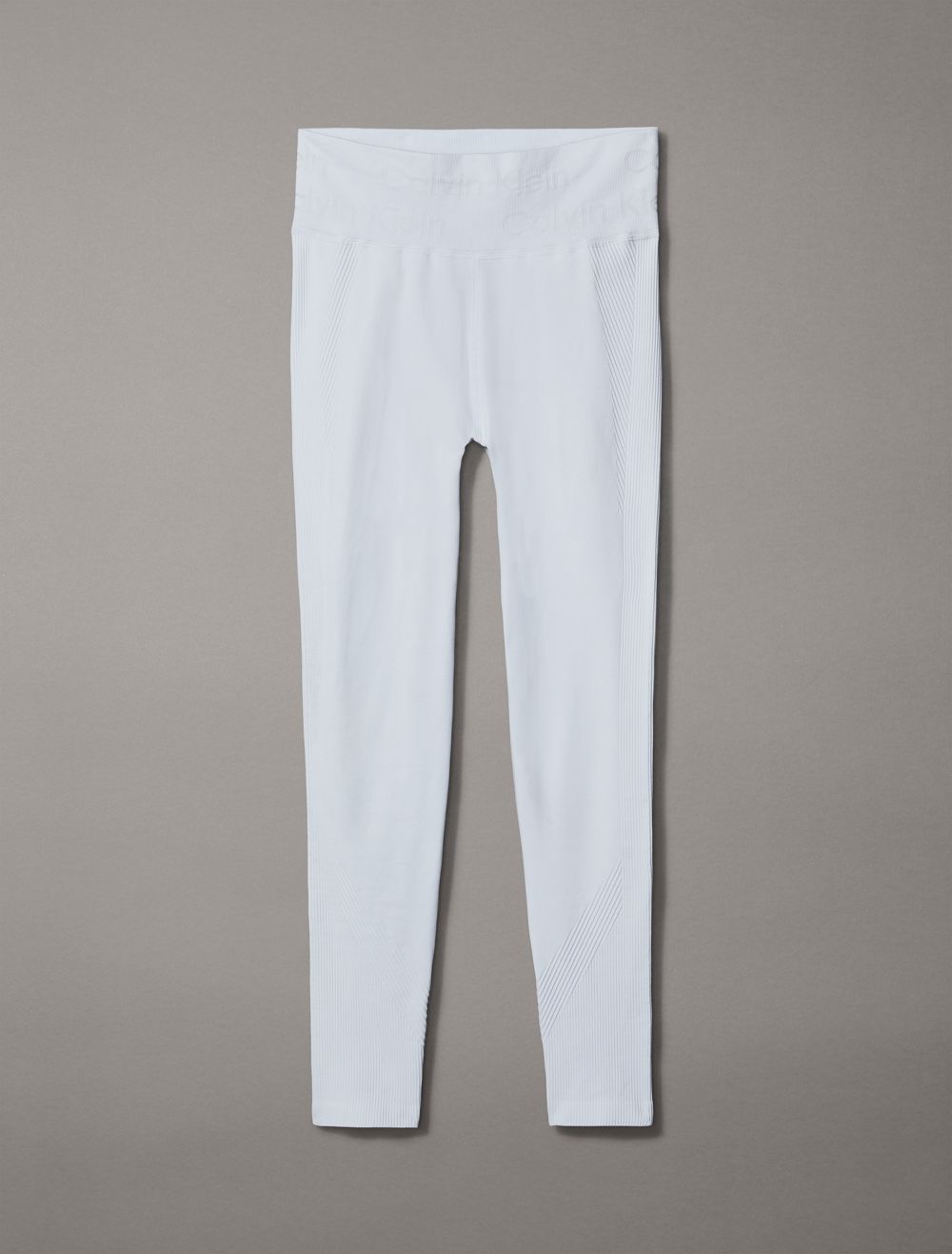 Cut with a high rise waist, these performance-ready leggings feature a ribbed texture throughout with sheer styling. Made with a form-fitting silhouette for limitless movement. Detailed with CK logo styling at the waist.- High rise waist