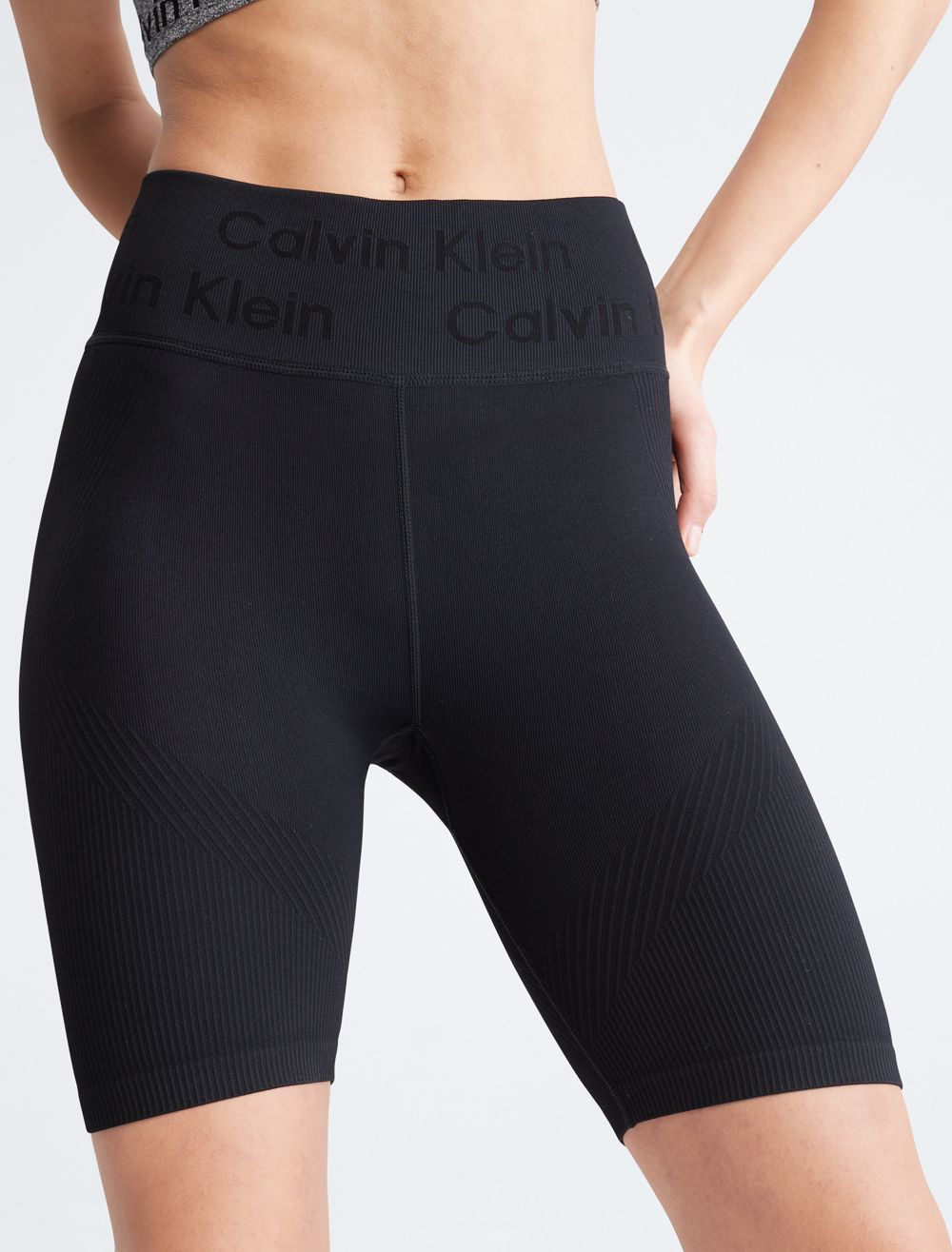 Made with a form fitting silhouette, this bike short is designed to move with you. Features a ribbed texture throughout and styled with a high rise waist. Finished with CK logo detailing at the waist.- High rise waist