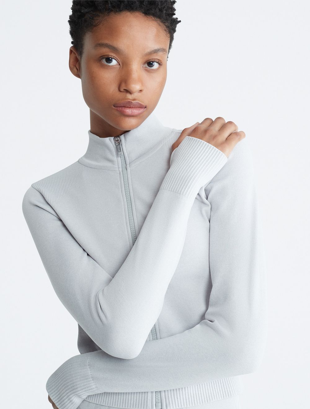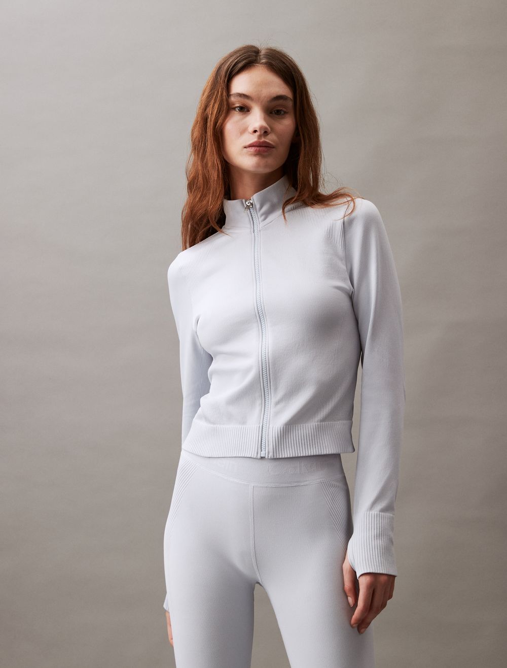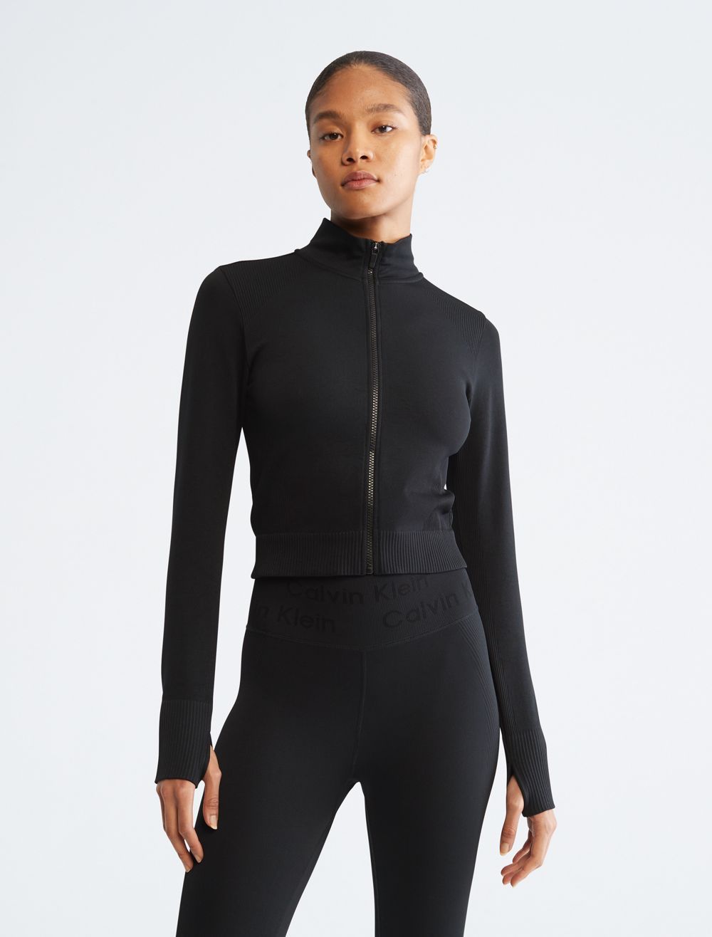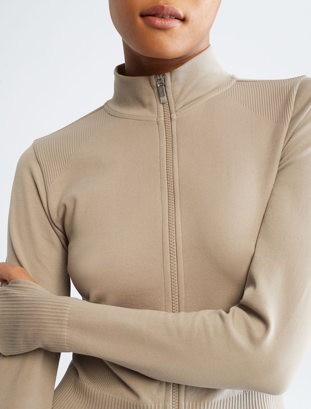 A performance-ready piece, this jacket features a form-fitting silhouette designed with subtle ribbed detailing. Made with long sleeves and a mock neck. Cut in a cropped length and fitted with a zip closure at the front.- Long sleeves