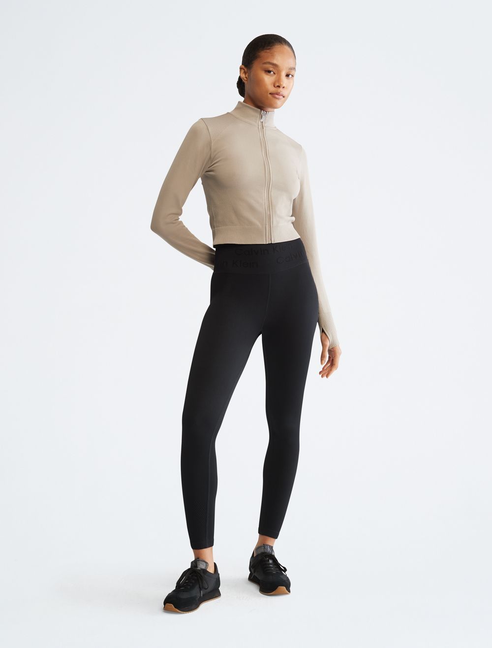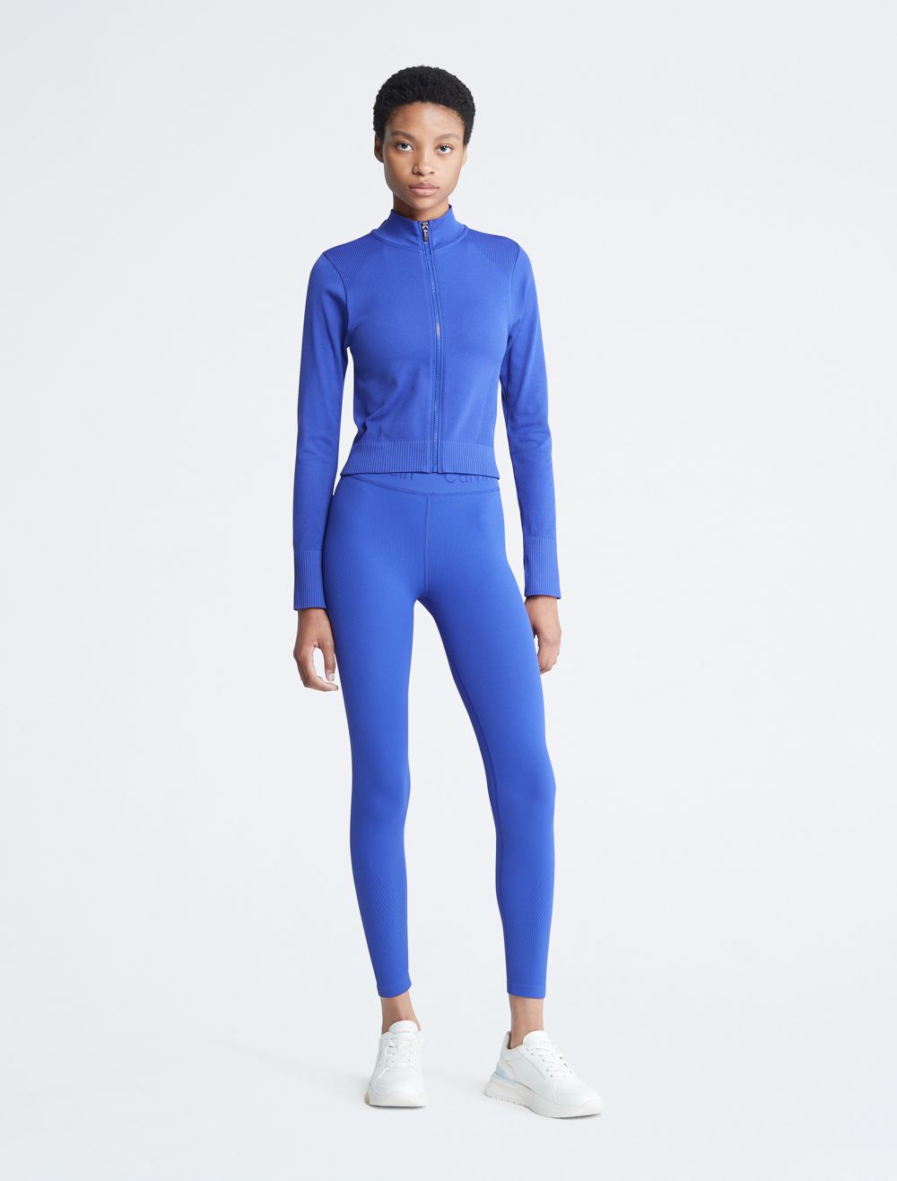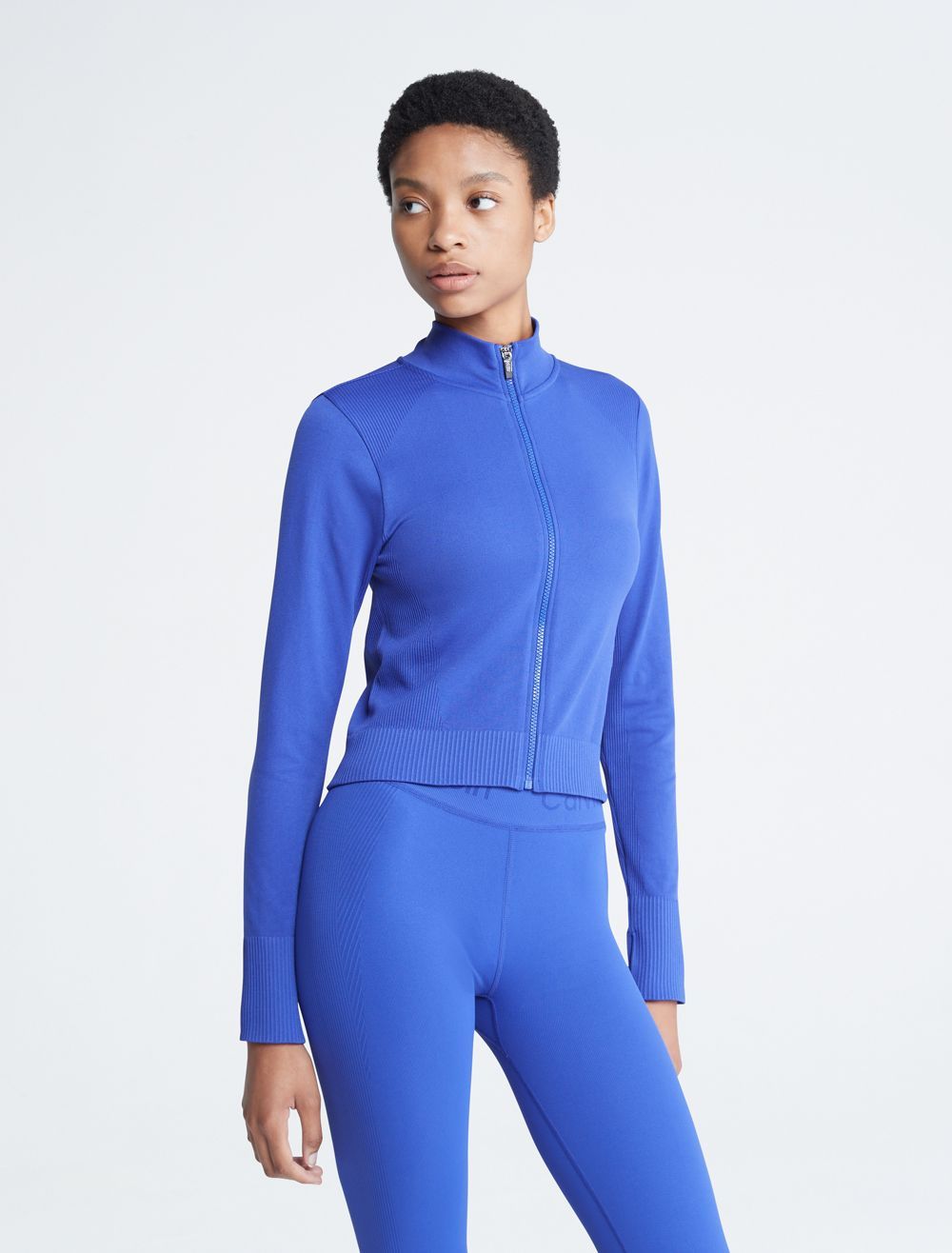 A performance-ready piece, this jacket features a form-fitting silhouette designed with subtle ribbed detailing. Made with long sleeves and a mock neck. Cut in a cropped length and fitted with a zip closure at the front.- Long sleeves