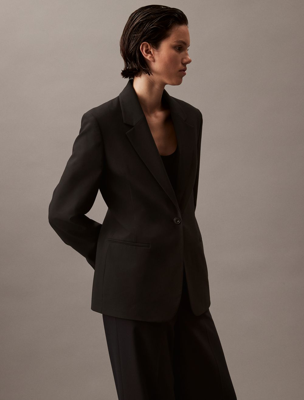 A tailored piece with a structured silhouette, this blazer is perfect for elevated, professional wear. Detailed with crisp notch lapels and made with a single button closure. Finished with seaming details along the sleeves and back.- Long sleeves + notch lapels